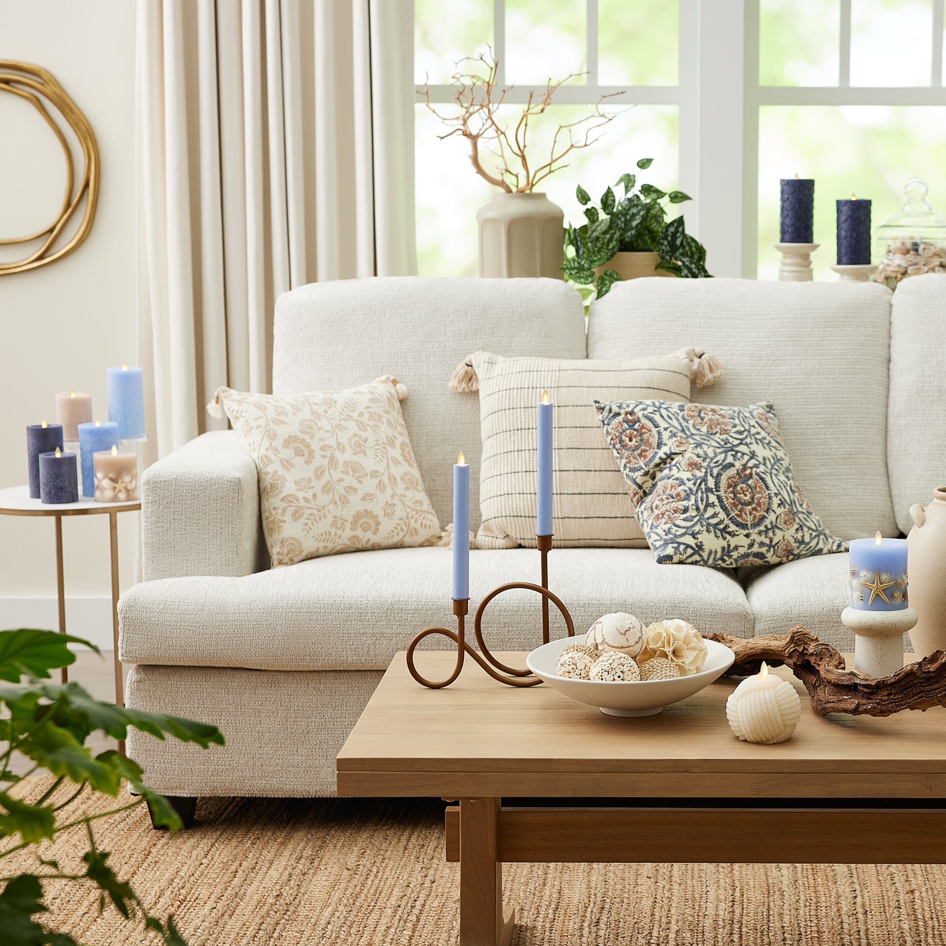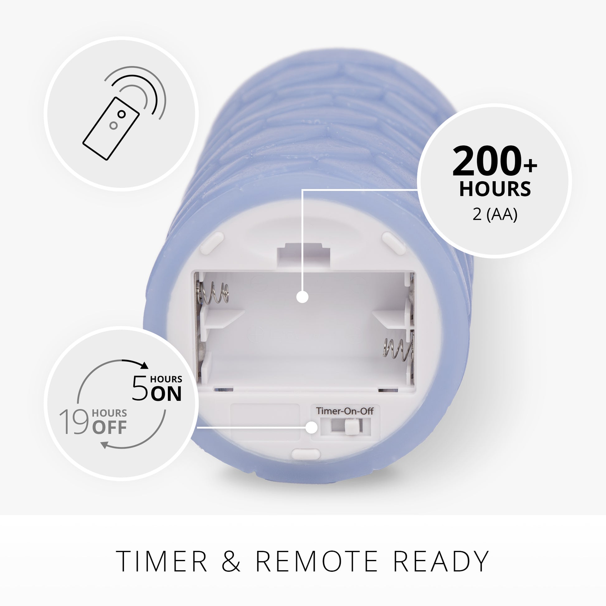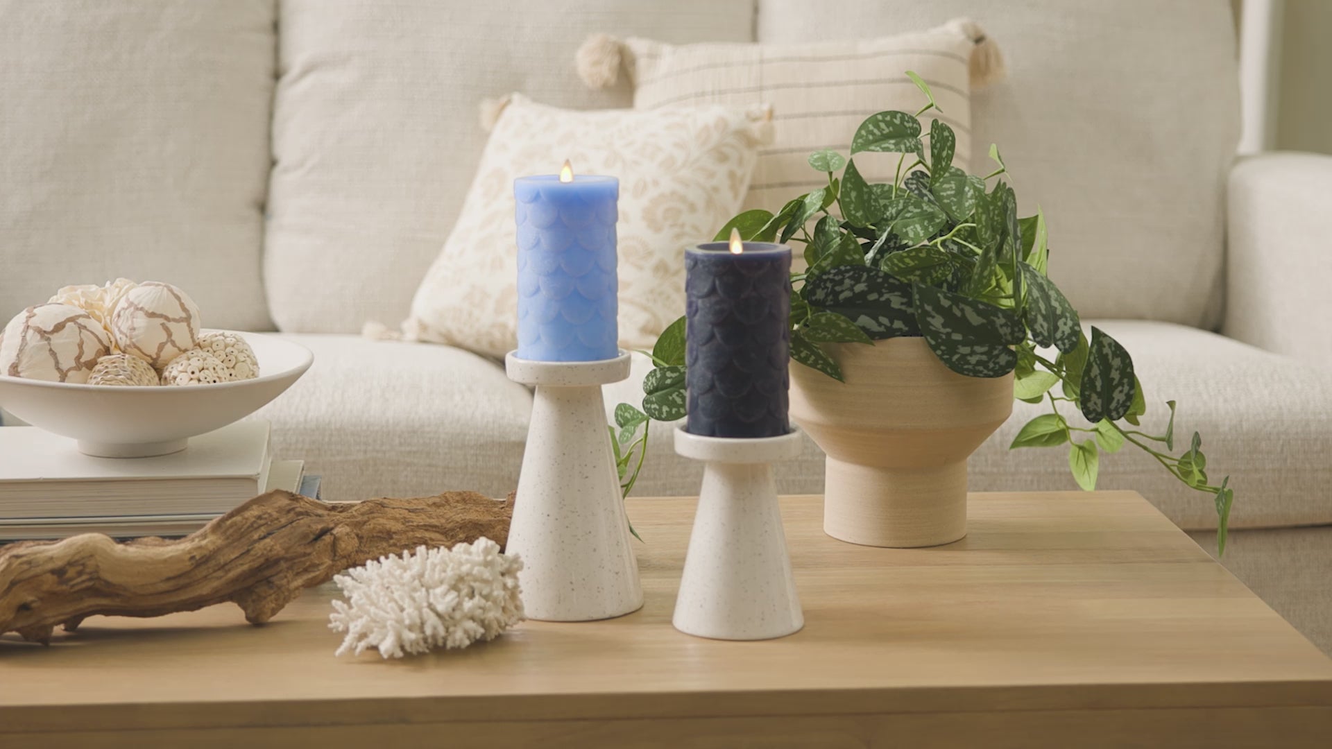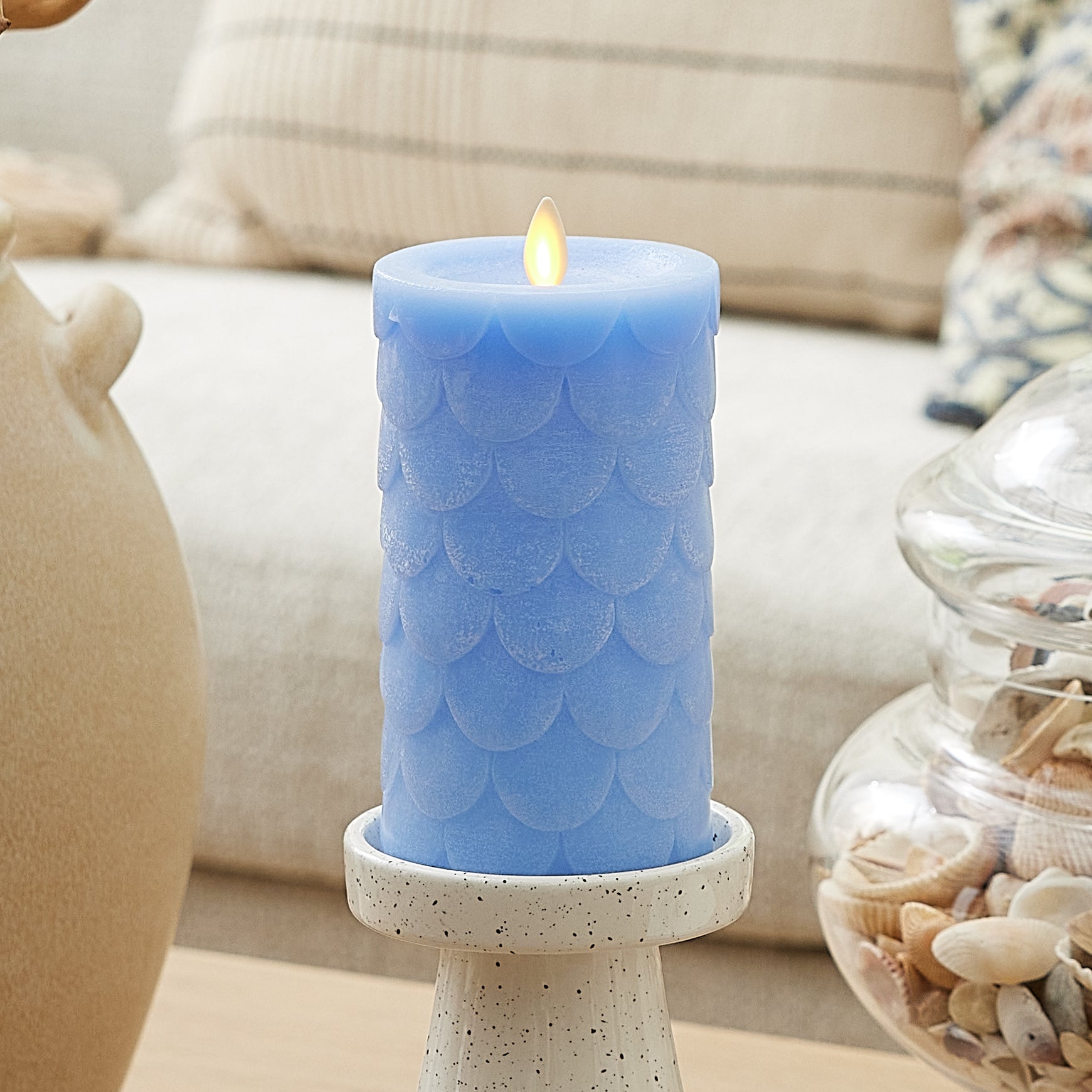 Add an aquatic and elegant touch to your home with the embossed fish scale flameless candle pillar. Equipped with safe and convenient patented moving-flame technology, this pillar is adorned with a fish scale relief pattern and finished with a chalky texture in a crisp and cool cornflower blue color. Complete your nautical-themed aesthetic by pairing these pillars with a Luminara rope ball flameless candle or arrange with Luminara seaglass pillars of varying sizes.