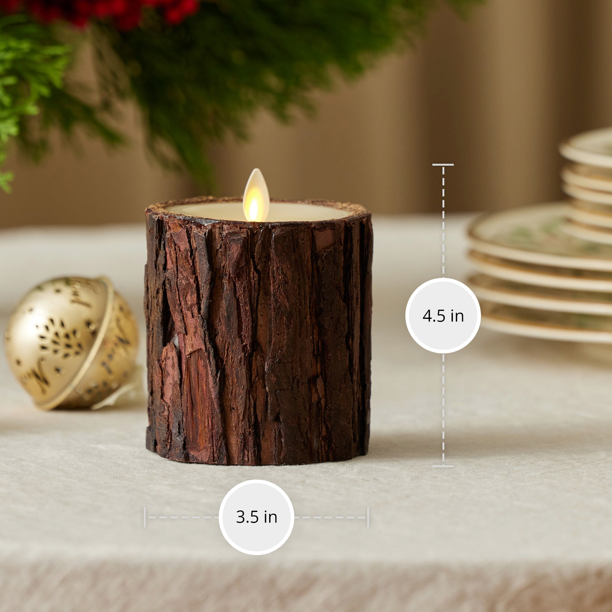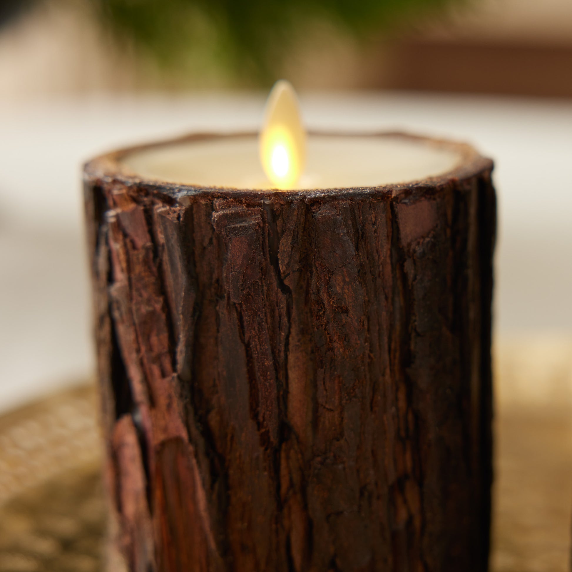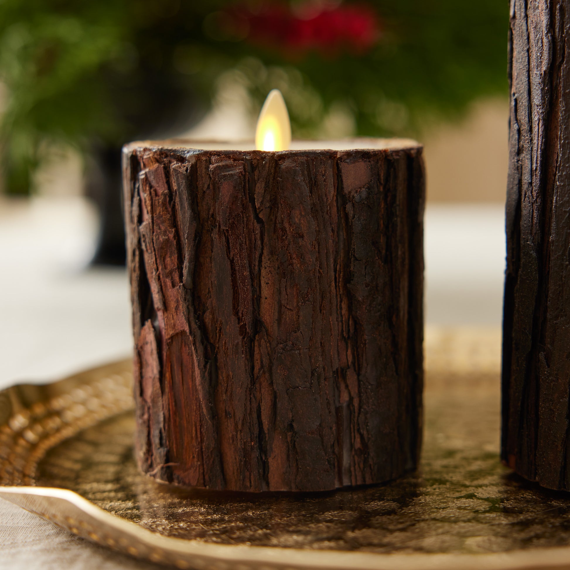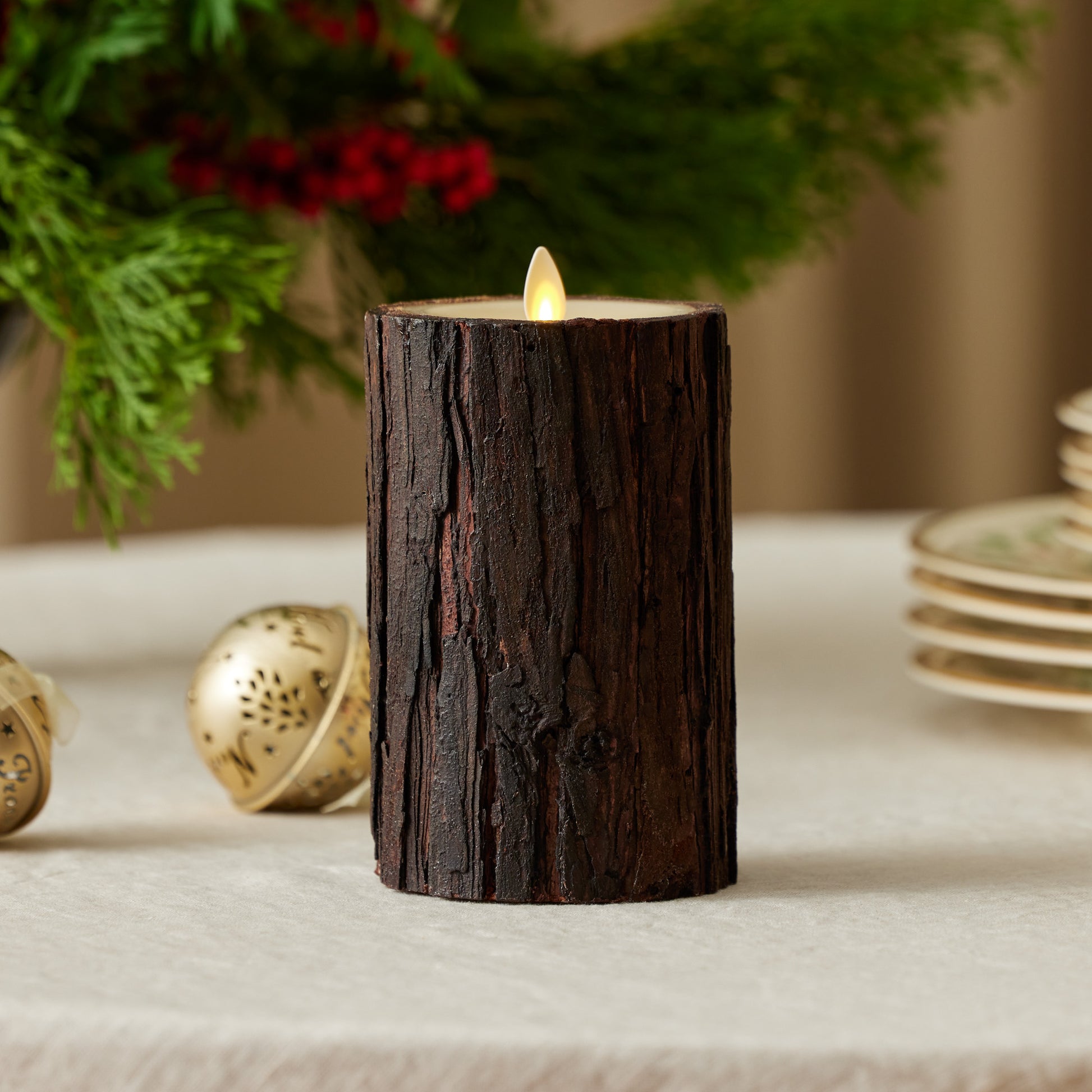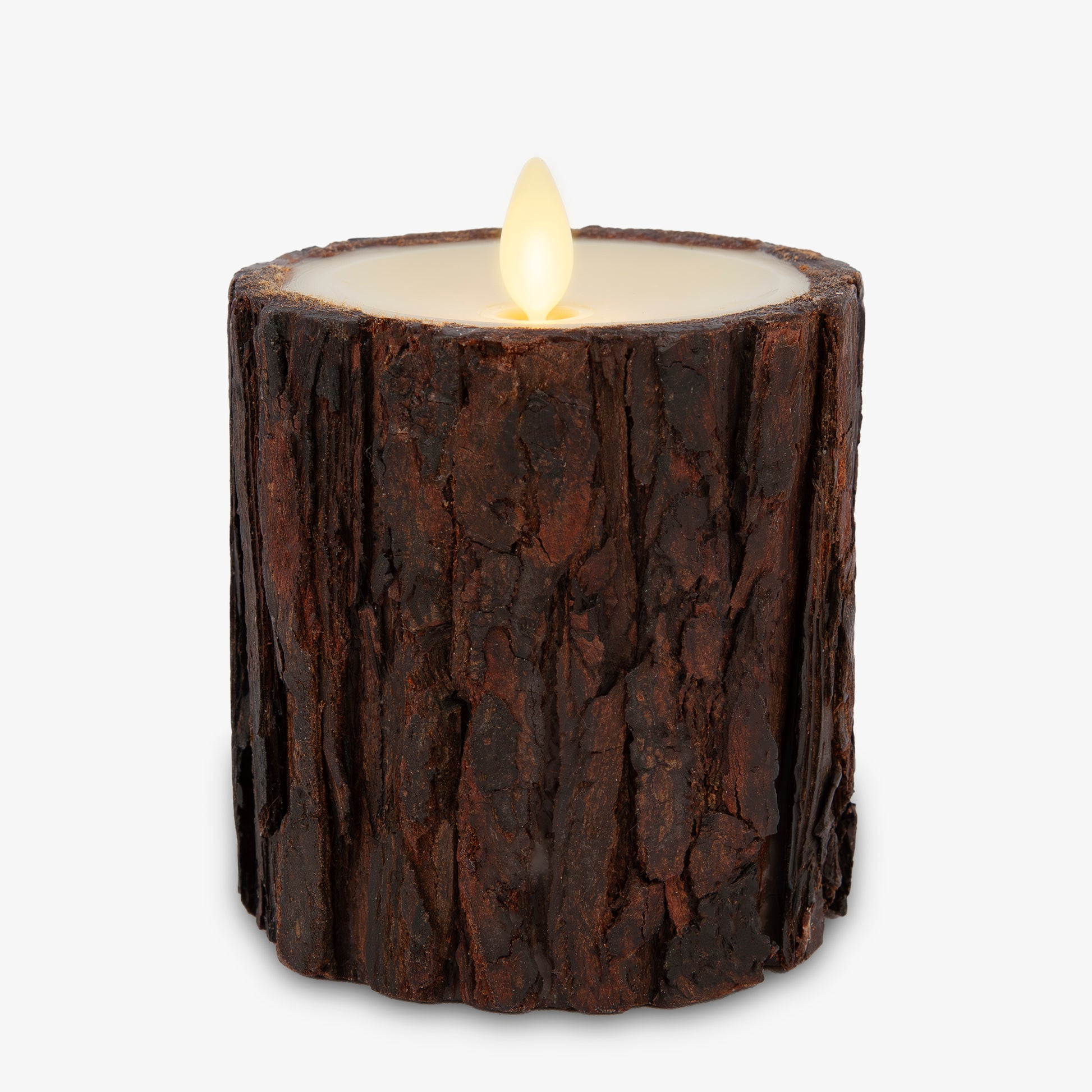 Lined with real wood and equipped with the warm glow of moving-flame technology, our Real Wood Bark Pillar evokes the warm sensations of a cozy, crackling log fire. Each pillar looks rustically elegant with a real wood finish that adds a natural winter touch to holiday decorating. Available in two sizes, each pillar is as unique as the bark used in its construction. The Real Wood Bark pillars look exceptionally festive when paired with other Luminara products, such as the Snowflake Tealights or Holiday Red Chalky Santa.Technical Specifications