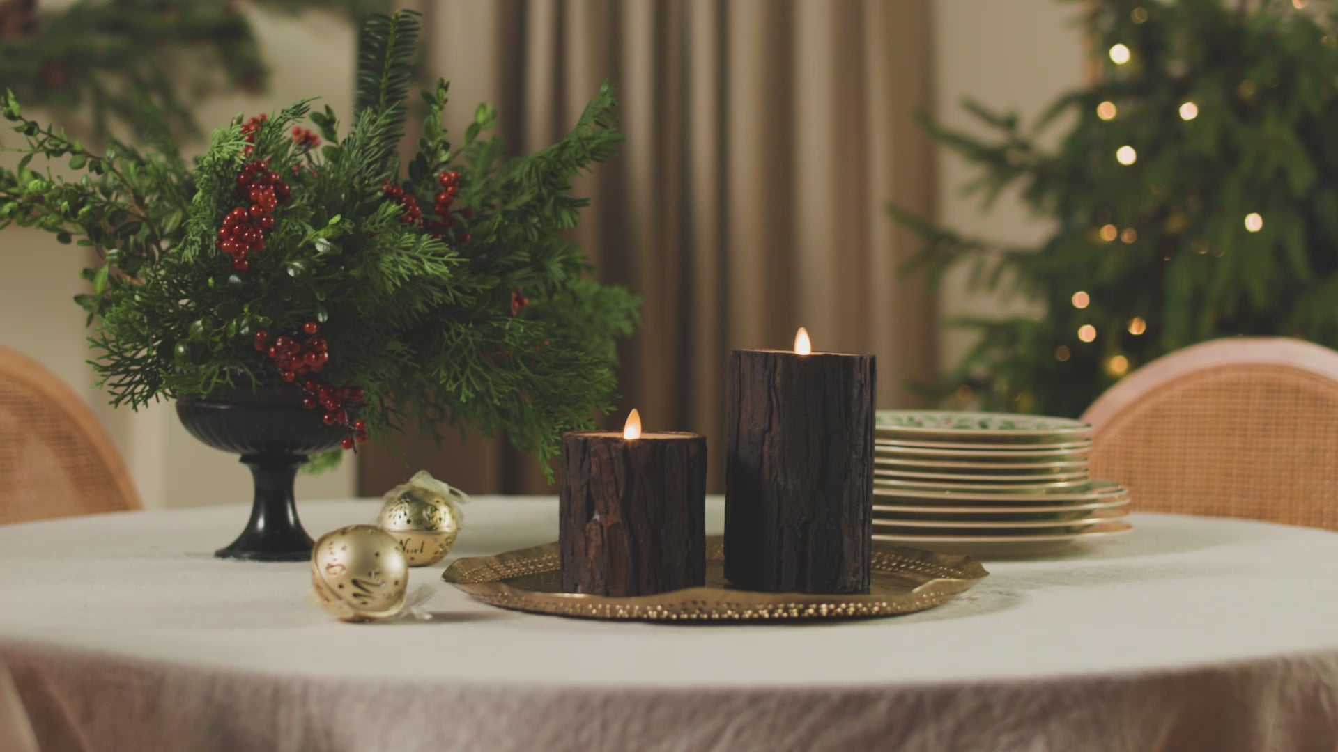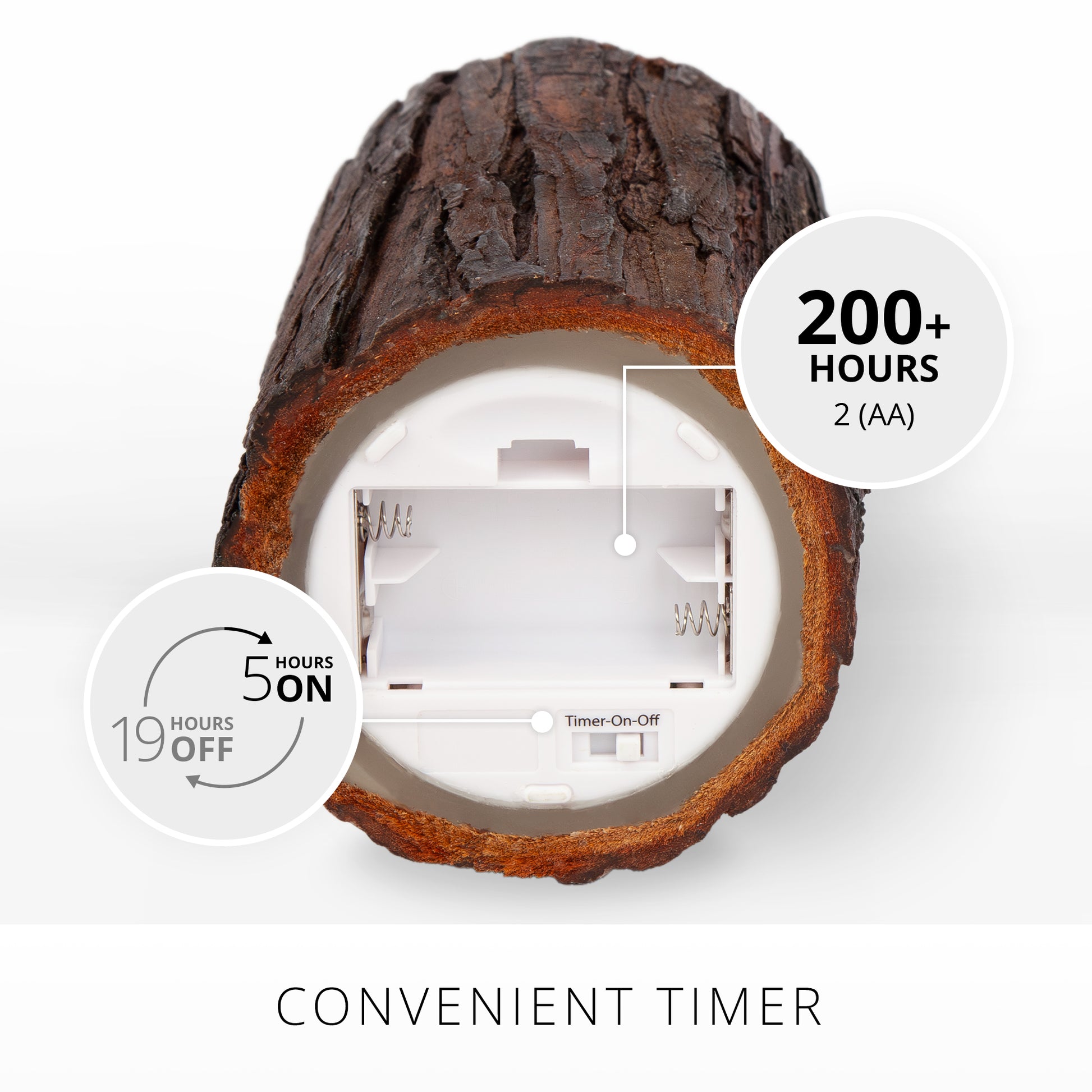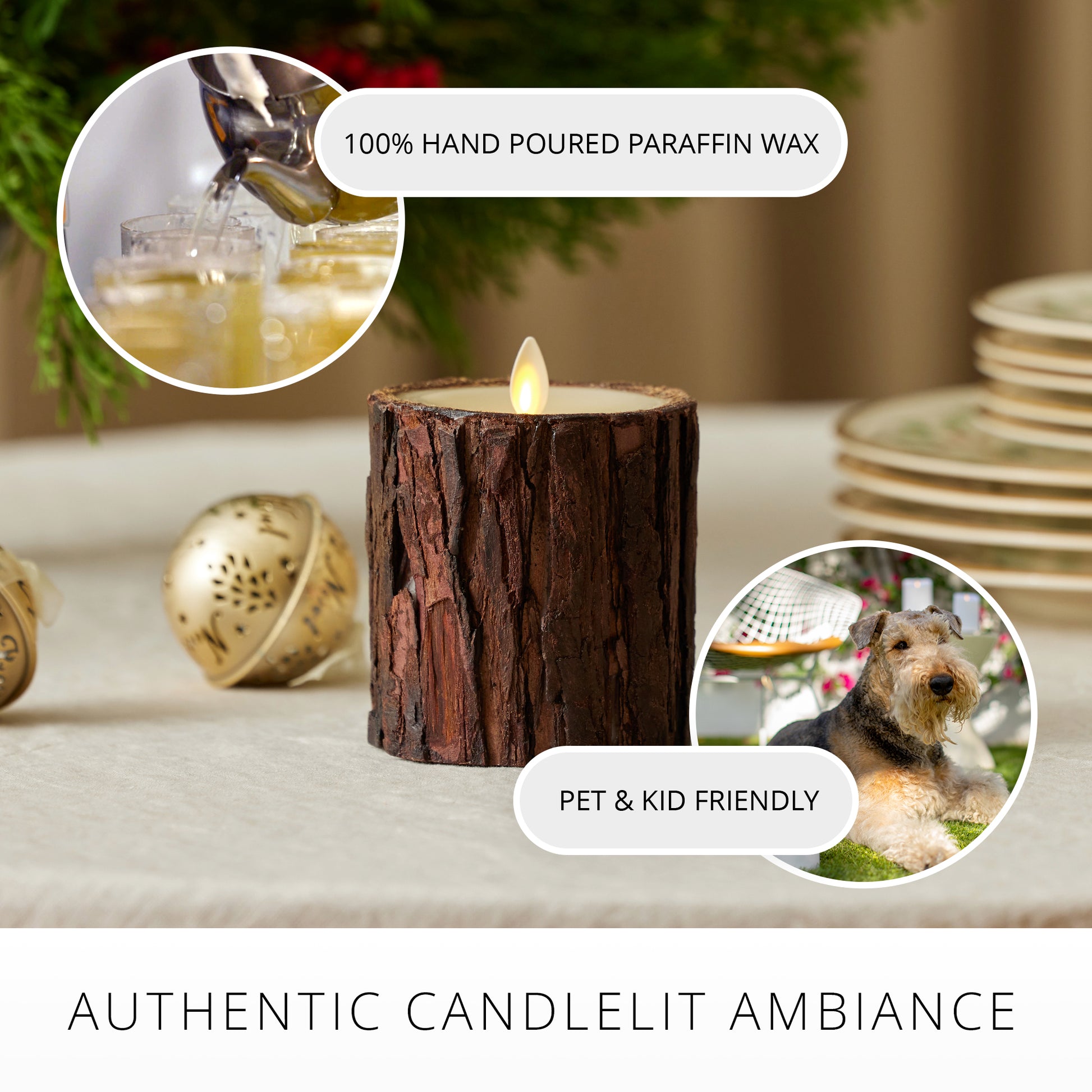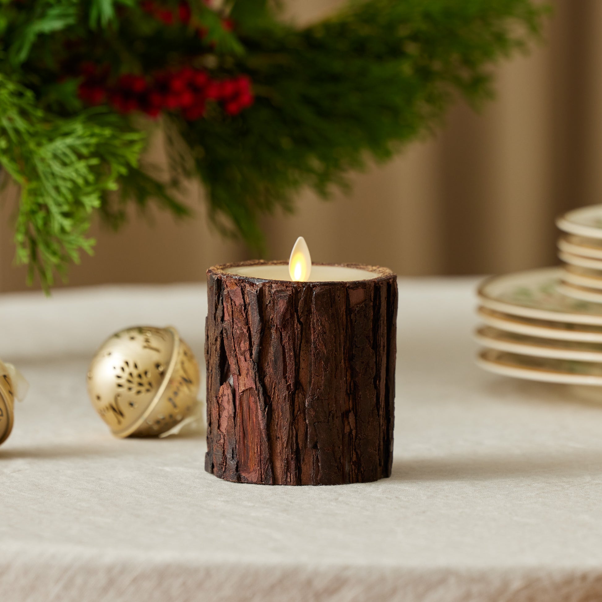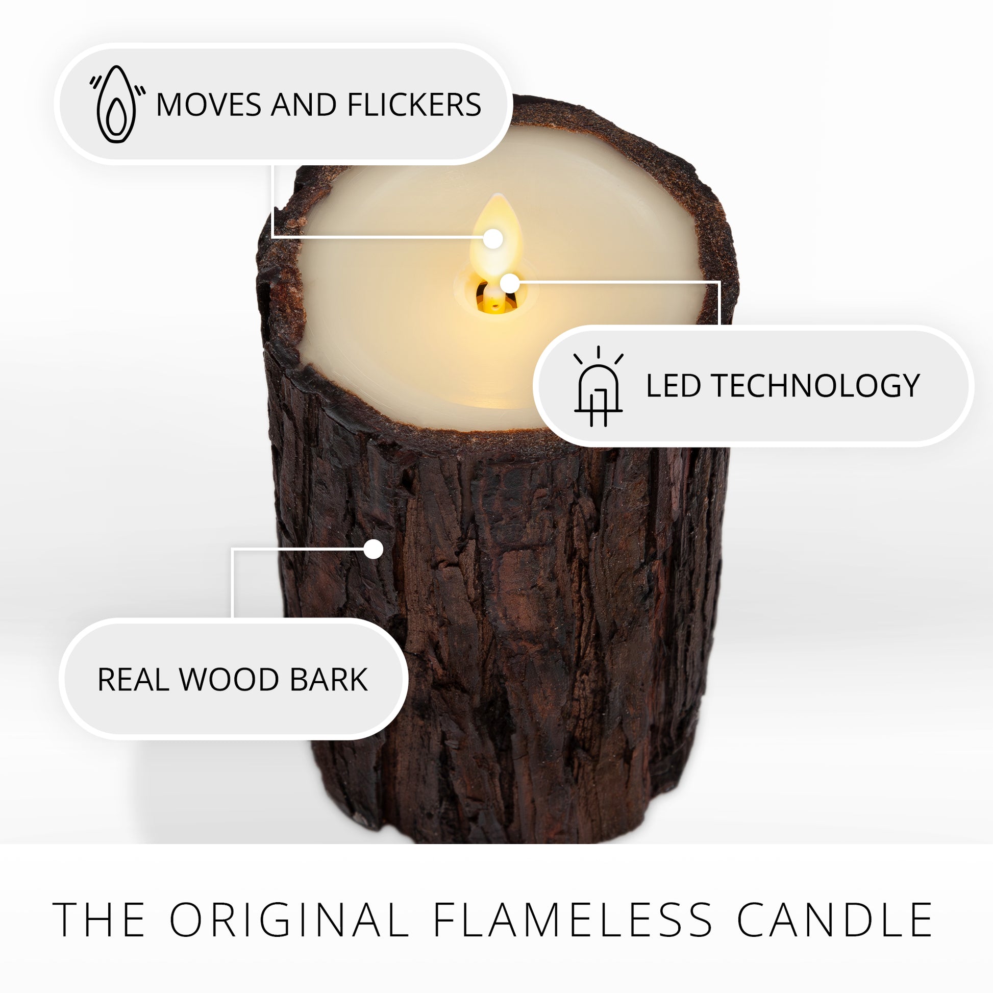 Lined with real wood and equipped with the warm glow of moving-flame technology, our Real Wood Bark Pillar evokes the warm sensations of a cozy, crackling log fire. Each pillar looks rustically elegant with a real wood finish that adds a natural winter touch to holiday decorating. Available in two sizes, each pillar is as unique as the bark used in its construction. The Real Wood Bark pillars look exceptionally festive when paired with other Luminara products, such as the Snowflake Tealights or Holiday Red Chalky Santa.Technical Specifications