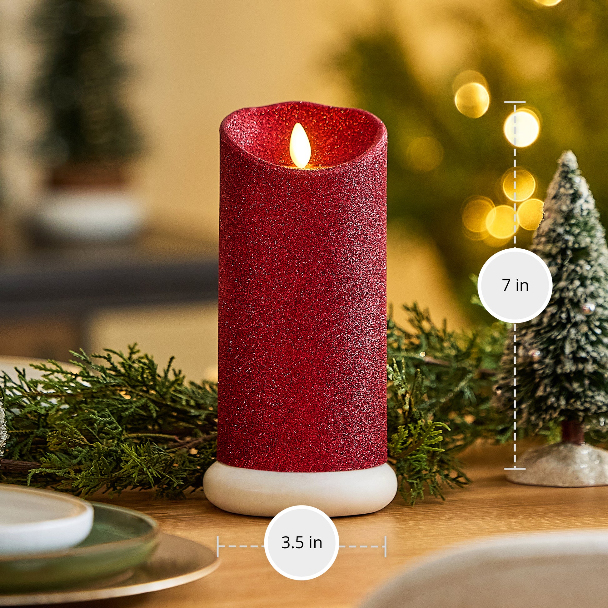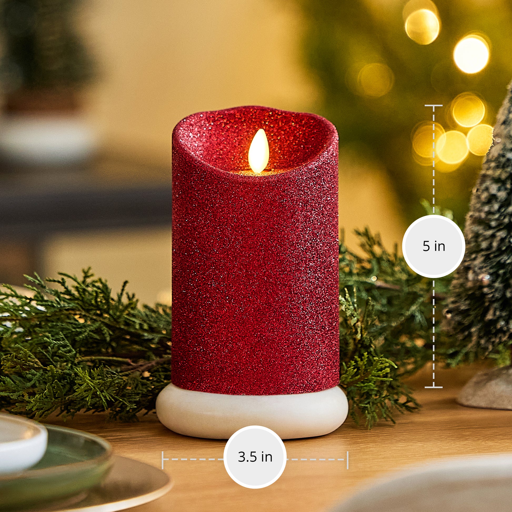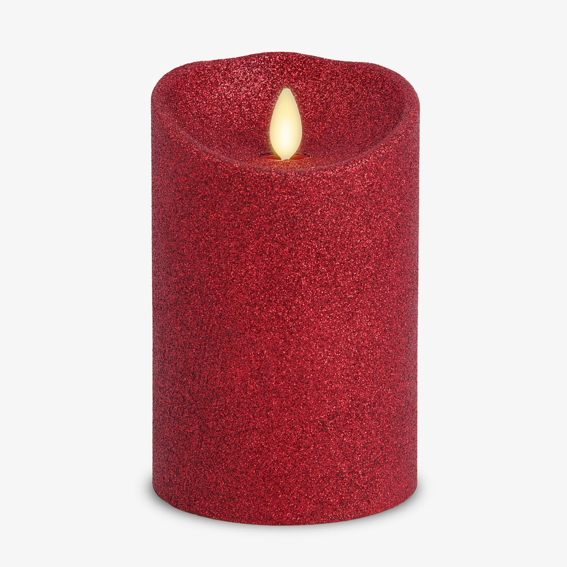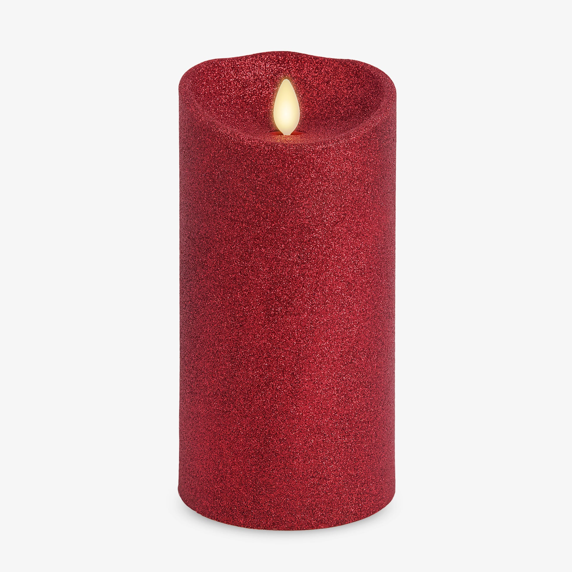 Our Holiday Red Glitter Scallop Pillar illuminates with a glistening shimmer underneath its authentic moving-flame technology. The pillar has a scallop top for added realism and a double-dipped glitter finish that will not rub off and helps amplify the candle’s luminous glow and shine. This pillar looks stunning on its own or when staggered with the Holiday Red Glitter Taper across coffee tables or on bookshelves for a pop of shimmering light.Technical Specifications