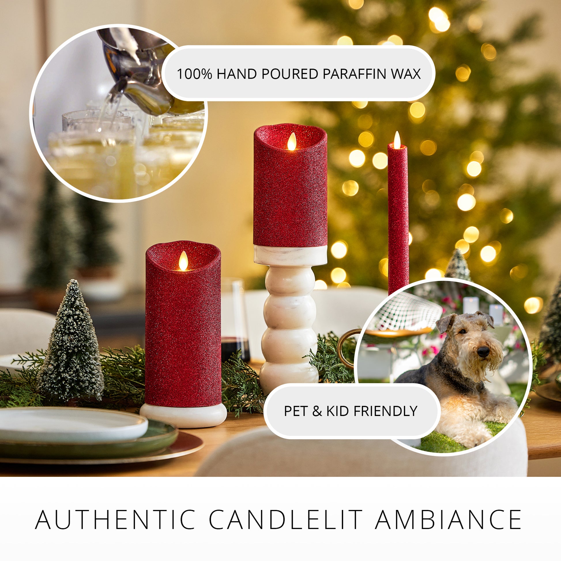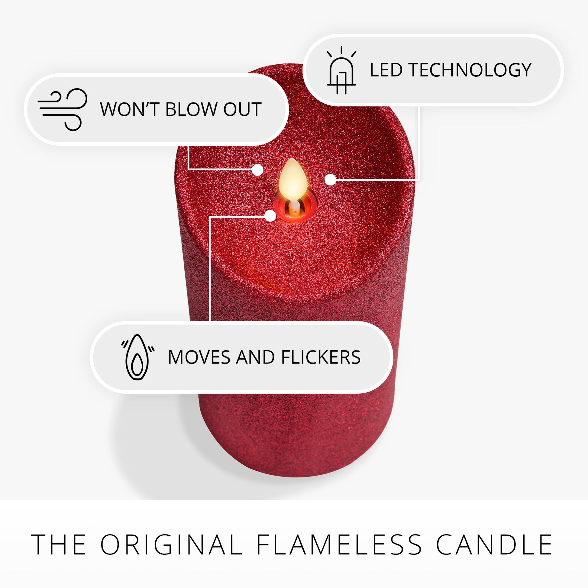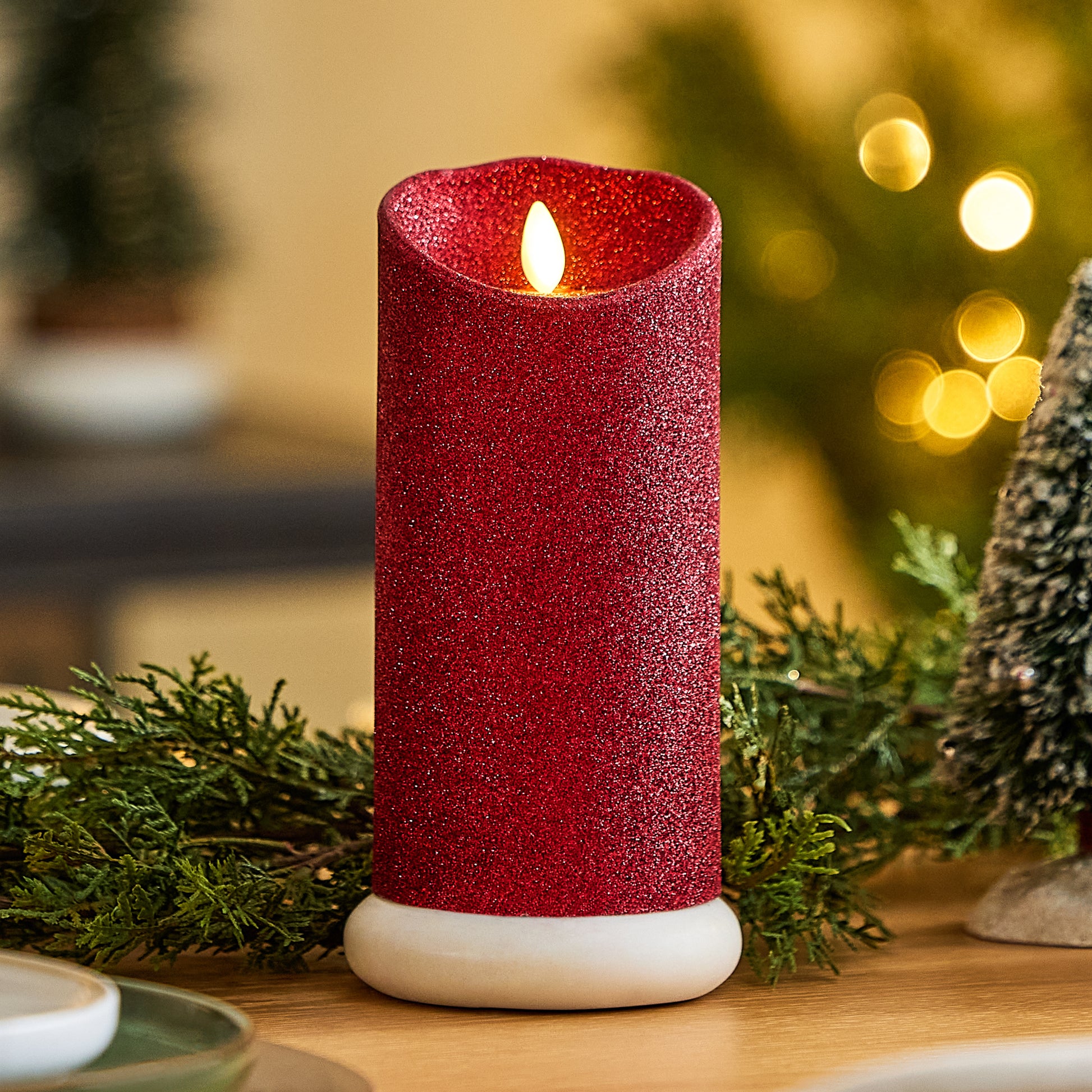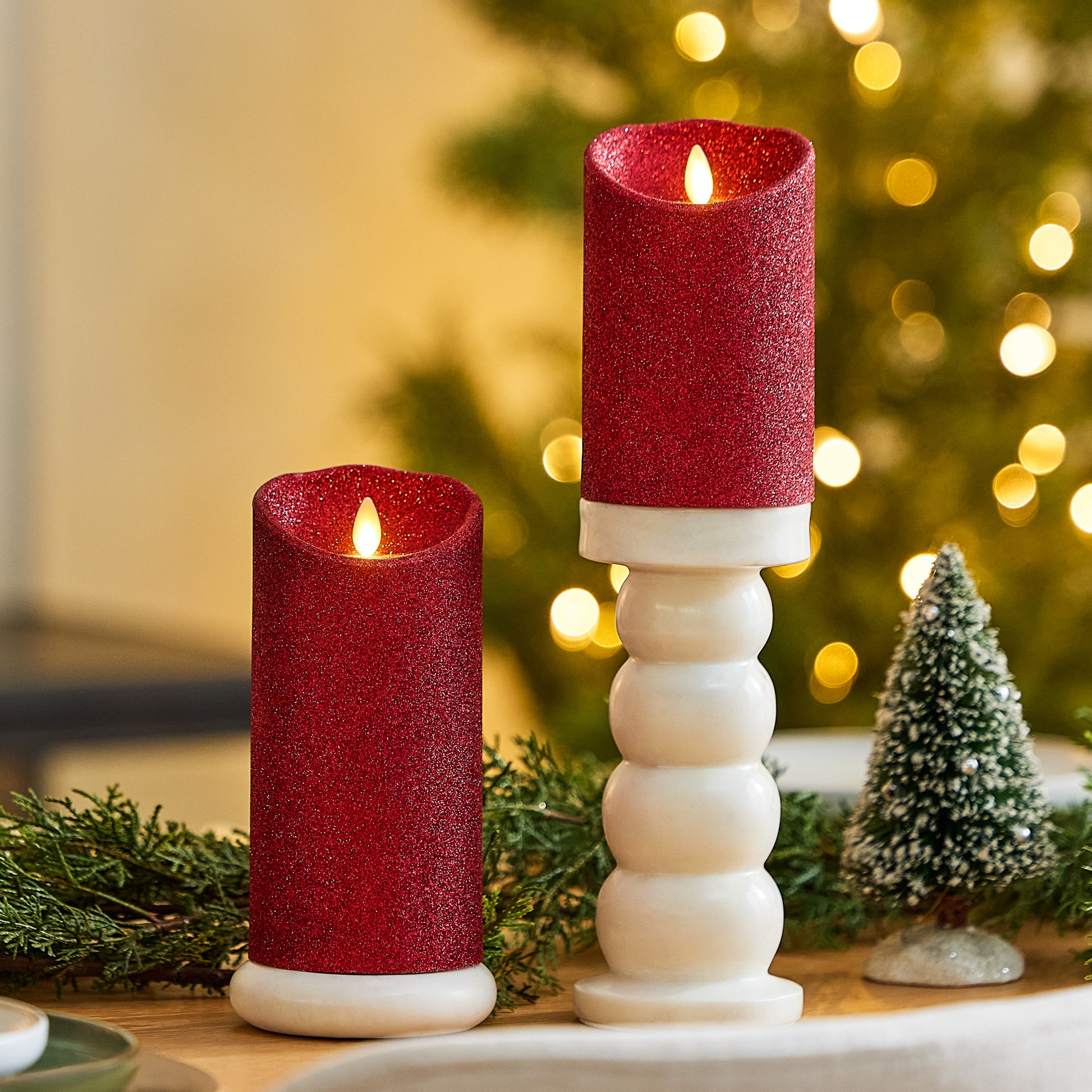 Our Holiday Red Glitter Scallop Pillar illuminates with a glistening shimmer underneath its authentic moving-flame technology. The pillar has a scallop top for added realism and a double-dipped glitter finish that will not rub off and helps amplify the candle’s luminous glow and shine. This pillar looks stunning on its own or when staggered with the Holiday Red Glitter Taper across coffee tables or on bookshelves for a pop of shimmering light.Technical Specifications
