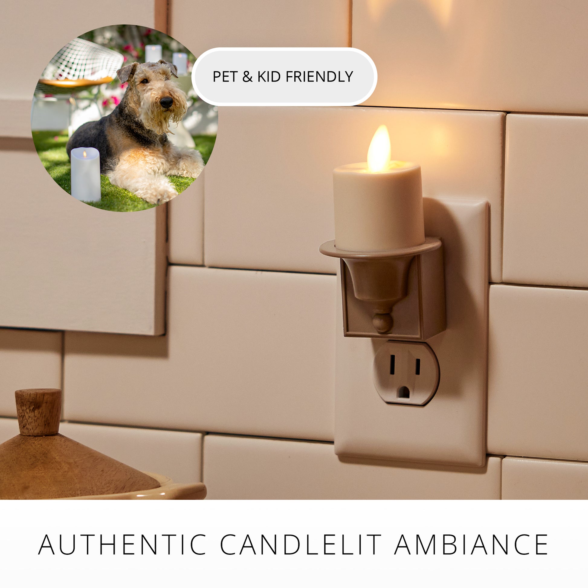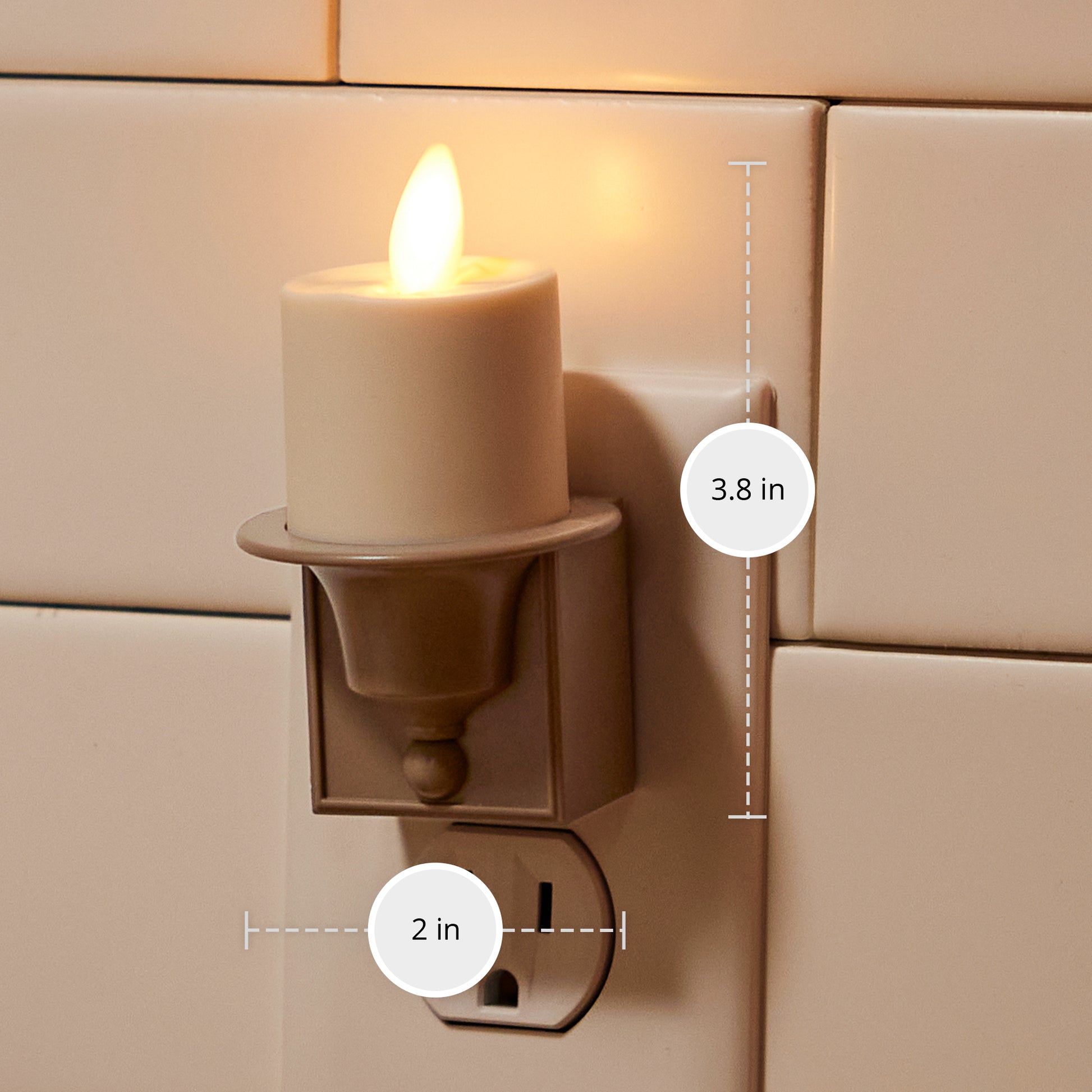 Enhance your home's ambiance with the elegant Timeless Taupe Nightlight. Featuring a patented moving flame and dusk to dawn sensor, this nightlight combines traditional charm with modern convenience. The high-quality plastic and subtle taupe hue make it a versatile addition to any space, offering a soothing, candle-like glow throughout the night.Technical Specifications