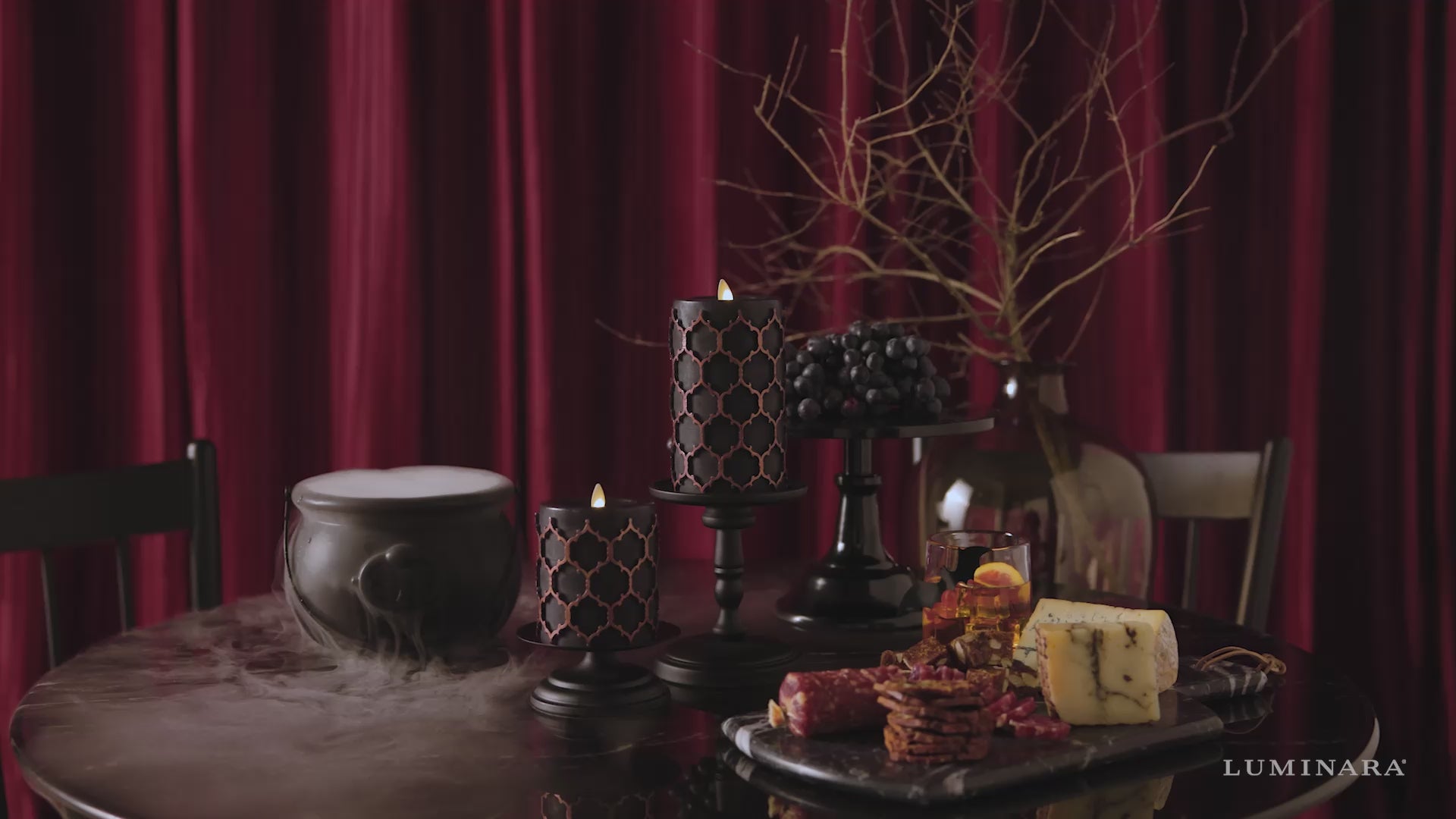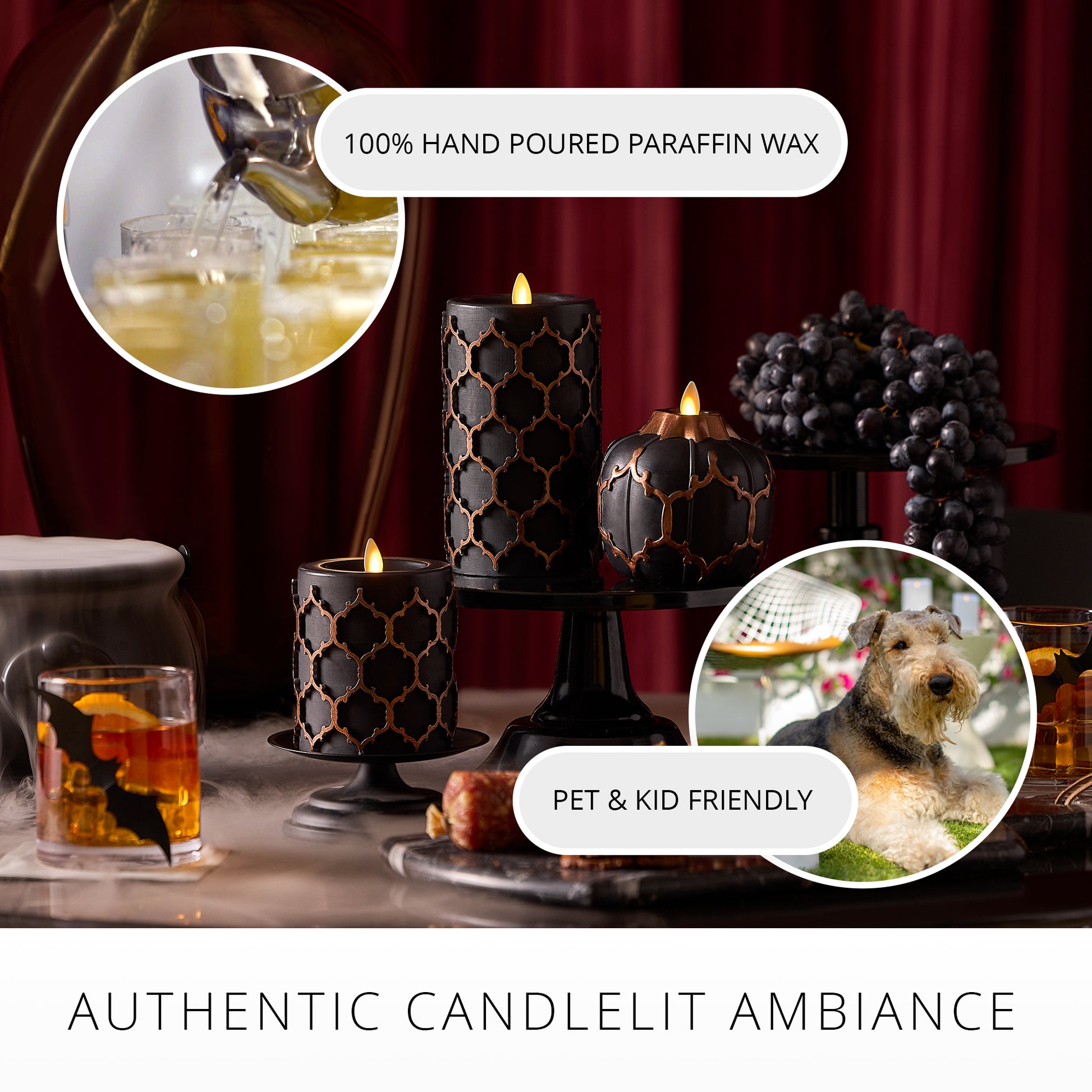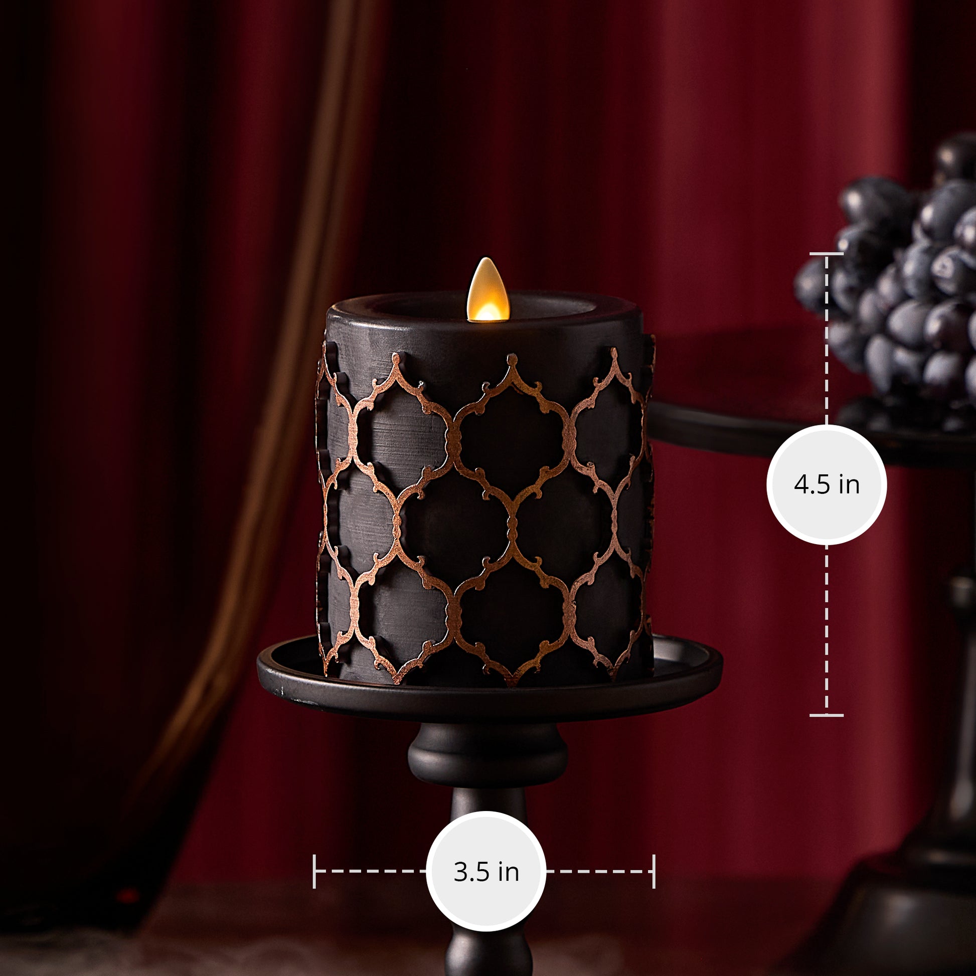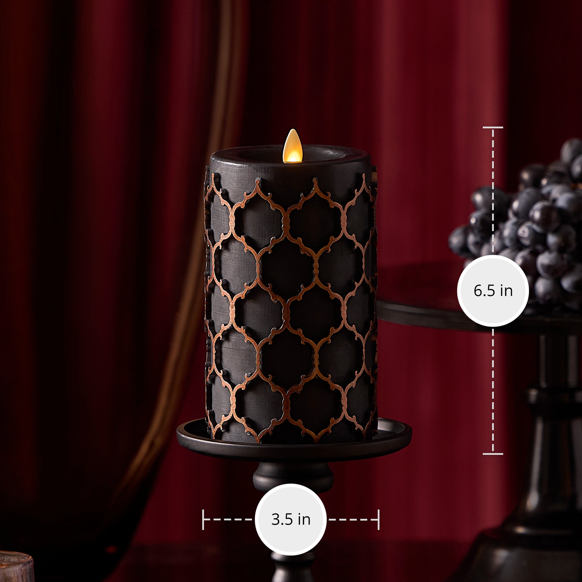 Dark, moody, and elegantly detailed, the Embossed Fretwork Pillar Candle is a hauntingly beautiful addition to your Halloween decor. Crafted in matte black wax with intricate raised scrollwork, this flameless candle offers a dramatic glow powered by Luminara’s signature moving flame. Available in two heights, it pairs perfectly with our Gothic collection for a layered, candlelit look.Technical Specifications