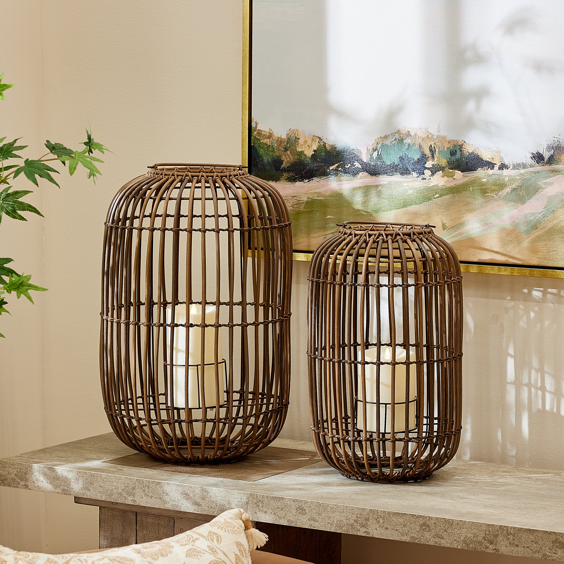 Artisan made to capture a rustic yet refined aesthetic, the Rattan Inspired Lanterns by Luminara beautifully filter light and can be used both indoors or outdoors. Made with a solid stainless-steel frame and HDPE resin, the lanterns are crafted to resemble weathered brown wicker for a causal, natural look and feature a classic weather-resistant Luminara flameless candle pillar that will cast worry-free, warm ambient lighting all season long.