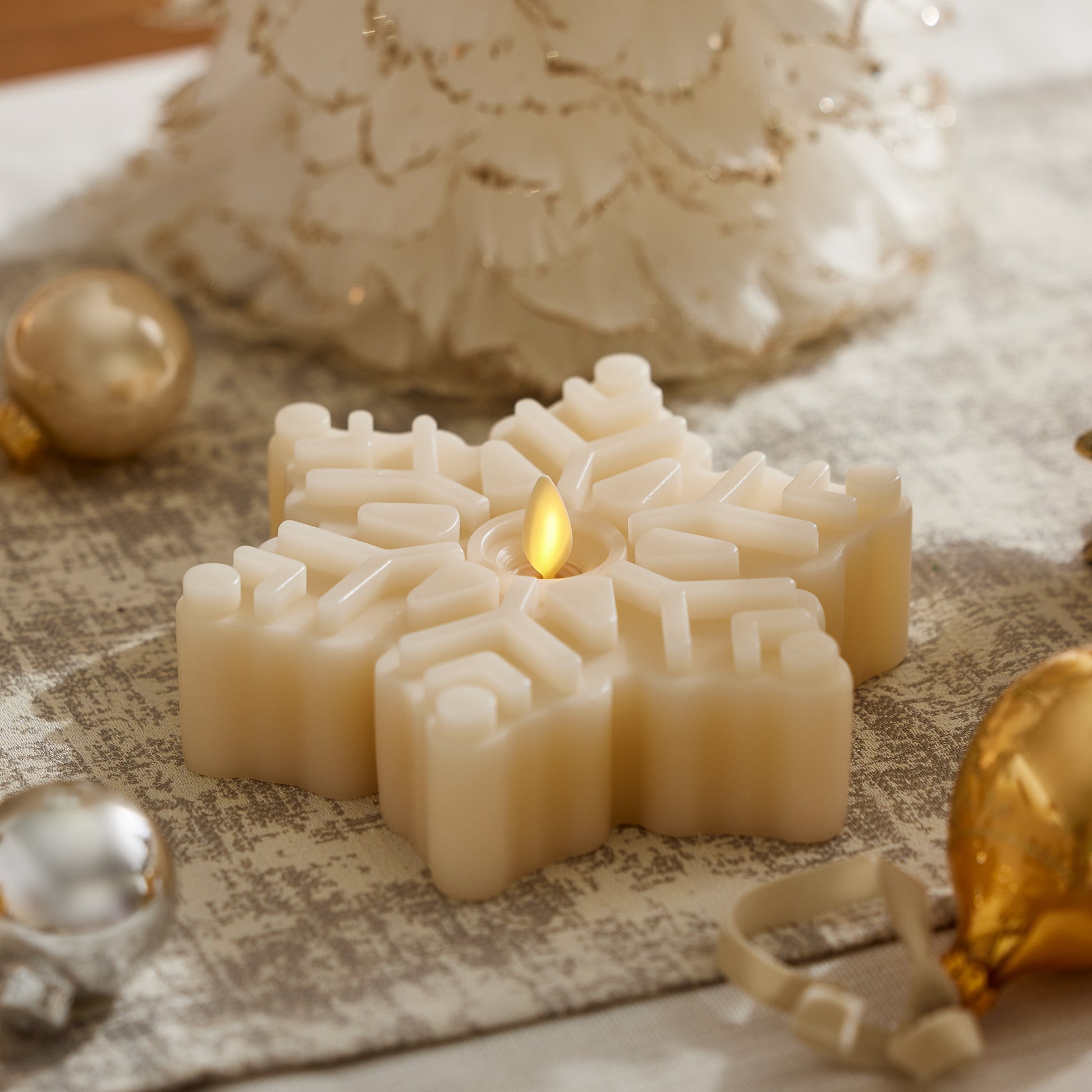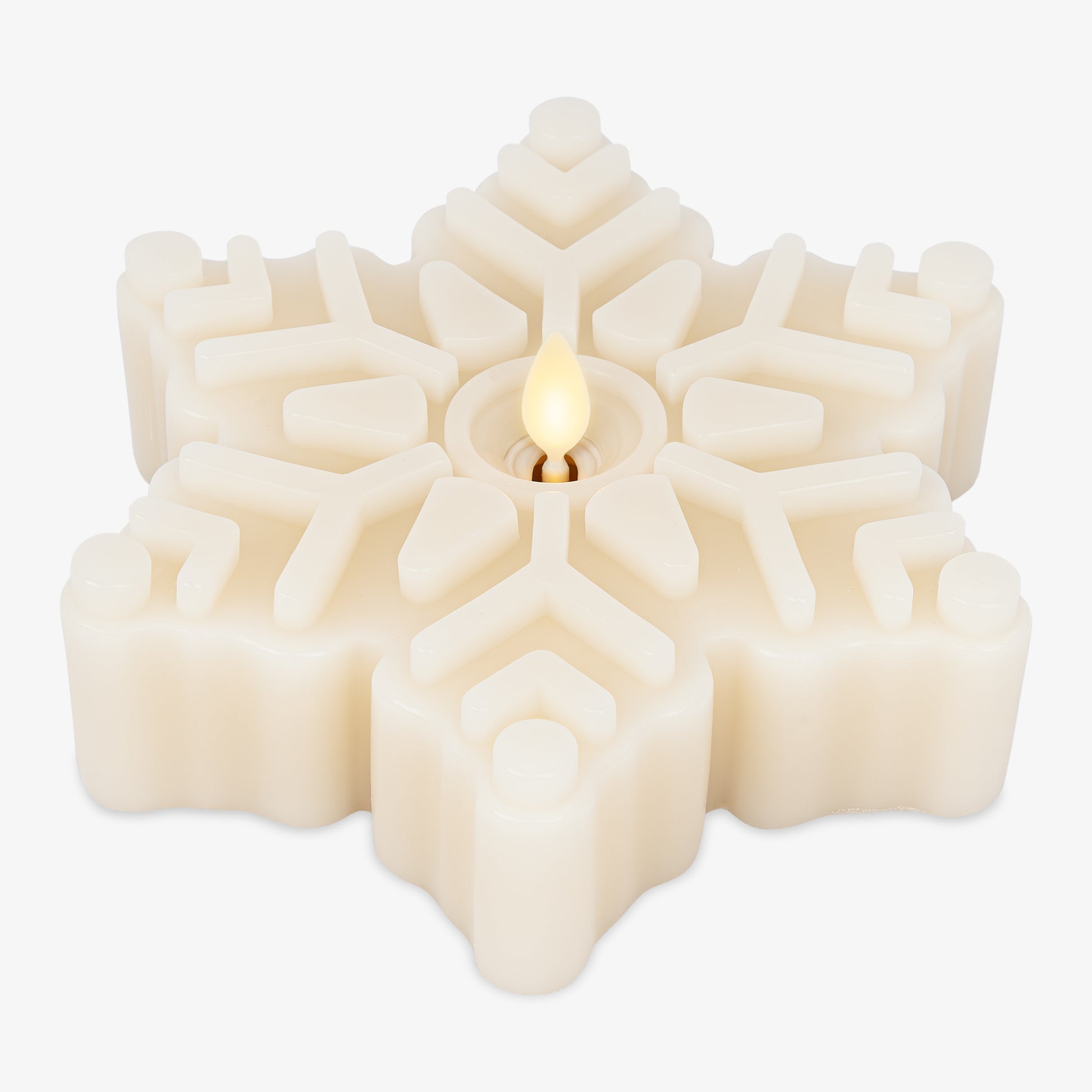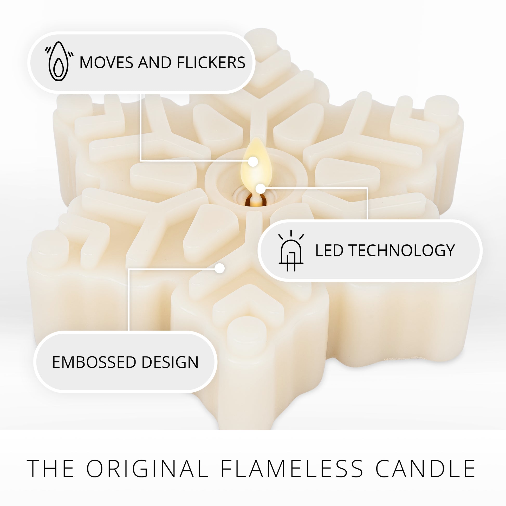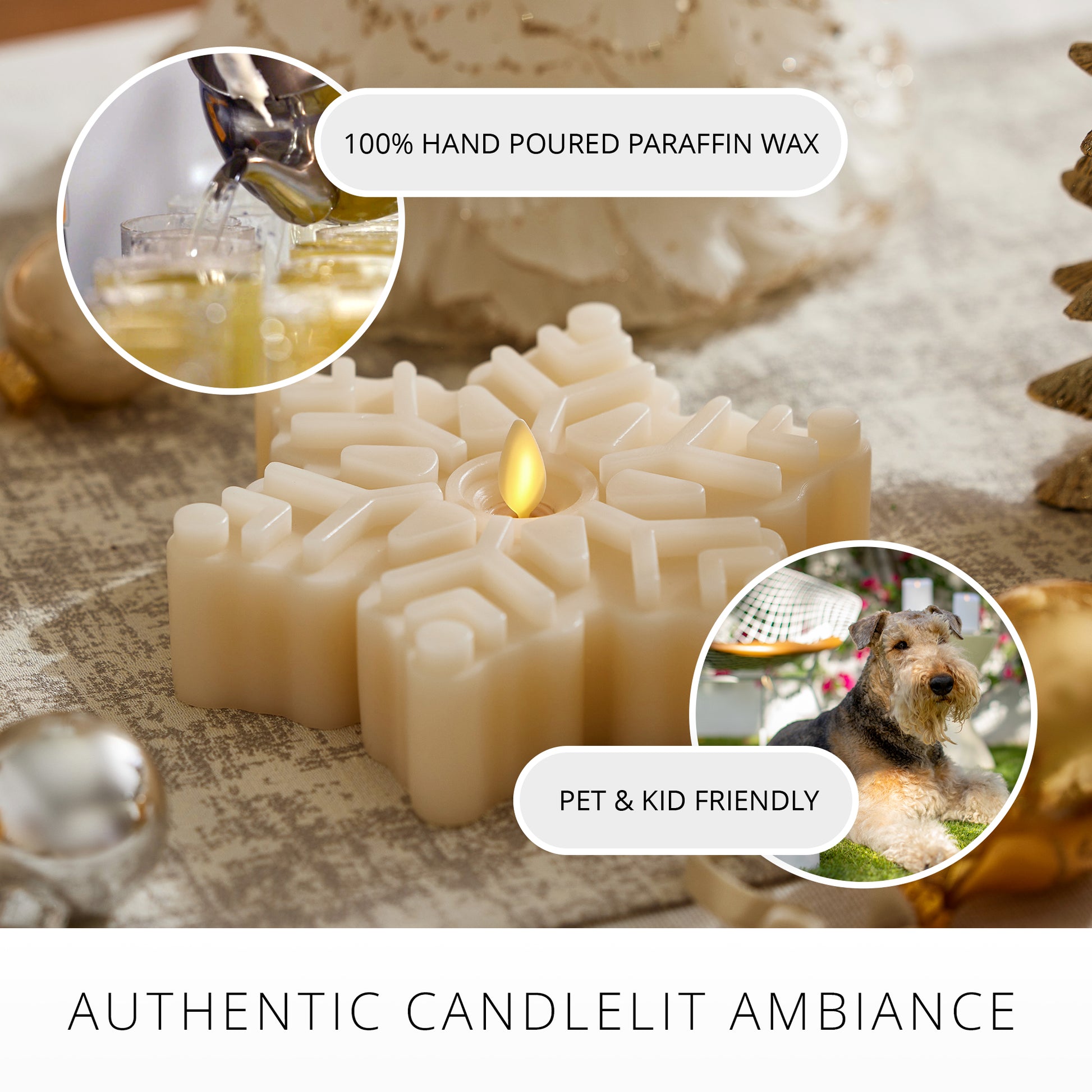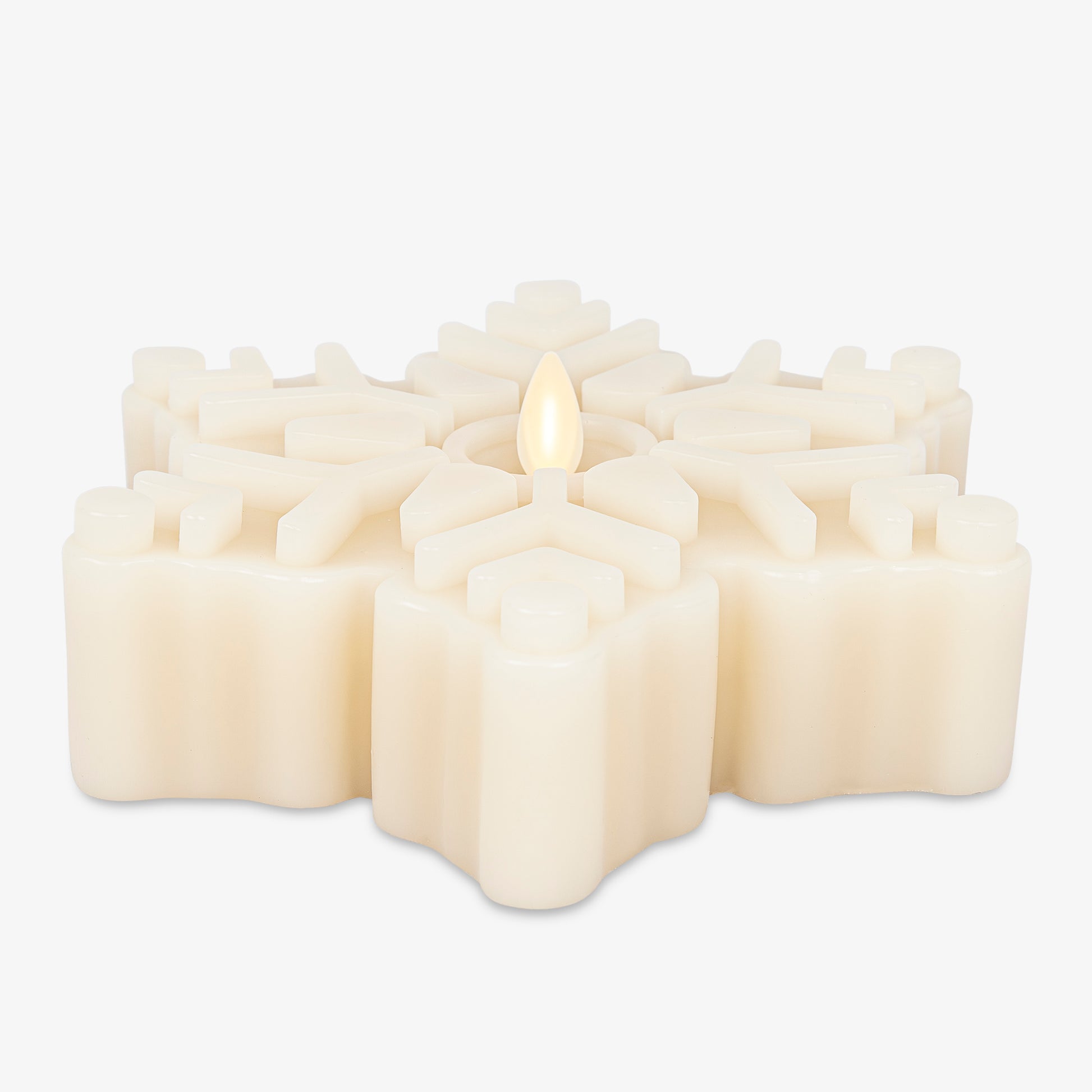 Recreate the beauty of a winter wonderland at home with our White Swan Snowflake Tealight. Generously sized and made with premium quality wax, this flameless candle snowflake can be placed on bedroom nightstands or scattered across tabletops and mantle pieces for an impressive yet delicate touch of winter charm. Elegant and festive, the White Swan Snowflake Tealight radiates with the cozy comfort and effortless style of genuine moving-flame technology.Technical Specifications