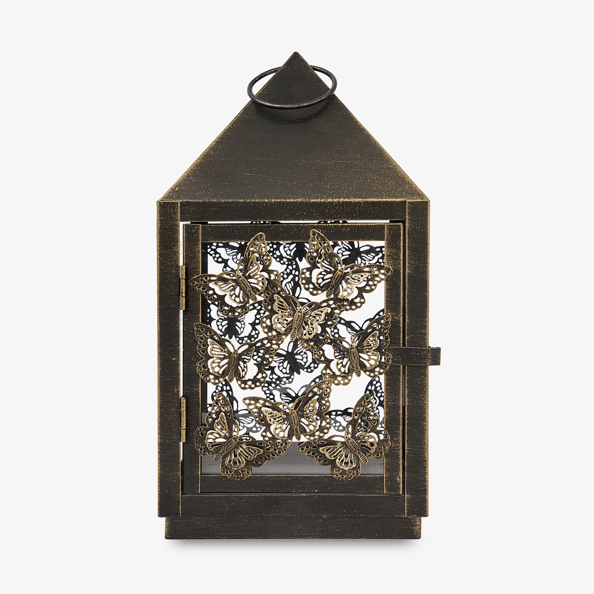 Transform your garden into a haven of beauty with the Luminara Butterfly Metal Lantern in Bronze. This 12" lantern, made from sturdy metal and glass, showcases exquisite 3D butterfly designs on both the front and back, adding a touch of nature-inspired elegance to your outdoor decor. The front door provides easy access for inserting your favorite candle, creating a cozy, flickering light.