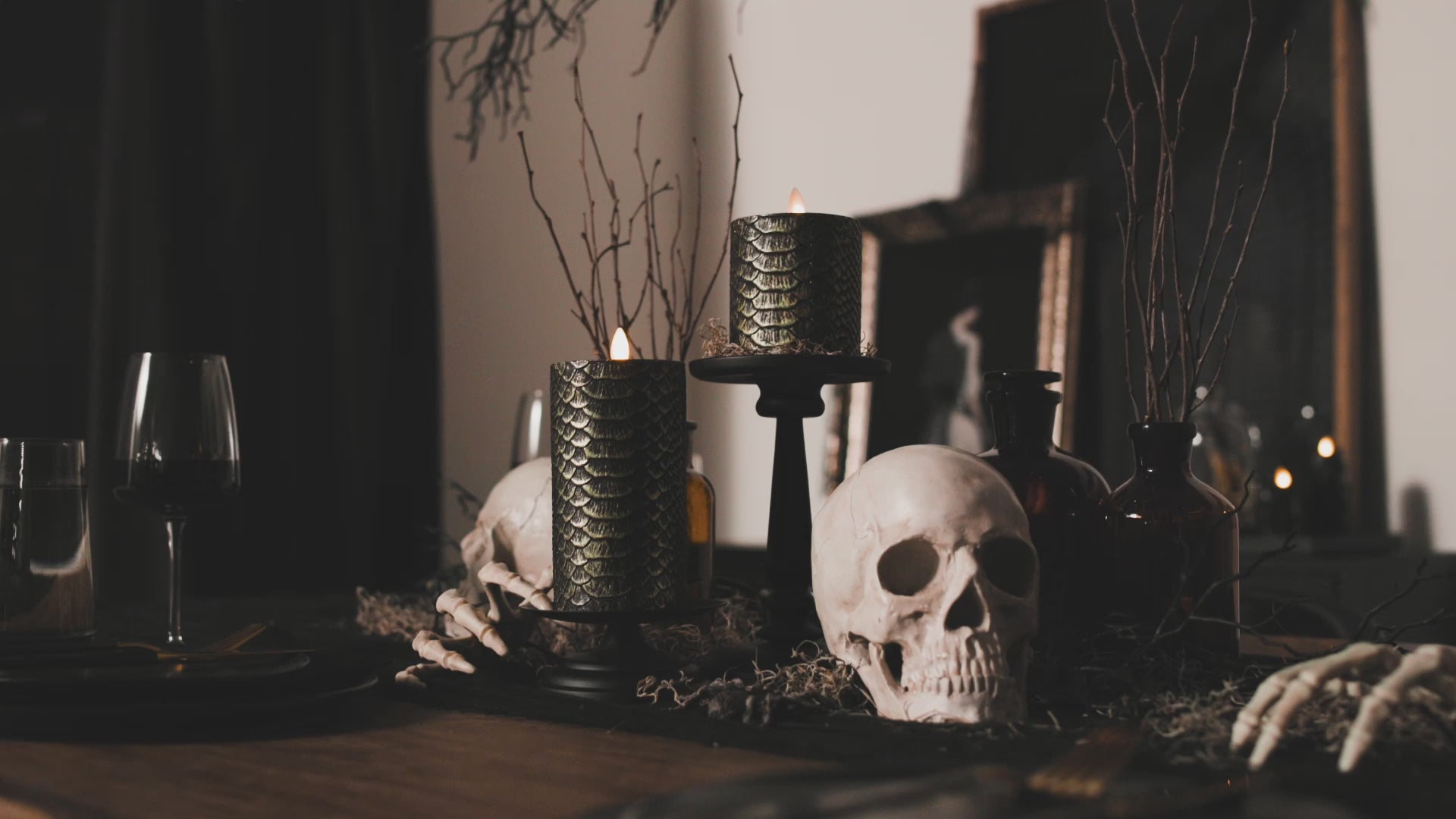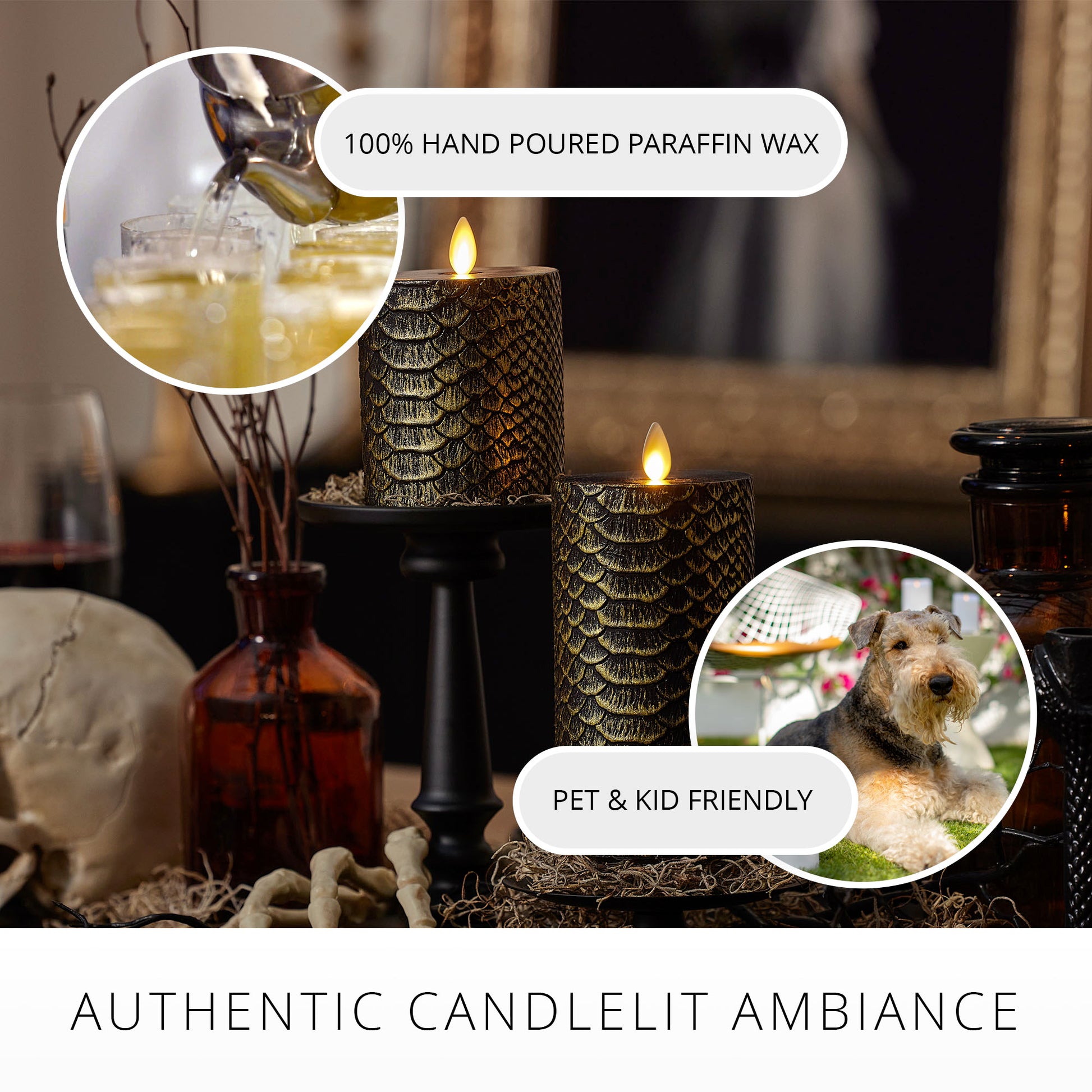 Add slithering glamour to your Halloween celebrations with the Luminara Snakeskin Pillars. Available in two sizes, these textured black wax pillars have a hand painted gold metallic finish that is designed to resemble snakeskin. Glowing with eerie sophistication, these Snakeskin Pillars look stunning on their own or when arranged with complimenting Luminara Halloween items, such as the Wrought Iron Snake Taper Holders.Technical Specifications