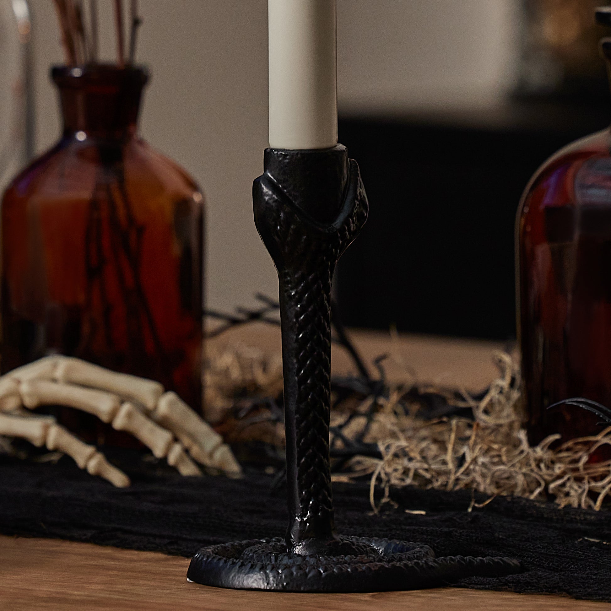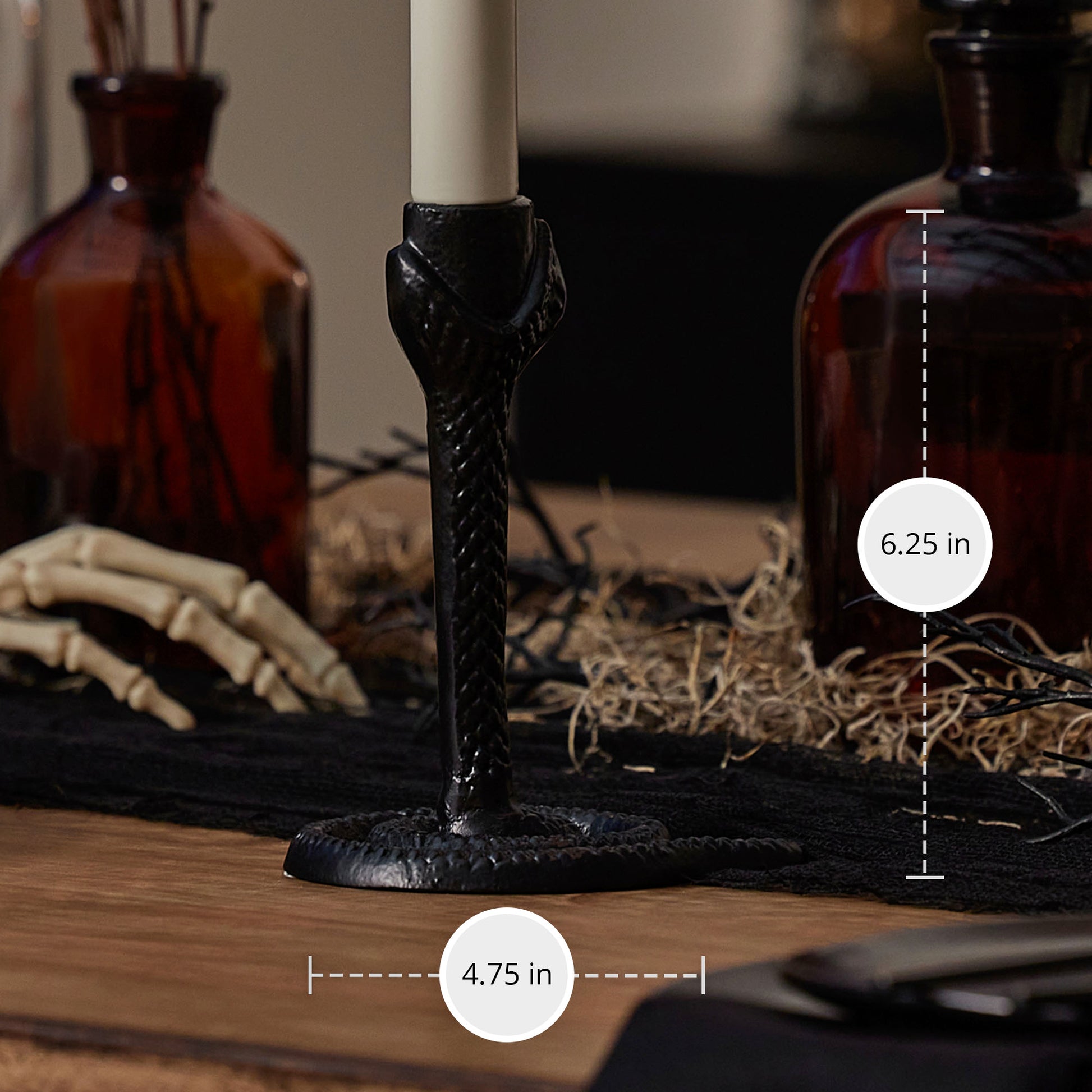 Accessorize your Luminara taper candles with the new Black Wrought Iron Snake Taper Holders. Available in two distinct heights, each artfully crafted taper is designed to look like a black coiled serpent ready to swallow its prey. With a nice feel and weight, these black snake tapers are durably constructed and effortlessly look sleek and elegant along mantlepieces or tabletops – a perfect accent piece to add a slithering touch to your seasonal Halloween décor.
