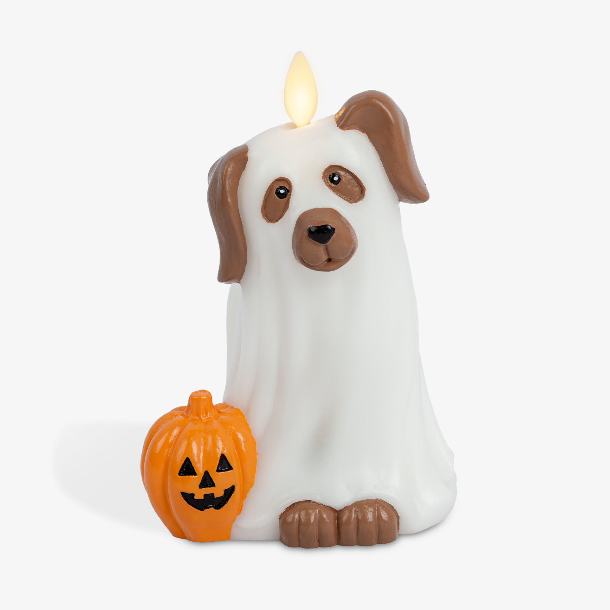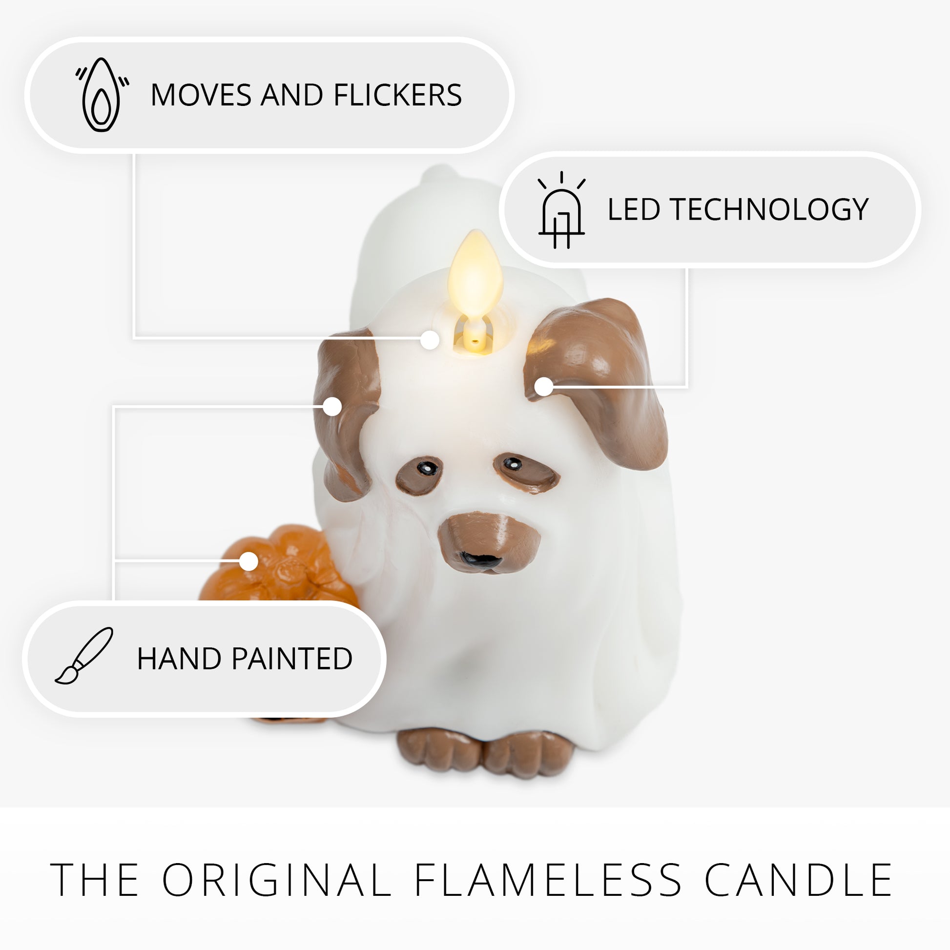 Loyal, glowing, and slightly spooky, our Ghost Dog Flameless Candle is here to light up Halloween. Hand-poured in bright white wax with playful ghostly features, this canine companion flickers with Luminara’s signature flame technology. Add him to your entryway or mantel for a friendly fright.Technical Specifications