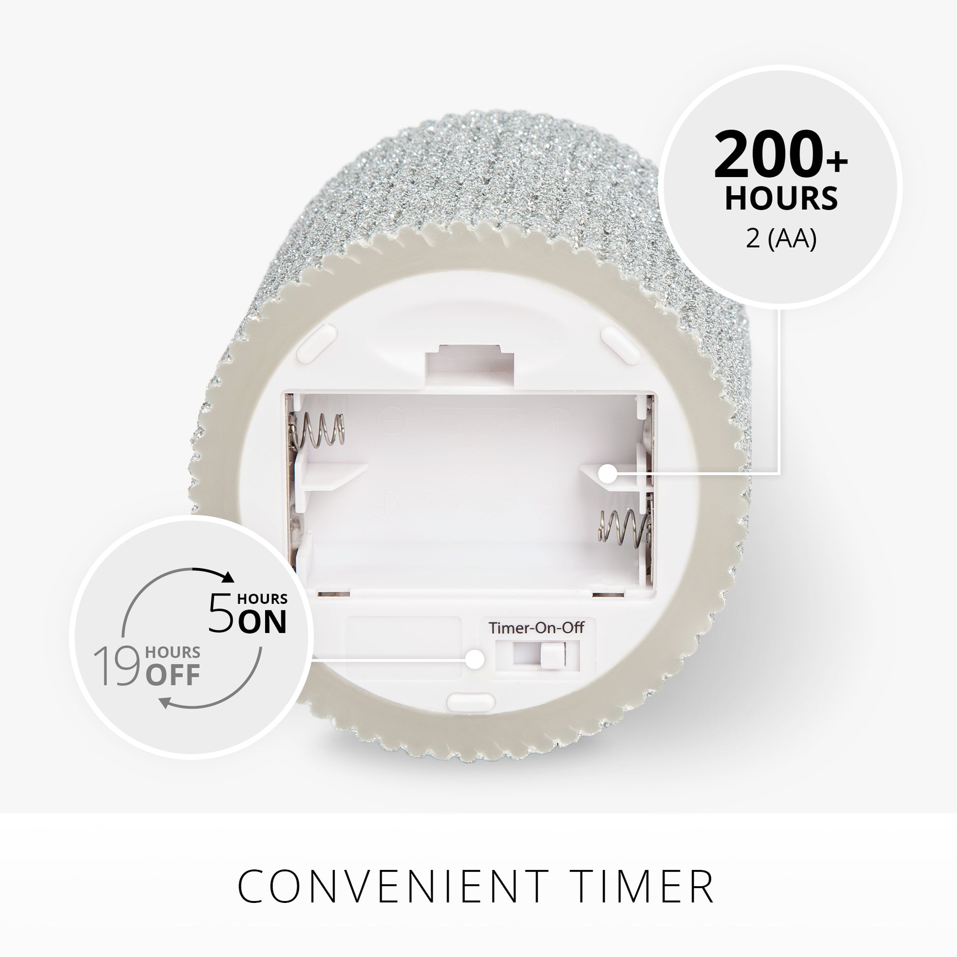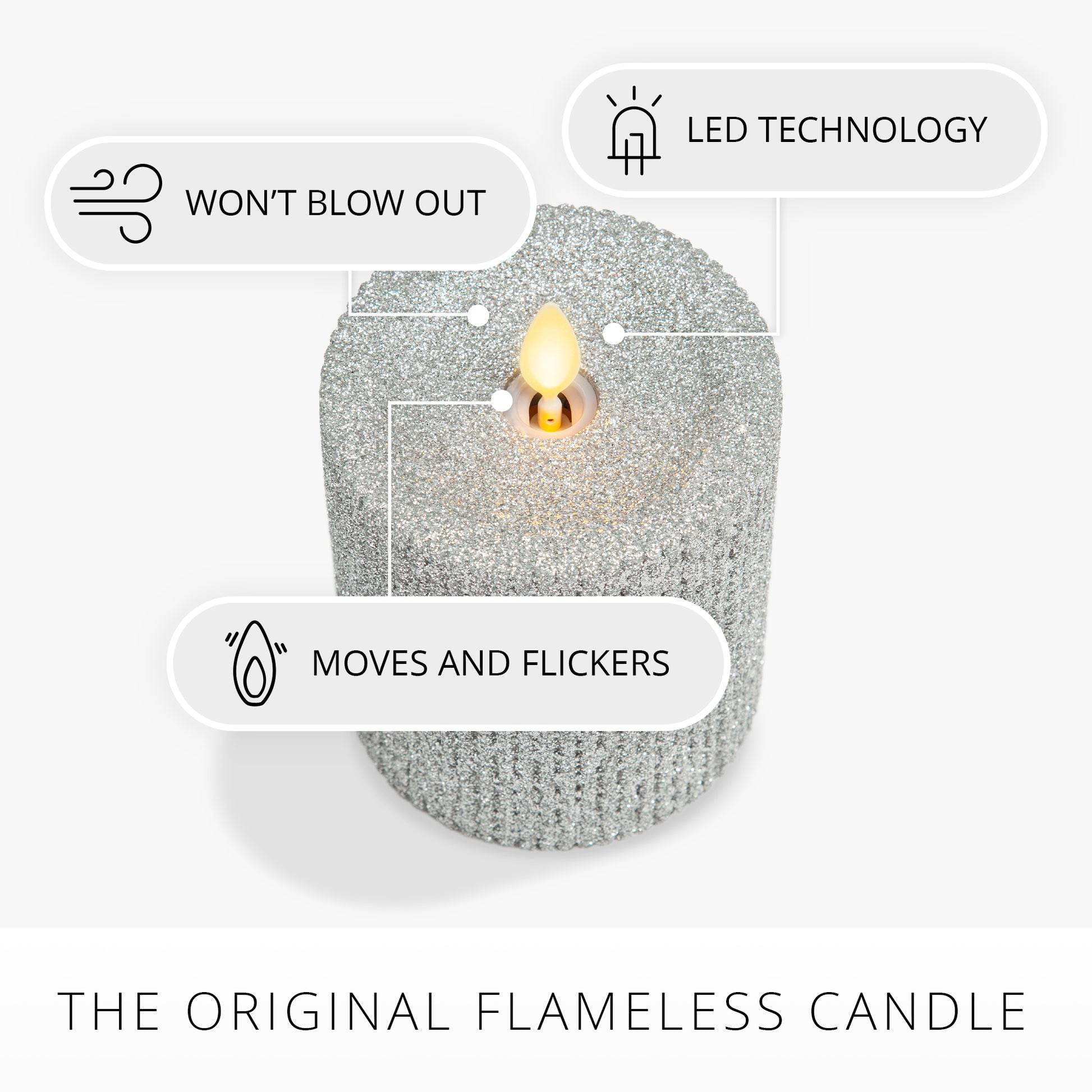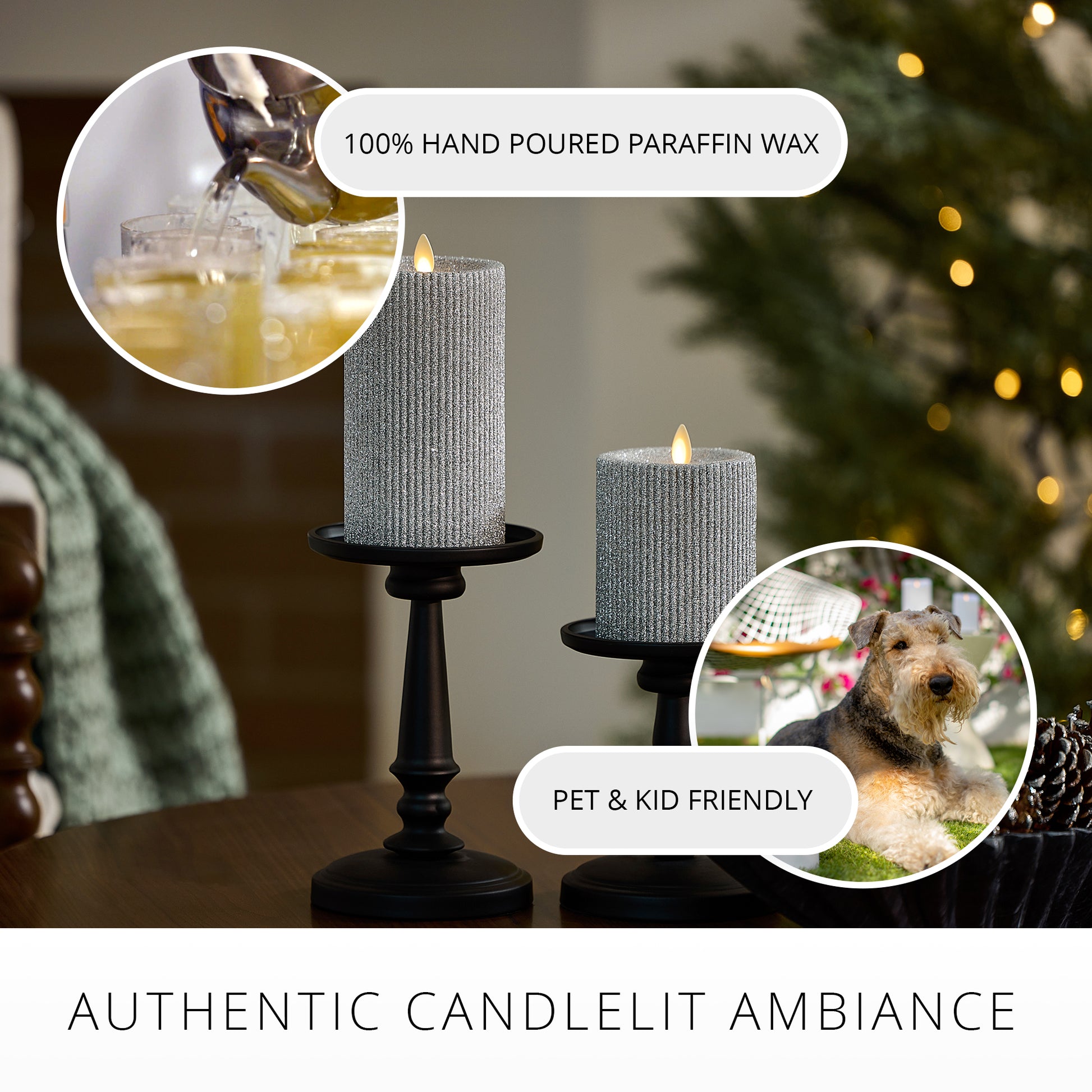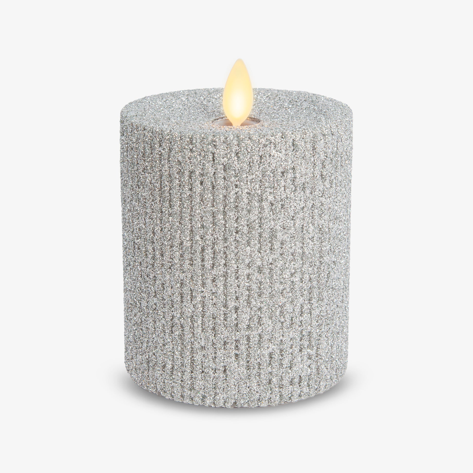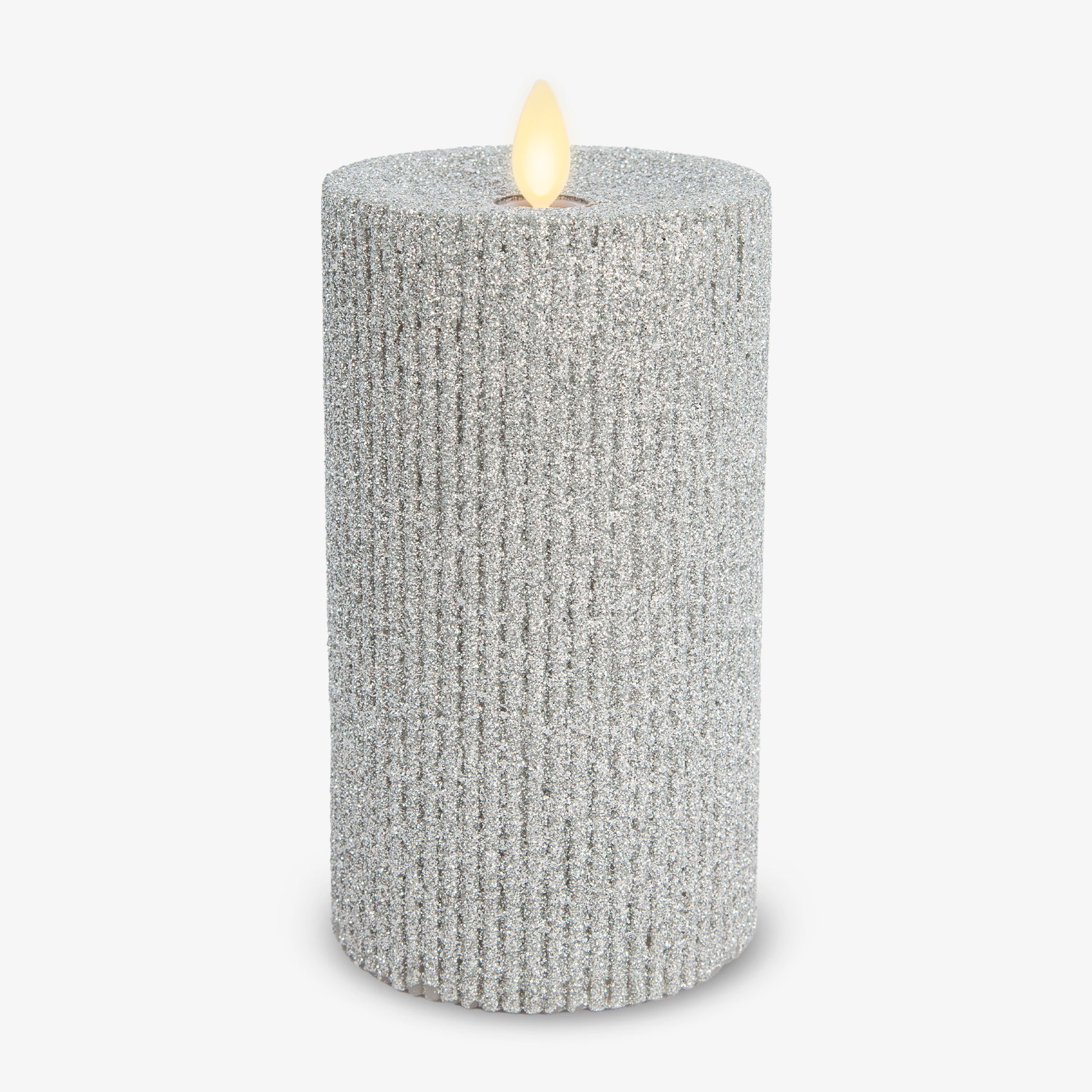 Add an elegant sparkle to your holiday décor with the Luminara Brilliant Silver Glitter Ribbed Pillar. Compete with authentic moving-flame technology, the pillar is available in two heights and has a ribbed sculptural texture with a silver double-dipped glitter finish that effortlessly creates a luxurious aesthetic throughout the holiday months. Stagger the pillars together across a fireplace mantel or use them individually to brighten up a holiday centerpiece, for a chic and comforting worry-free glow.Technical Specifications