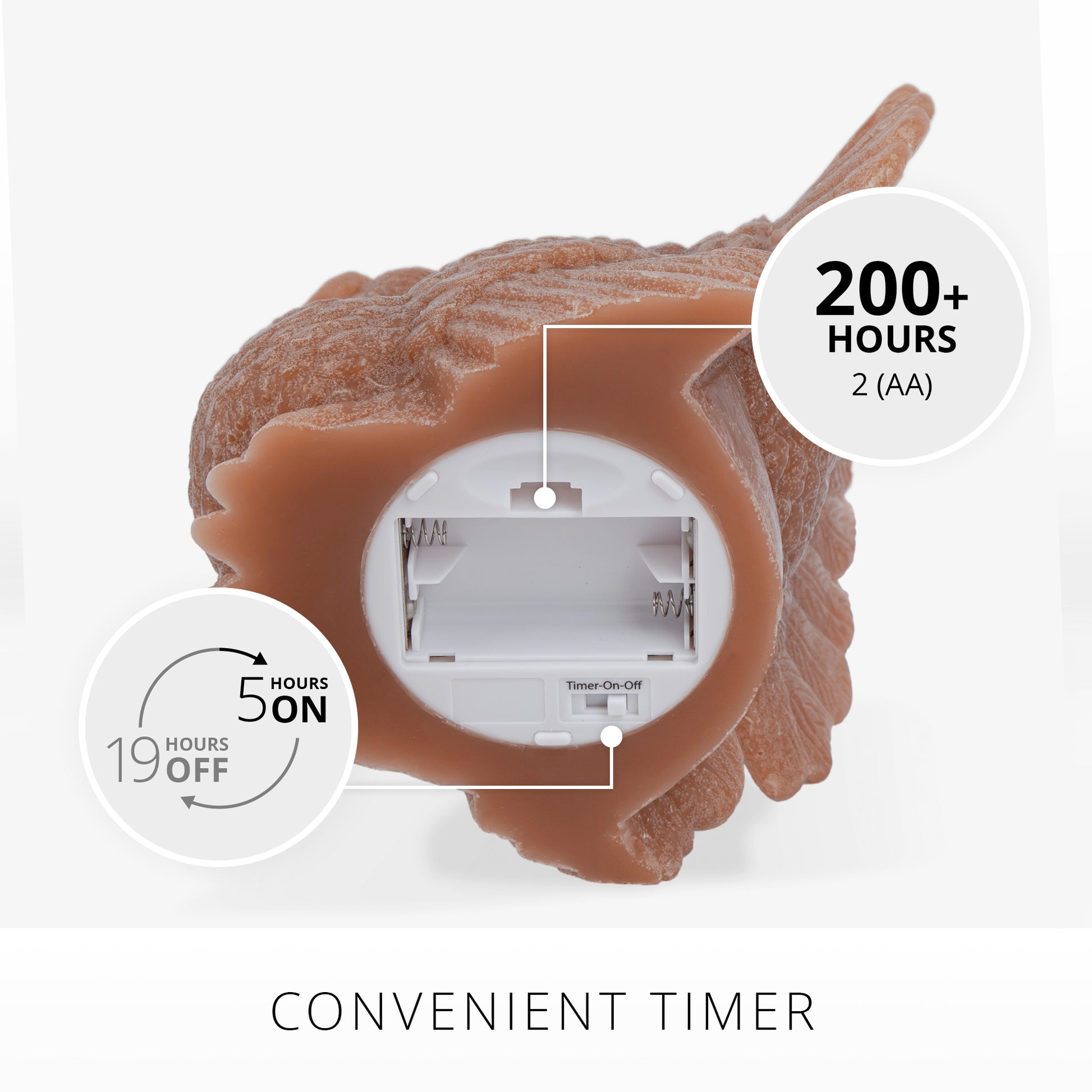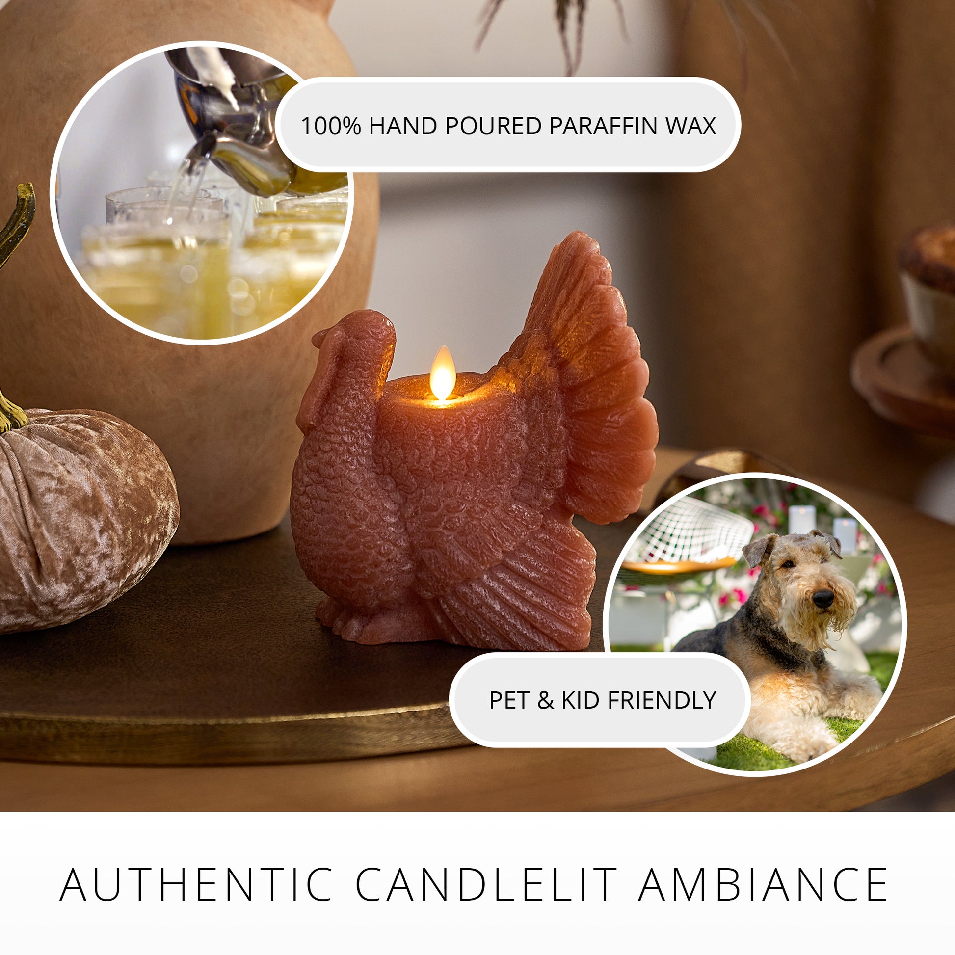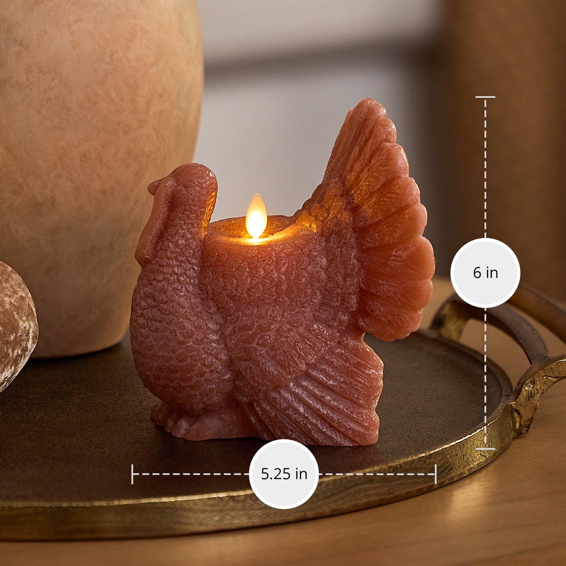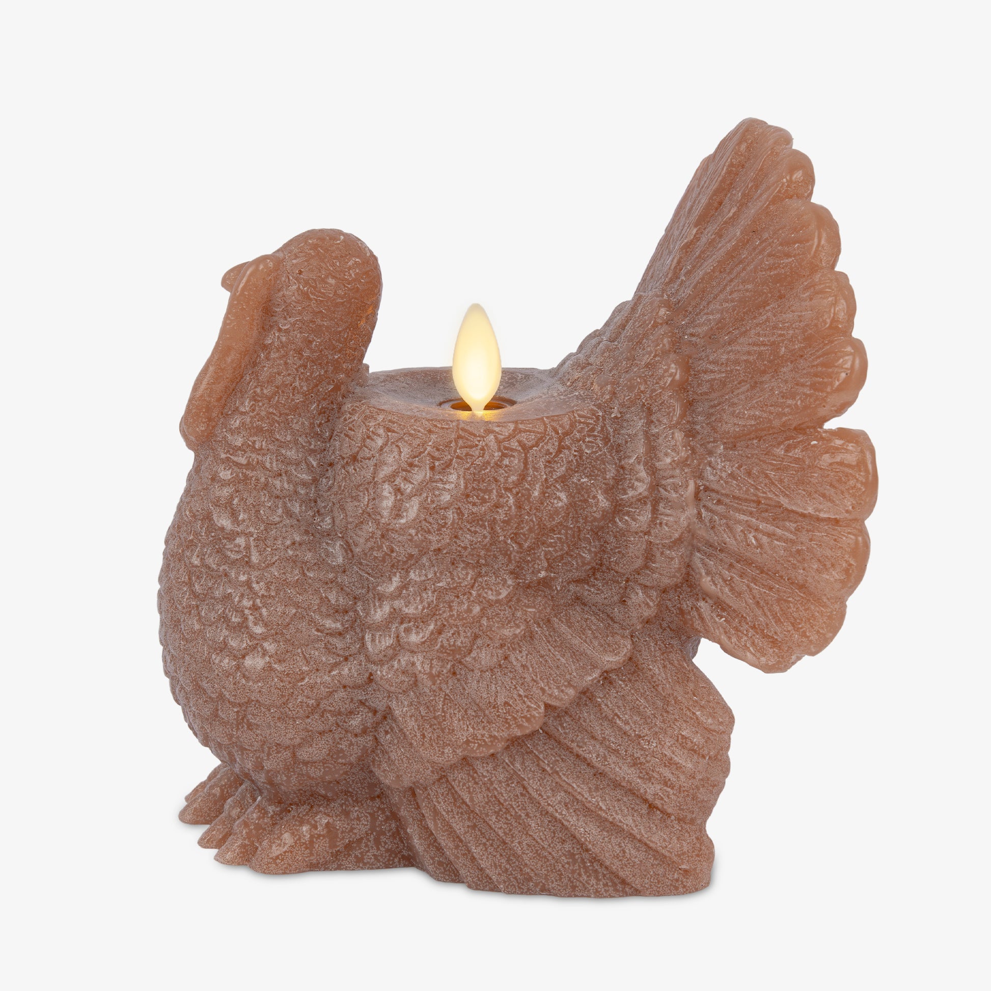 A Luminara best-seller, the Chalky Turkey flameless candle returns to the Harvest Collection in Caramel Café, a rich coffee color with amber undertones and an ashen finish. The hand-poured craftsmanship and detailed artistry of this flameless candle turkey looks exquisite under patented moving-flame technology. Use the Chalky Turkey as a Thanksgiving centerpiece or to brighten a fall table arrangement for a touch of rustic texture and beauty with romantic and worry-free candlelight.Technical Specifications