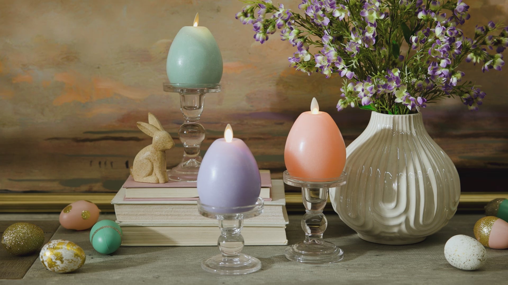 An egg-citing and bright addition to your Easter celebration décor, the mellow peach chalky egg flameless candle by Luminara is equipped with patented moving-flame technology to provide a warm ambient glow without any worry, especially around children and pets. Include these egg-shaped flameless candles in your Easter basket gifts or pair them with your spring floral arrangements for the perfect touch of spring joy this season.