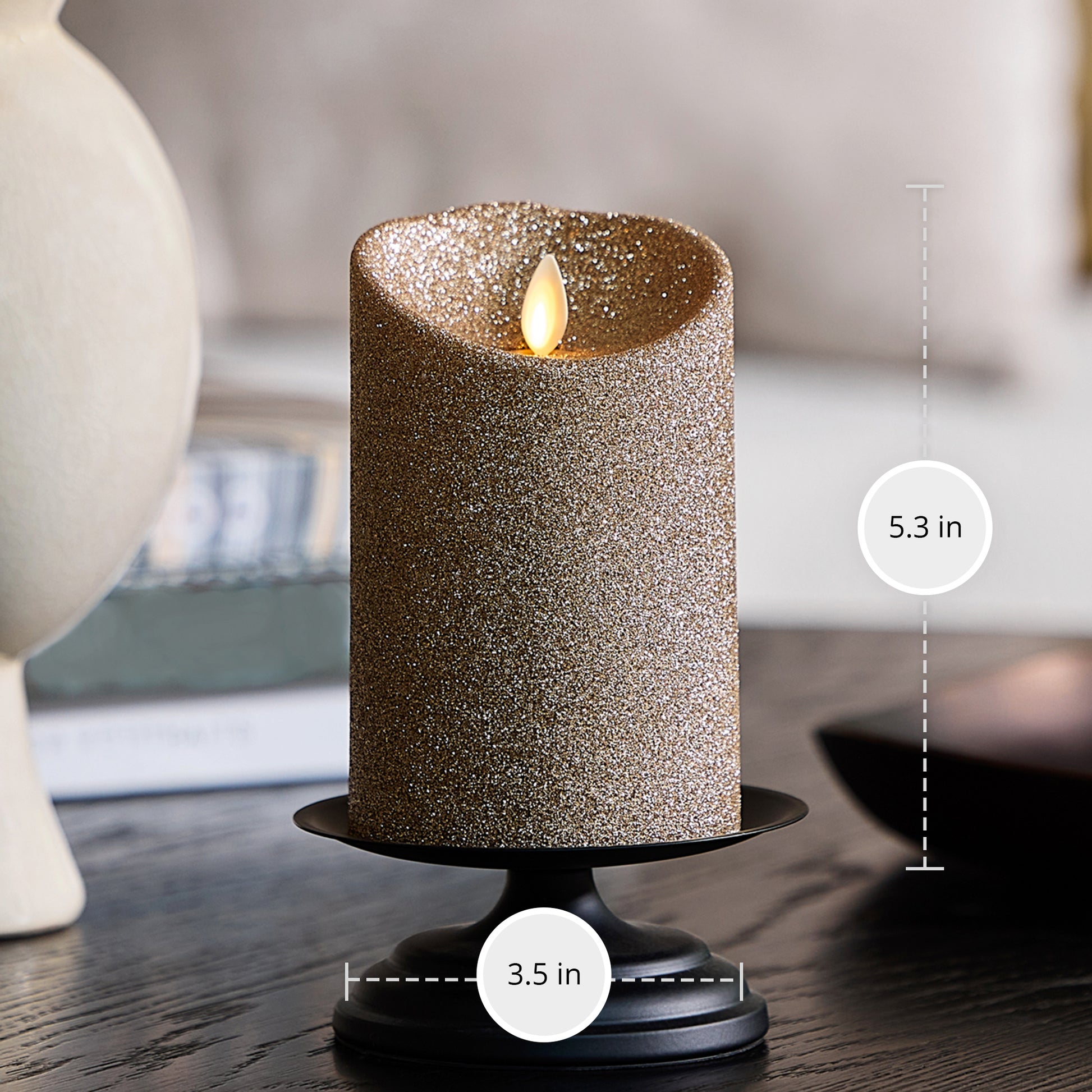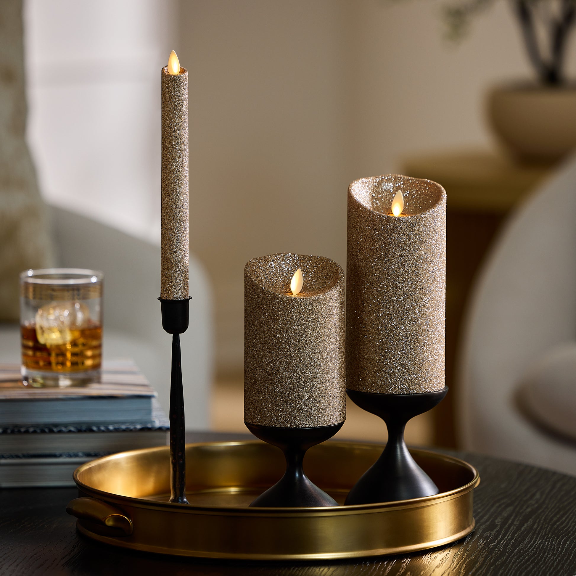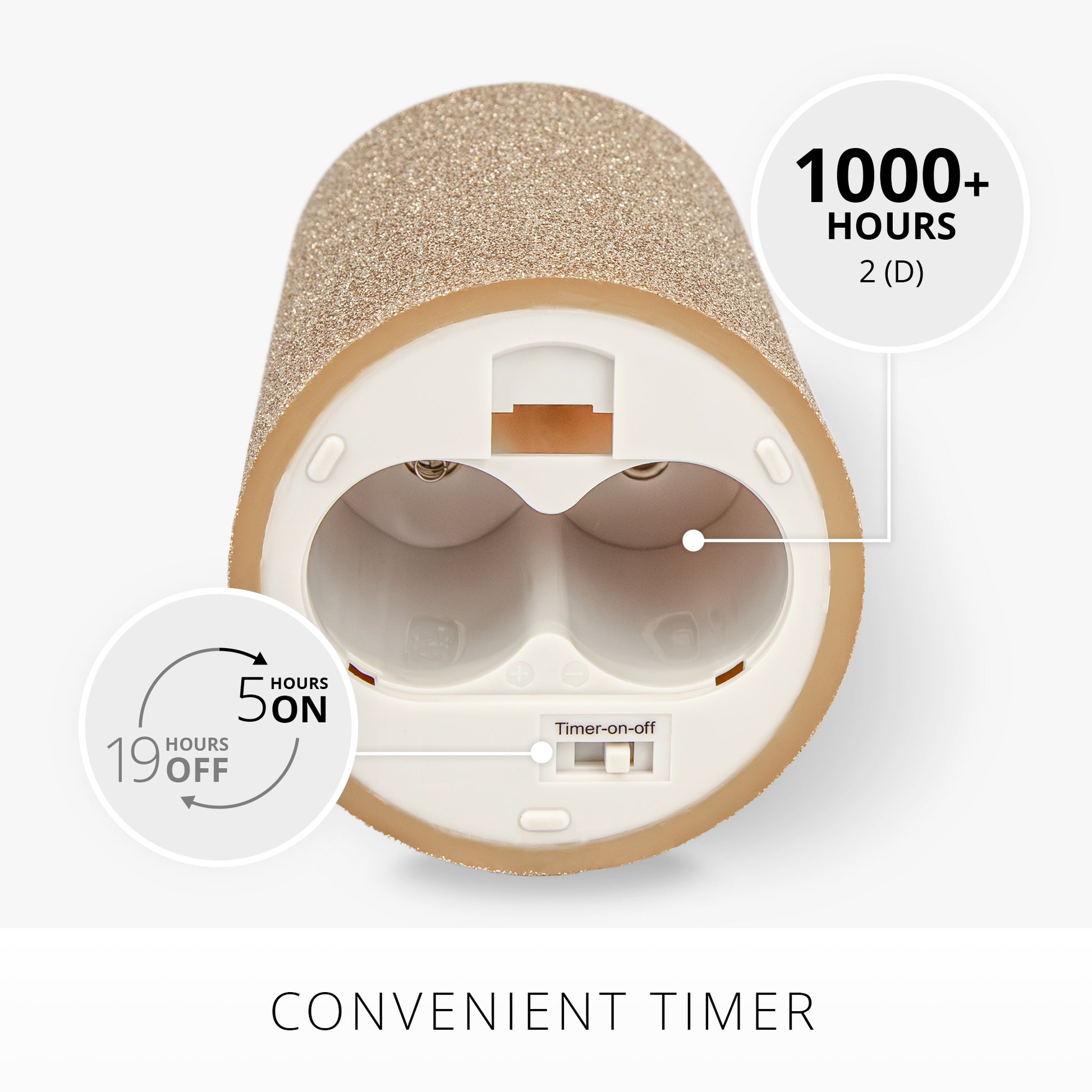 The twinkling glow of the Champagne Glow Glitter Scallop Pillar feels celebratory and romantic. The champagne color easily complements a variety of design aesthetics, making them a perfect lighting accent for a glowing pop of brilliant light. Available in two distinct heights, these pillars look chic and luxe when staggered together or when paired with the Champagne Glow Glitter Taper for a complete set of shimmering candlelight.Technical Specifications
