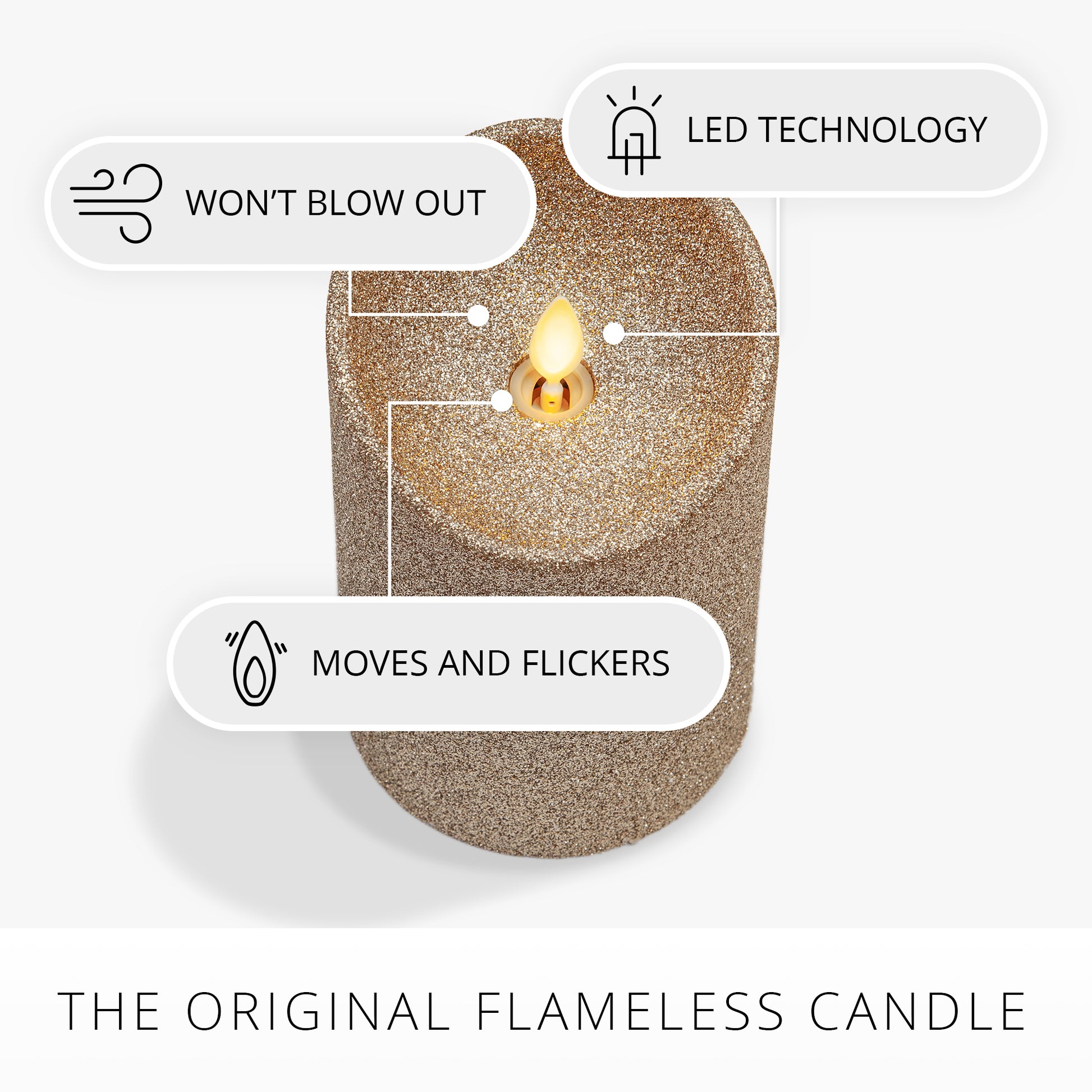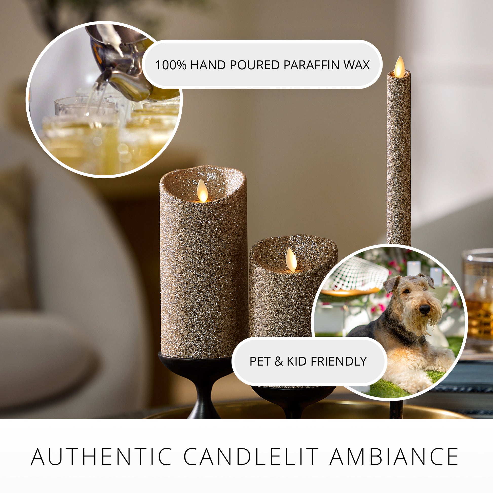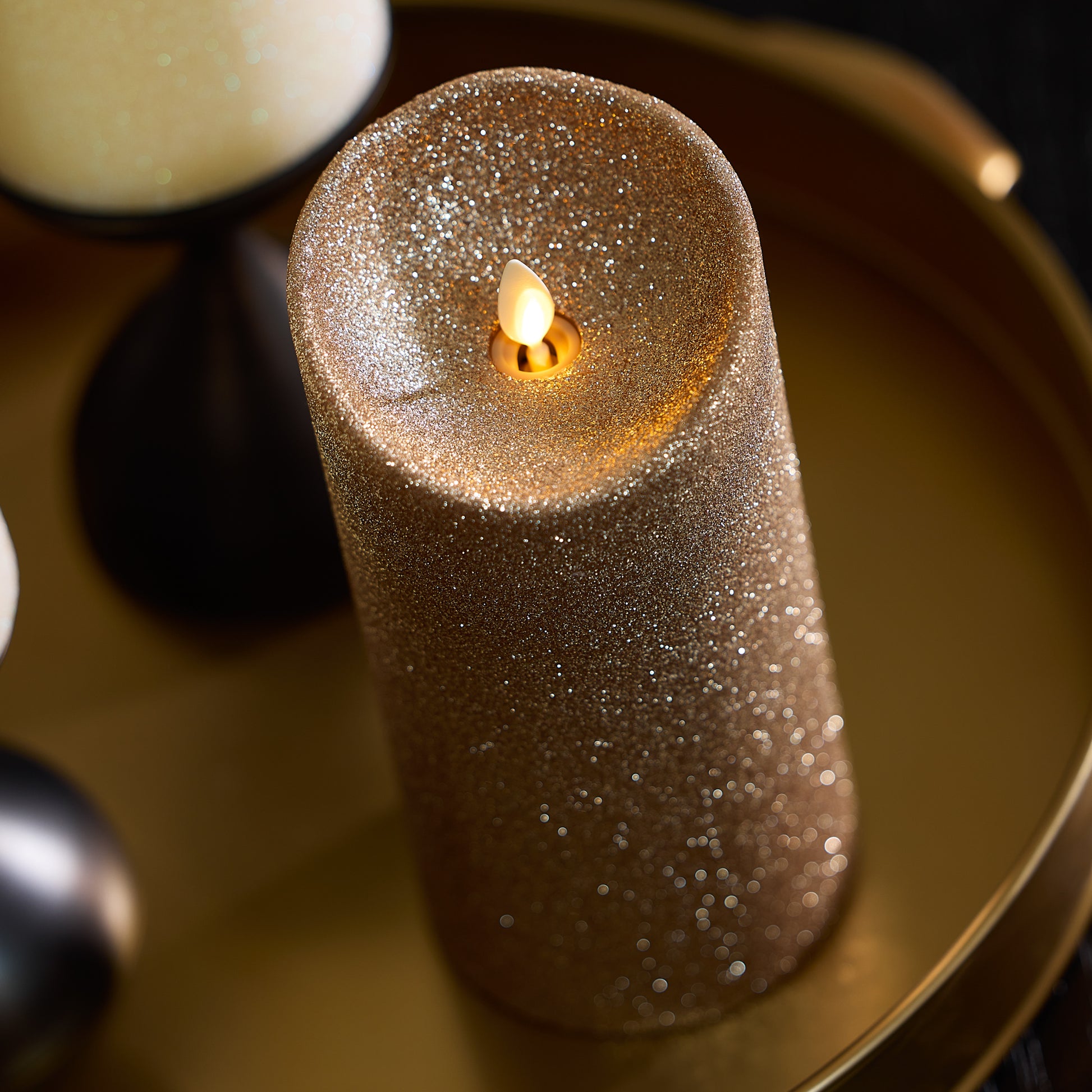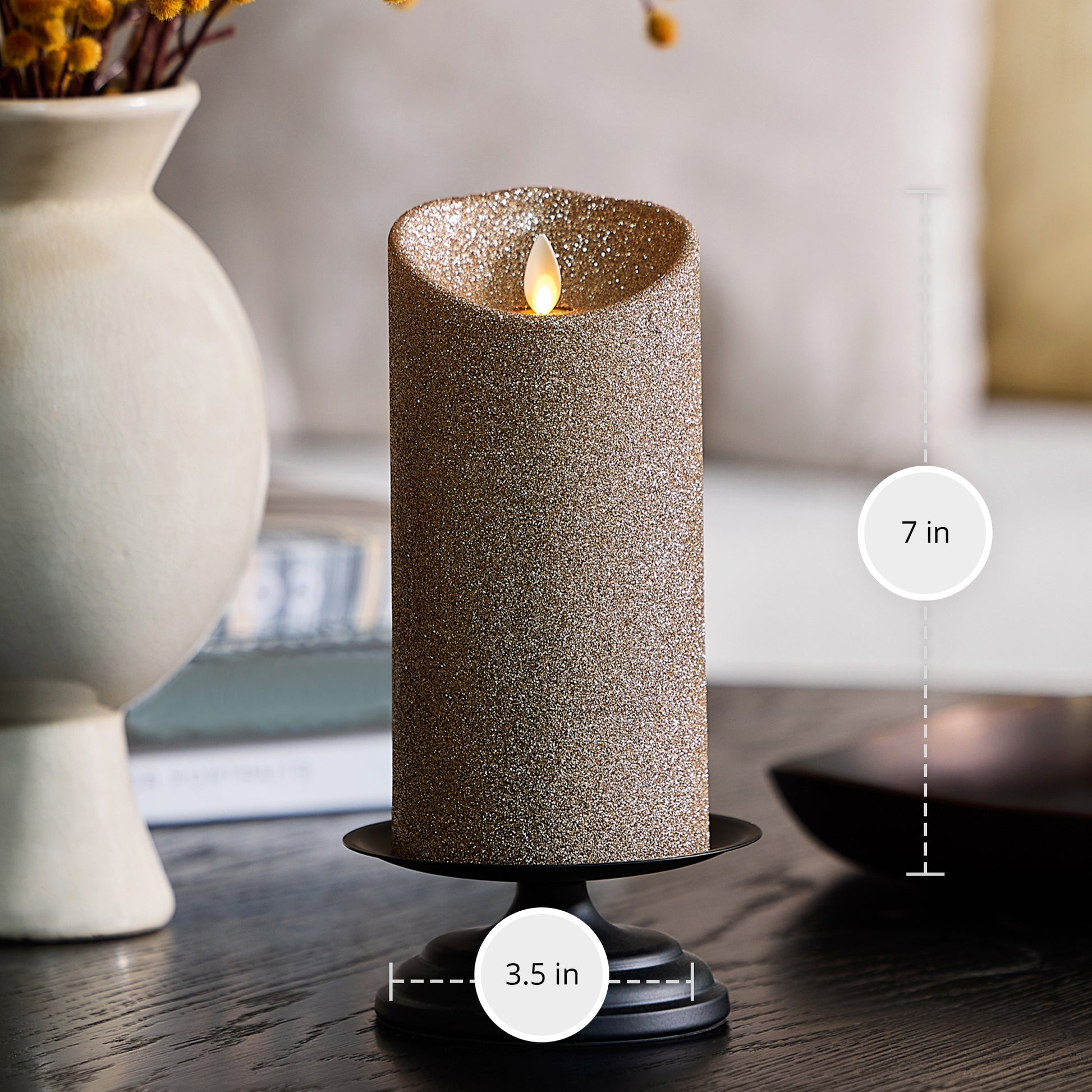 The twinkling glow of the Champagne Glow Glitter Scallop Pillar feels celebratory and romantic. The champagne color easily complements a variety of design aesthetics, making them a perfect lighting accent for a glowing pop of brilliant light. Available in two distinct heights, these pillars look chic and luxe when staggered together or when paired with the Champagne Glow Glitter Taper for a complete set of shimmering candlelight.Technical Specifications