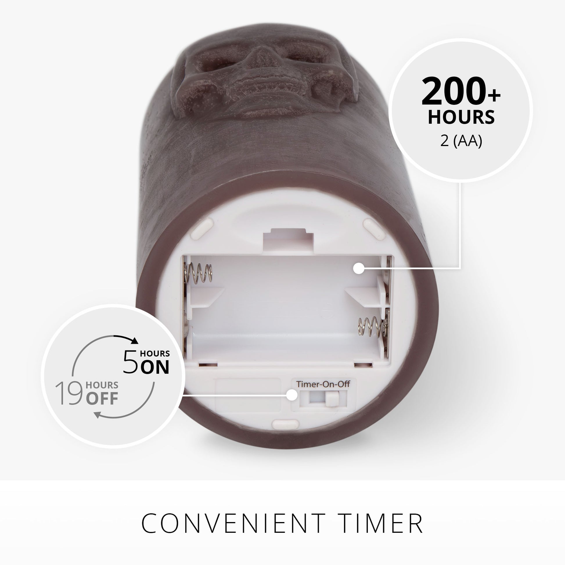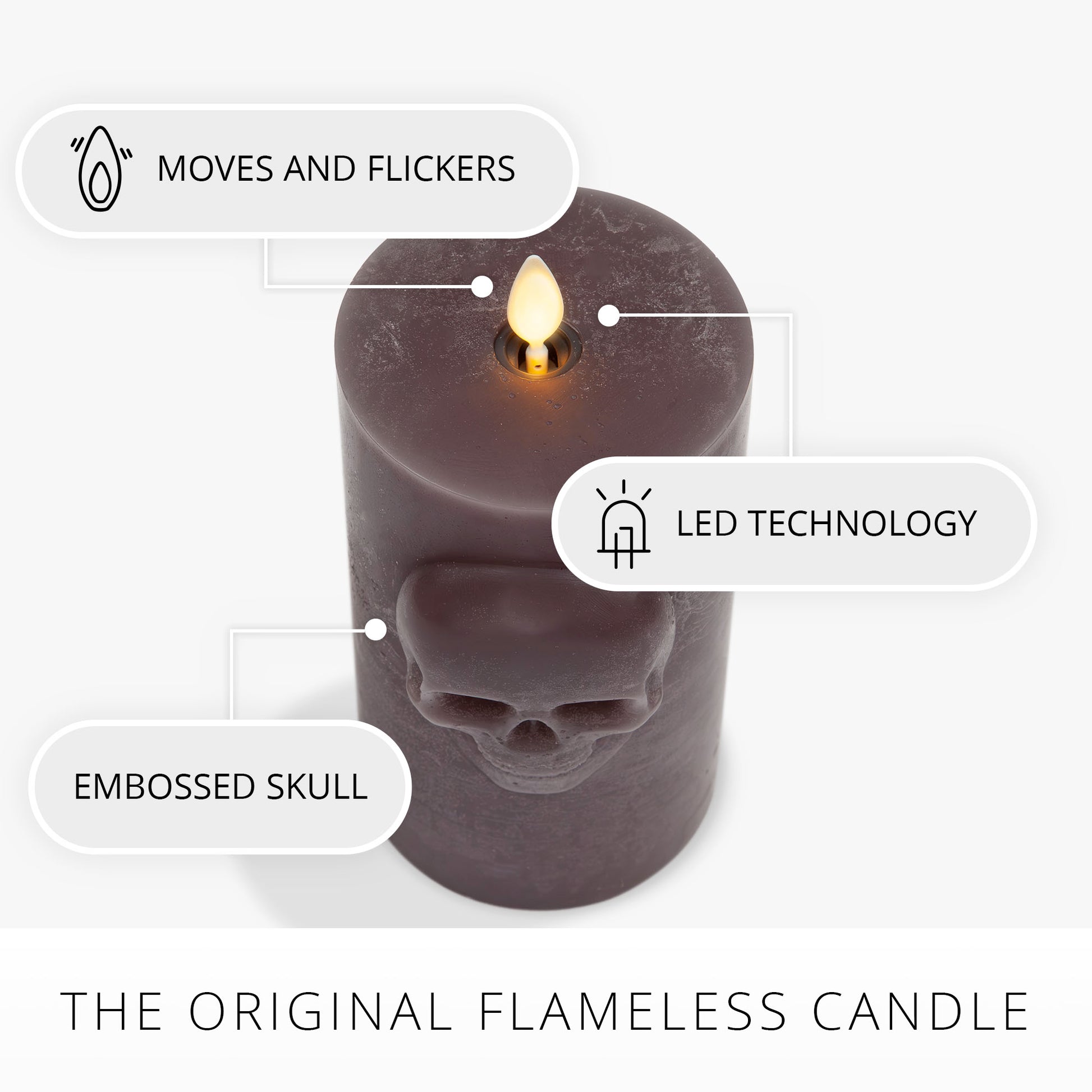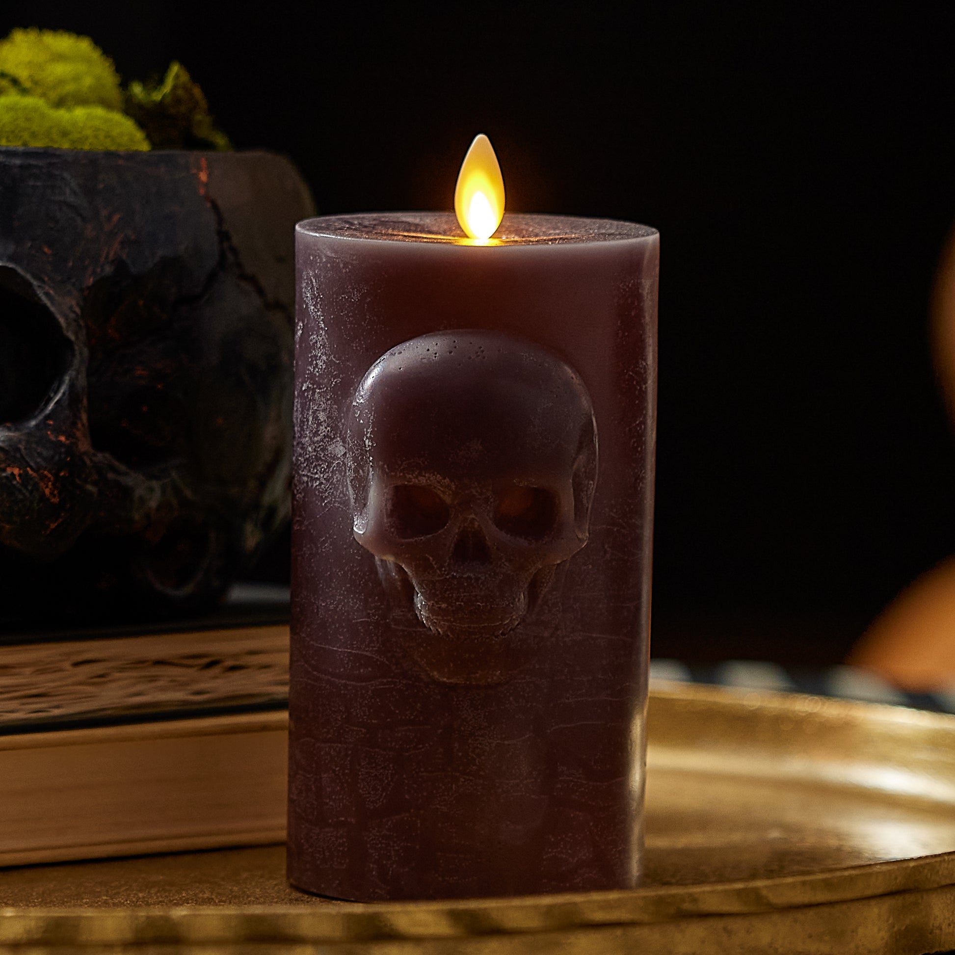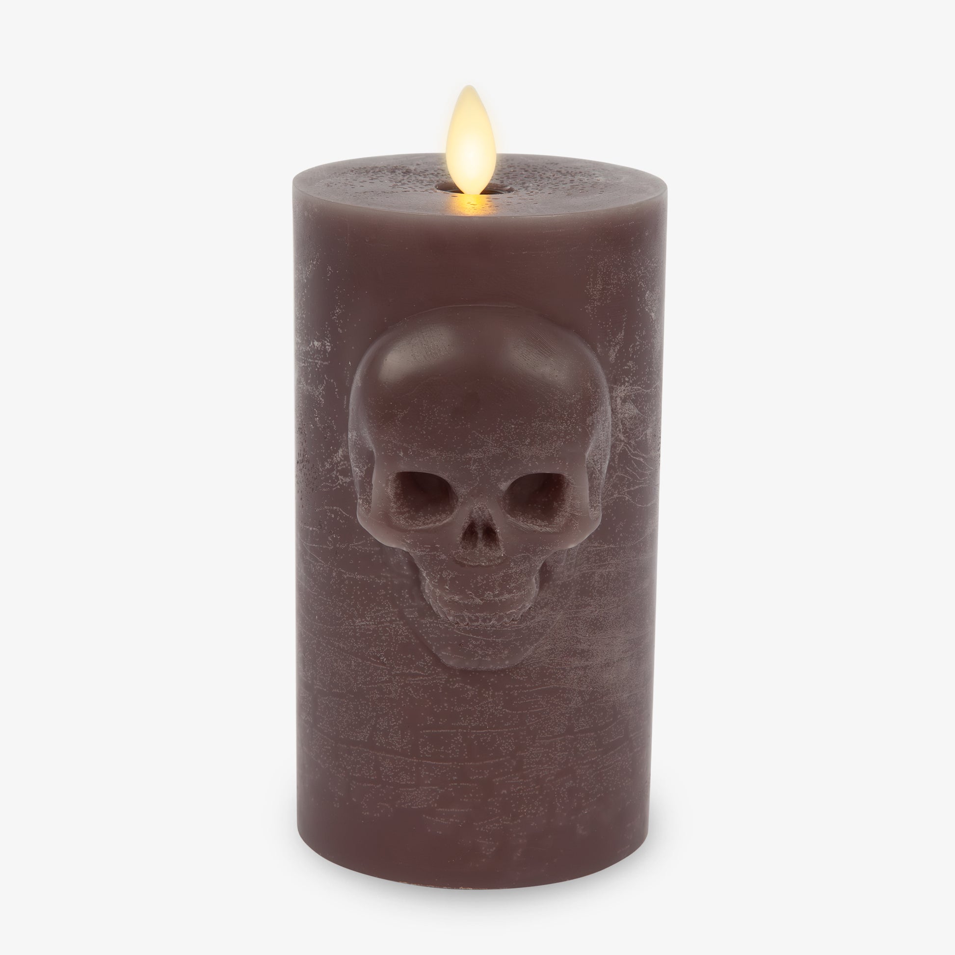 The Luminara Chalky Skull Pillar in Dark Chocolate exudes an eerie Halloween charm while warmly glowing with safe and convenient patented moving-flame technology. The dark chocolate color of the pillar adds a rustic elegance that is accentuated by its textured matte-finish. Complete with an embossed skull relief, this beautifully crafted pillar is versatile and stylish to pair with a variety of charmingly chilling Halloween decorations.Technical Specifications