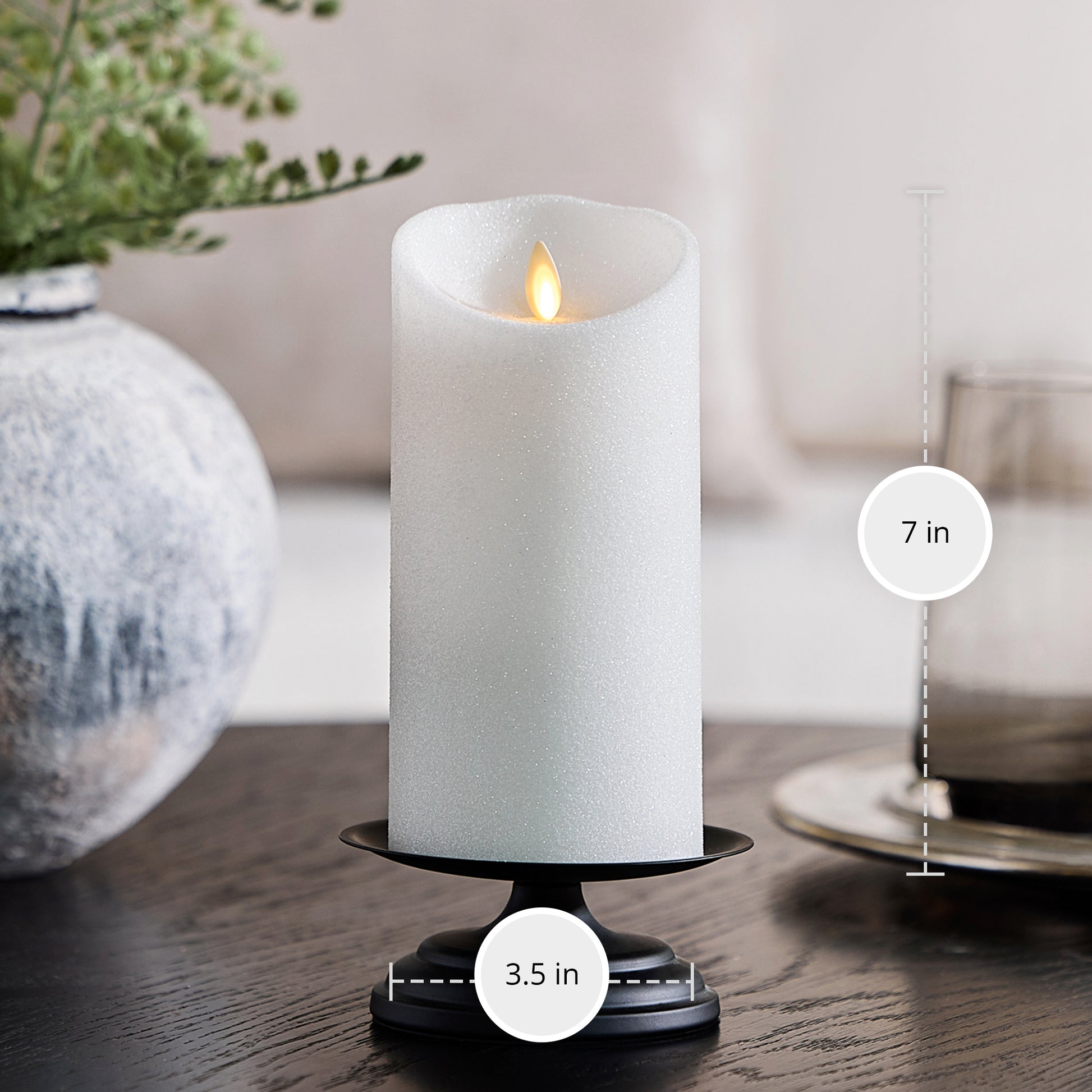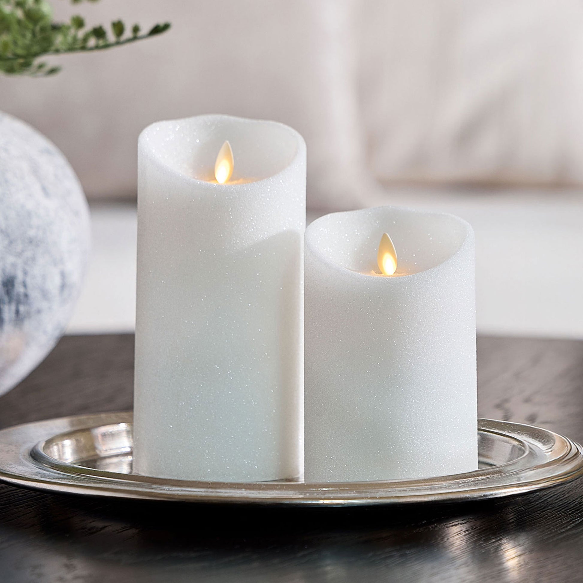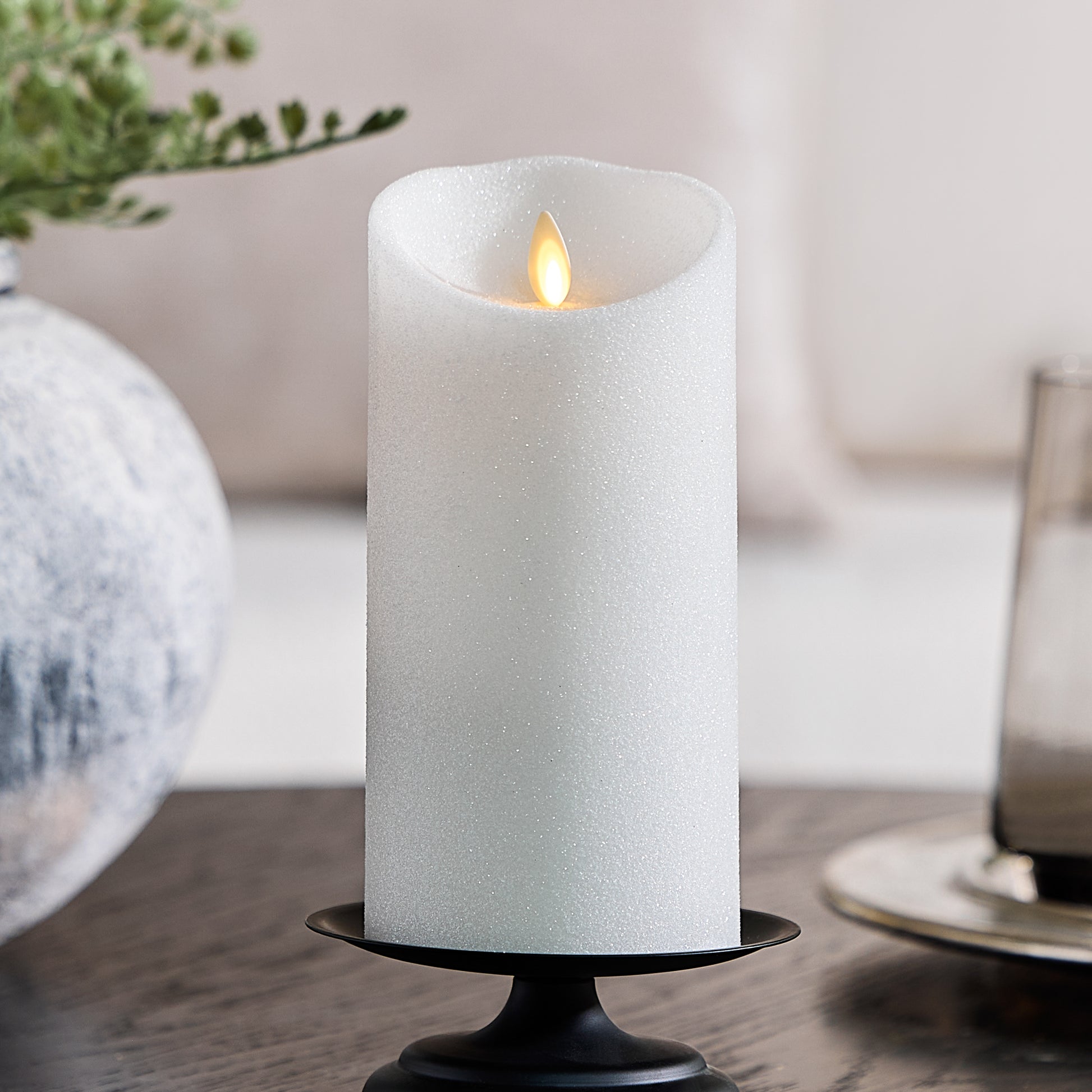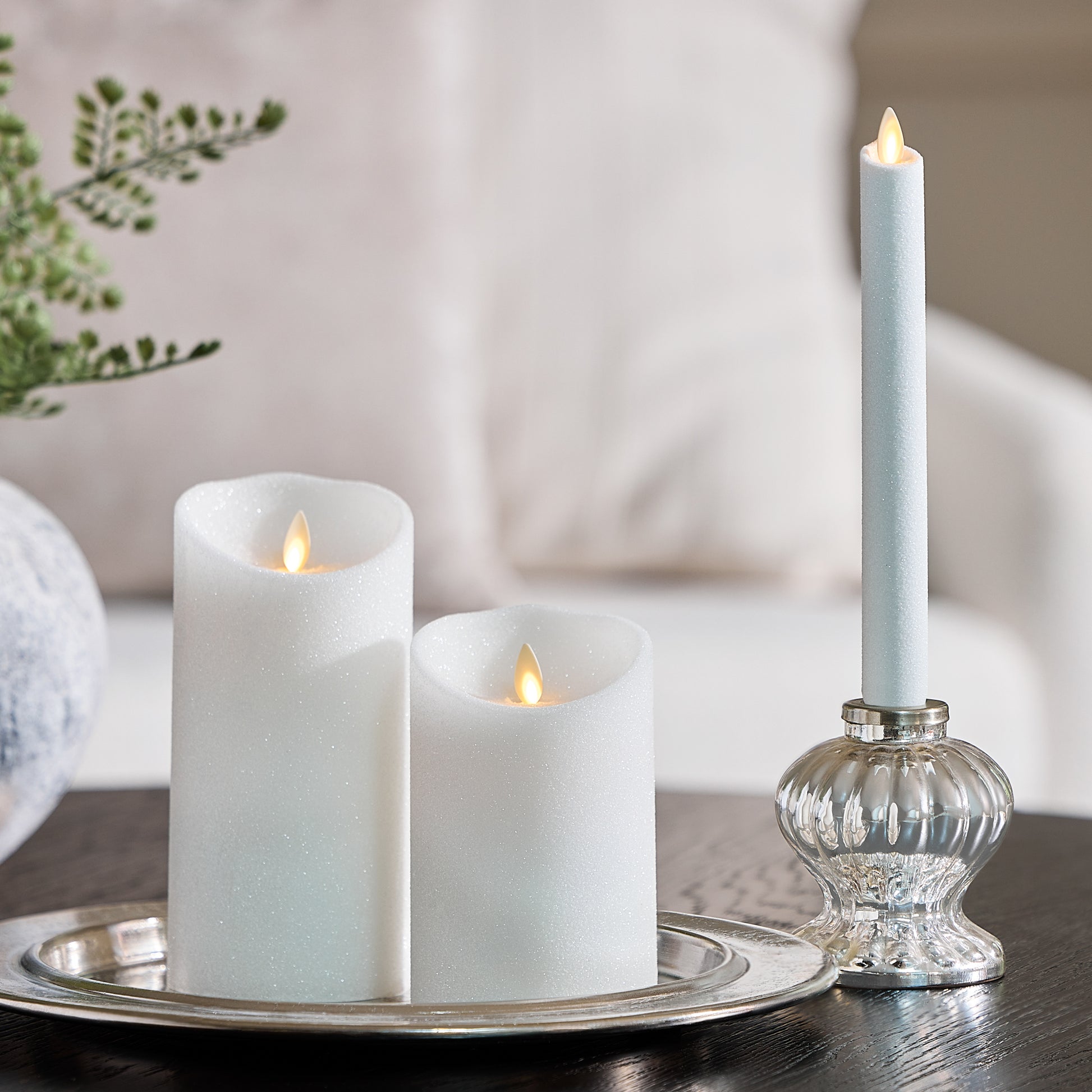 The Dazzling White Glitter Scallop Pillar illuminates with a glistening shimmer and authentic moving-flame technology. The pillar is available in two sizes and has a bright white glitter finish that will not rub off and amplifies the candle’s luminous glow and shine. These pillars look stunning on their own or when staggered together across coffee tables or on bookshelves for a pop of shimmering light.Technical Specifications
