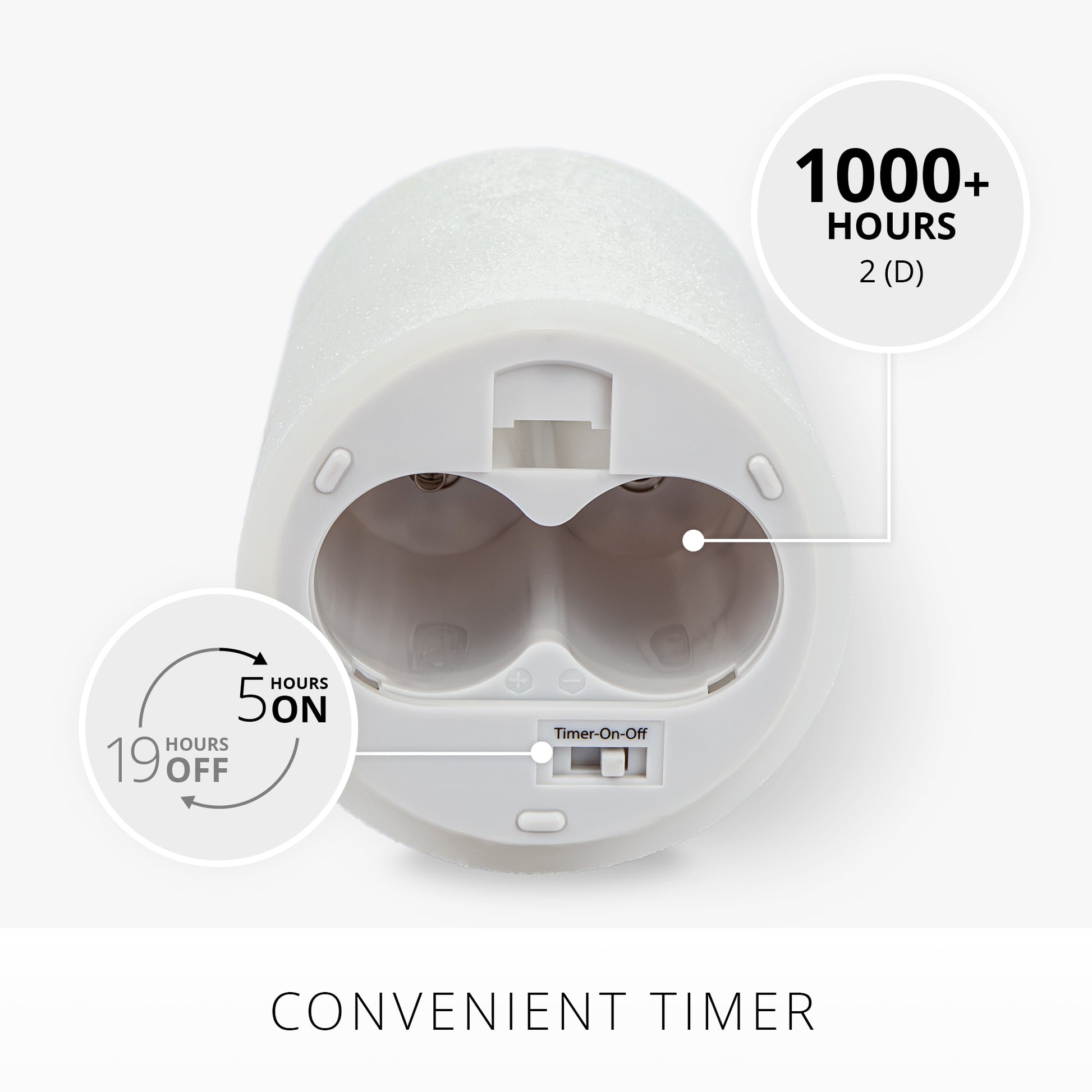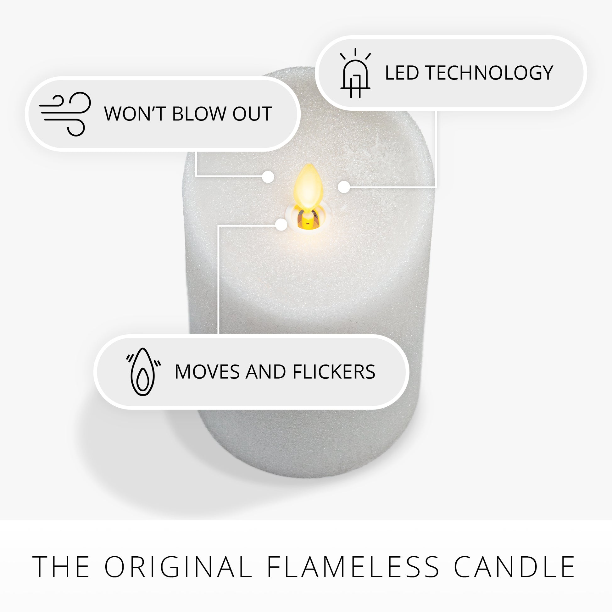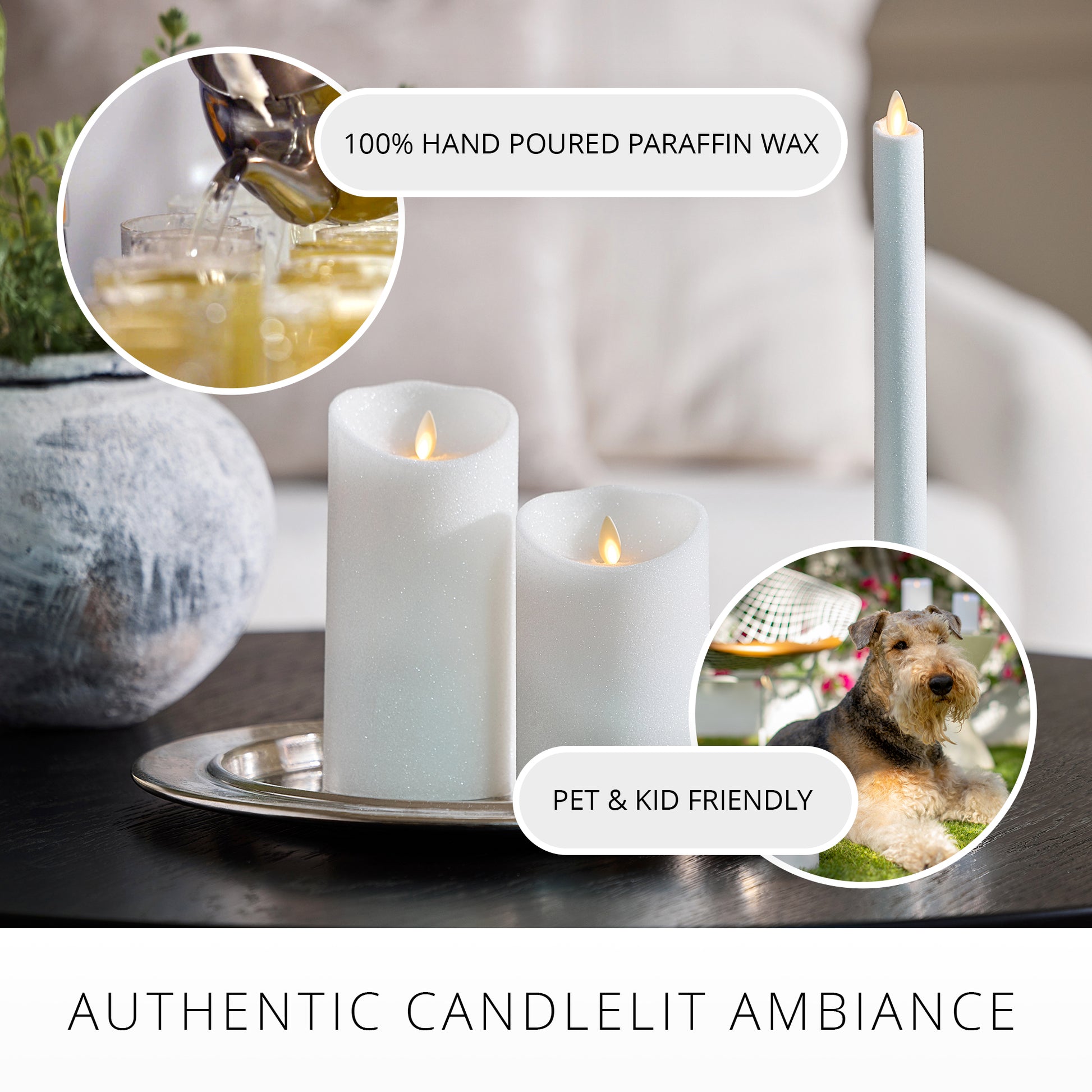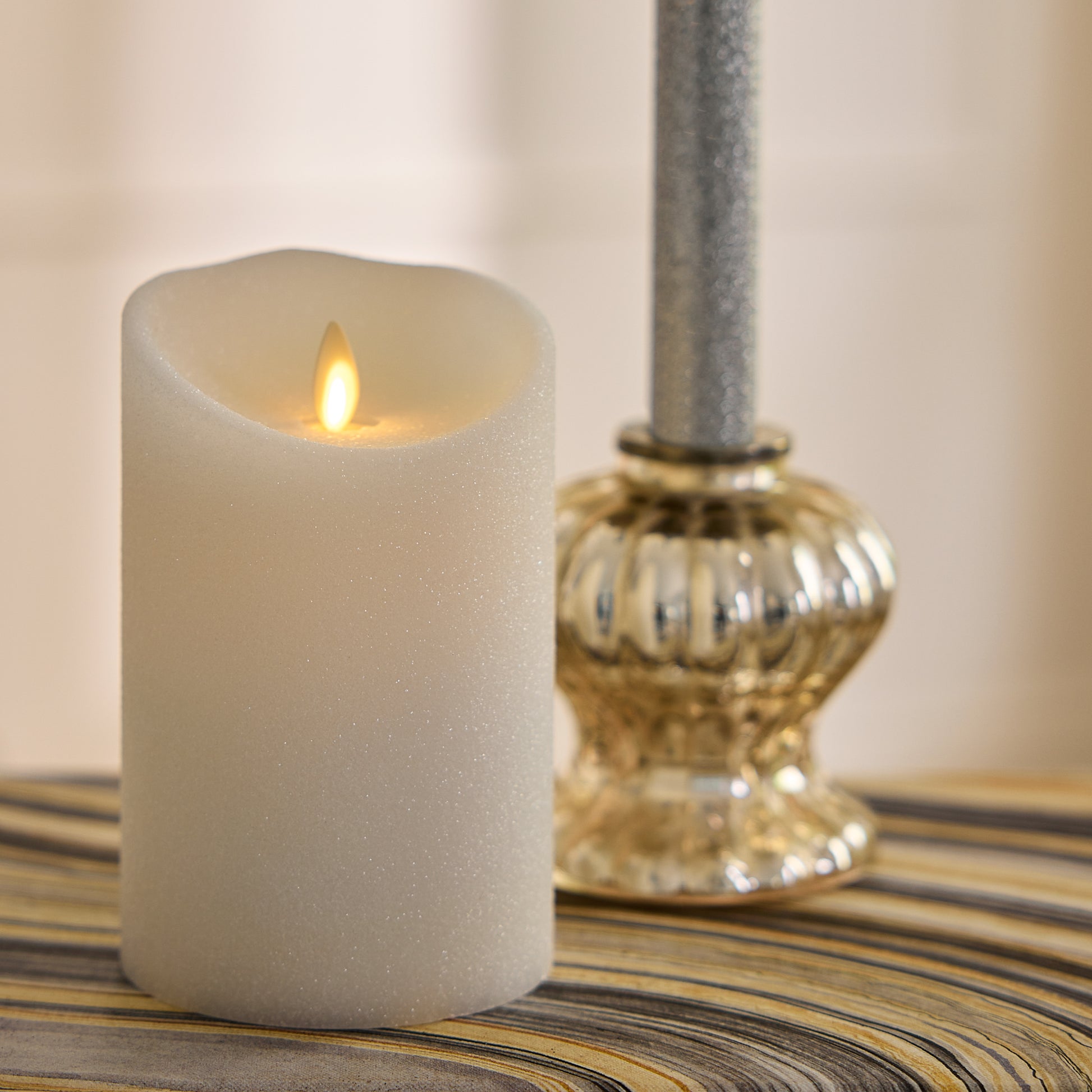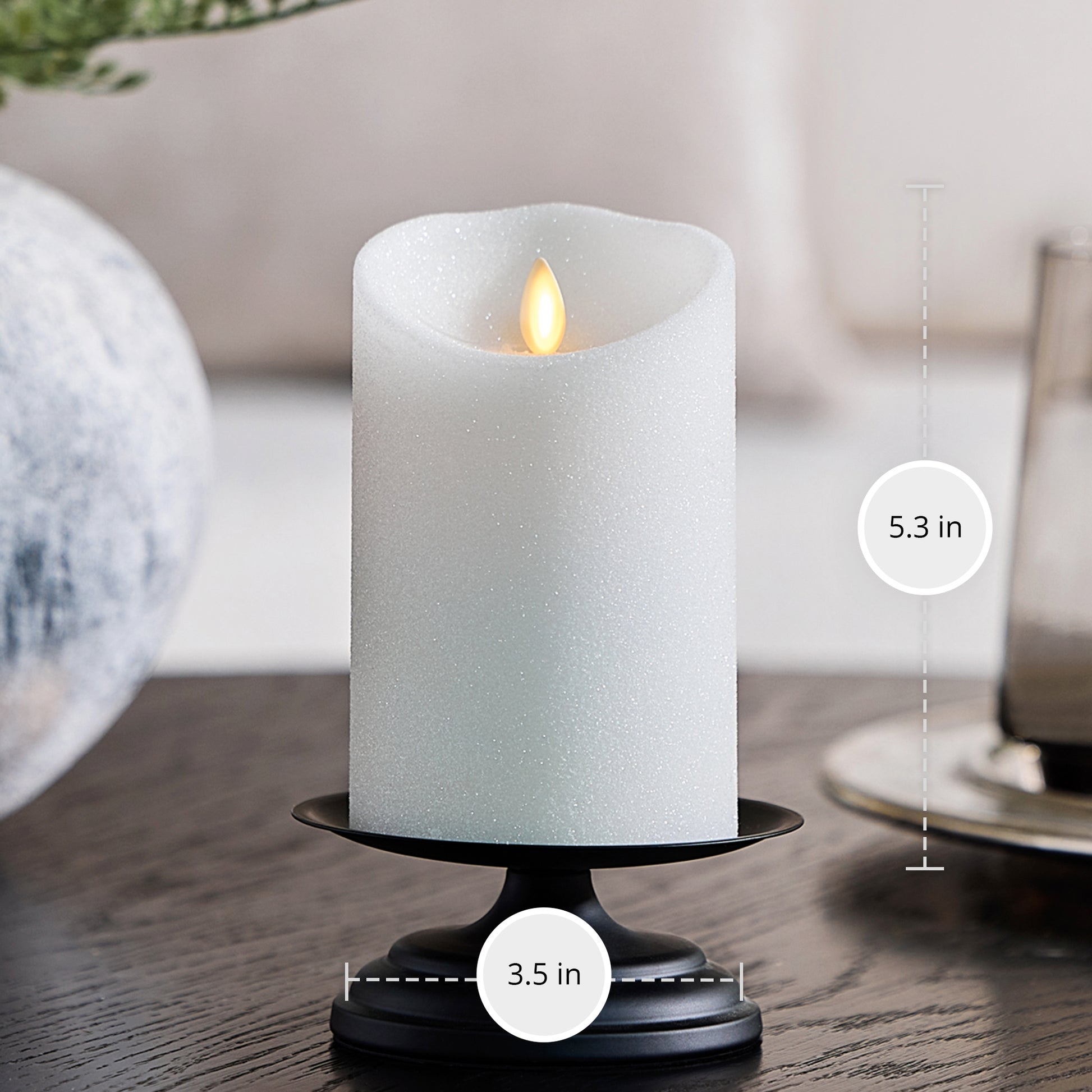 The Dazzling White Glitter Scallop Pillar illuminates with a glistening shimmer and authentic moving-flame technology. The pillar is available in two sizes and has a bright white glitter finish that will not rub off and amplifies the candle’s luminous glow and shine. These pillars look stunning on their own or when staggered together across coffee tables or on bookshelves for a pop of shimmering light.Technical Specifications
