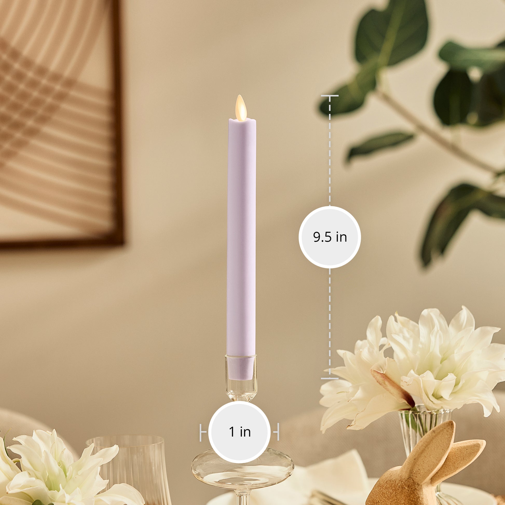 Create an elegant and soothing atmosphere throughout your Easter celebrations with our Gentle Lavender Taper. Complete with patented moving-flame technology, this soft pastel purple taper is dipped in genuine wax and has a smooth finish with a melted top relief. The magical glow and gentle color of the taper is a stunning compliment to Easter table centerpieces and also makes a chic accessory to other spring-themed decorations in need of festive and worry-free candlelight.Technical Specifications