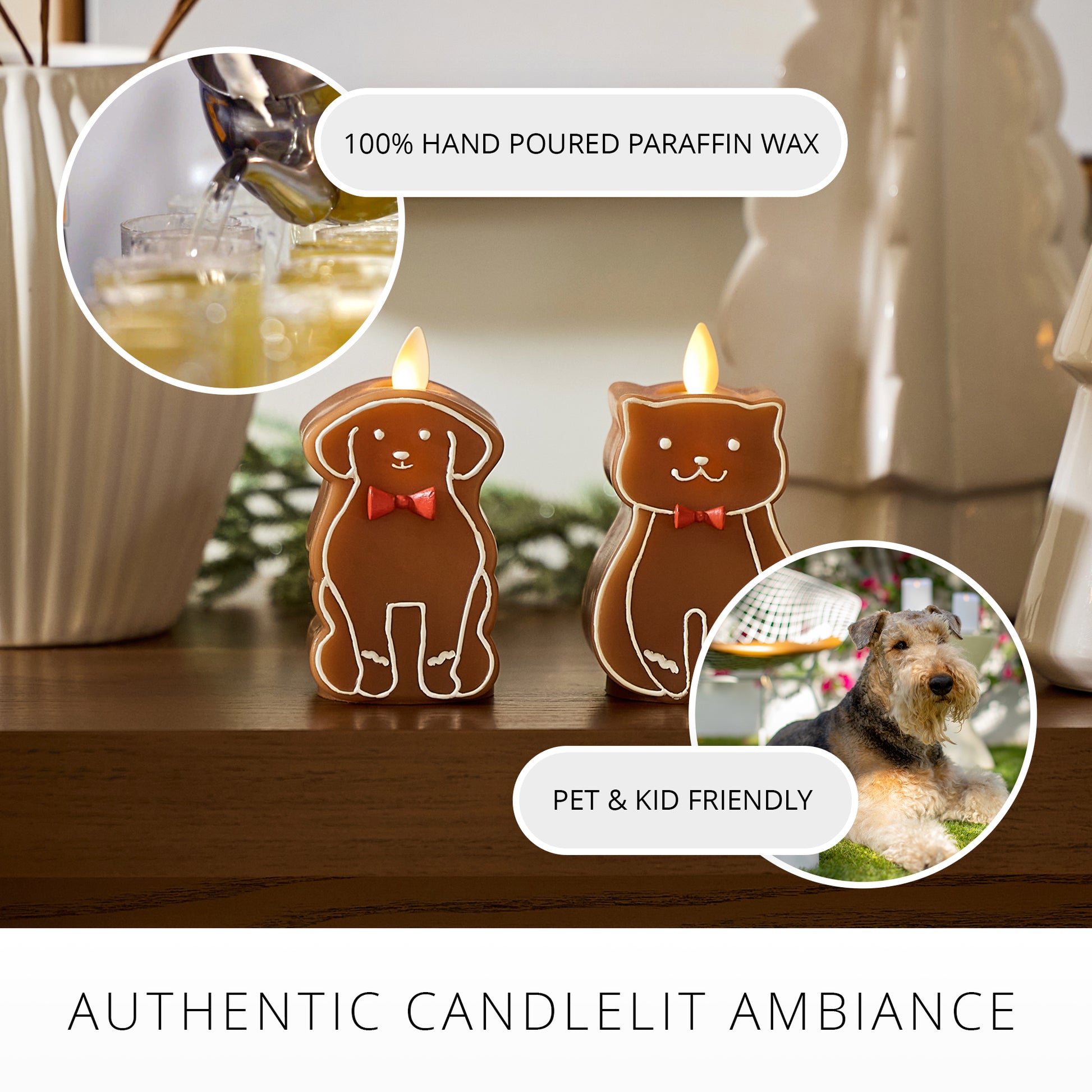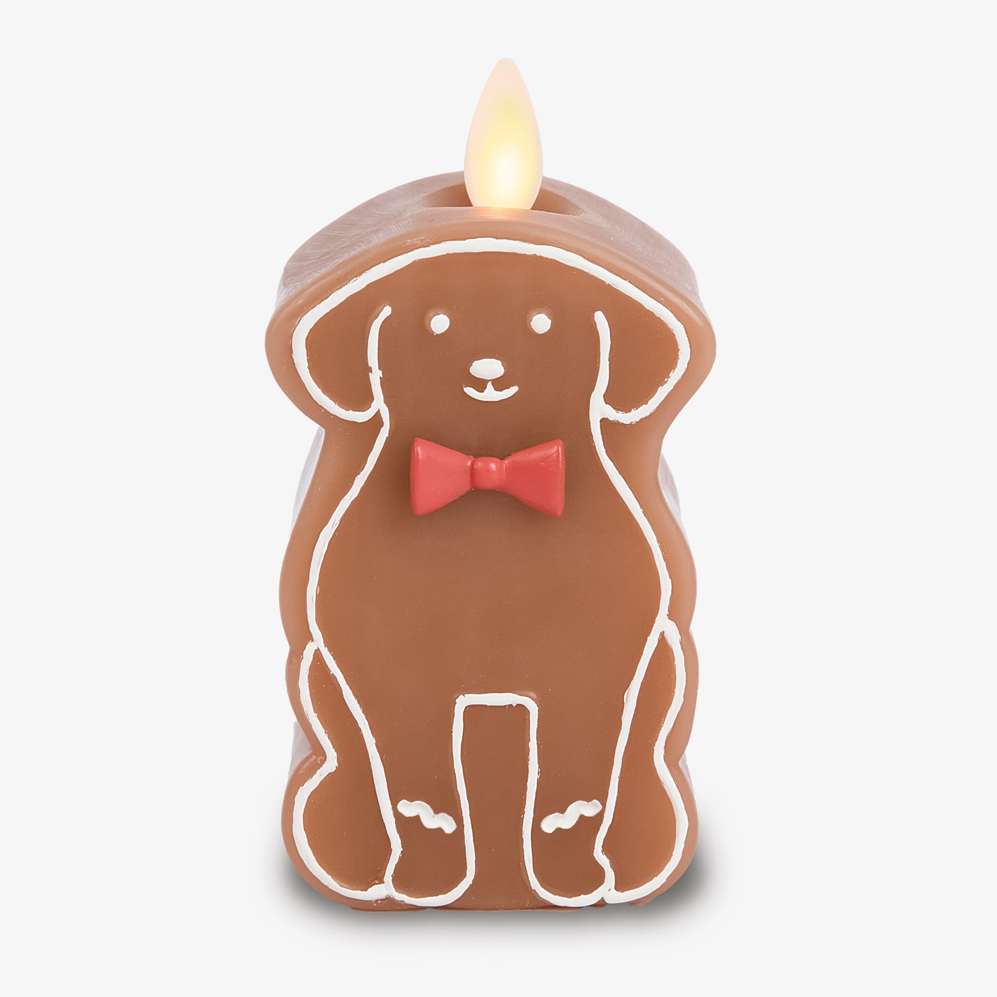Designed for animal lovers, our Gingerbread Dog makes a joyful and bright addition to holiday decorations. Hand-poured with premium wax in a warm brown sugar color, each flameless candle is shaped like a gingerbread cookie cut-out and finished with hand-painted white frosting details resembling a dog with a jolly red bowtie. Glowing with moving-flame technology, this flameless candle pairs well with the Luminara Gingerbread Cat for a holiday candlelight that is safe and convenient, especially around little ones and pets.