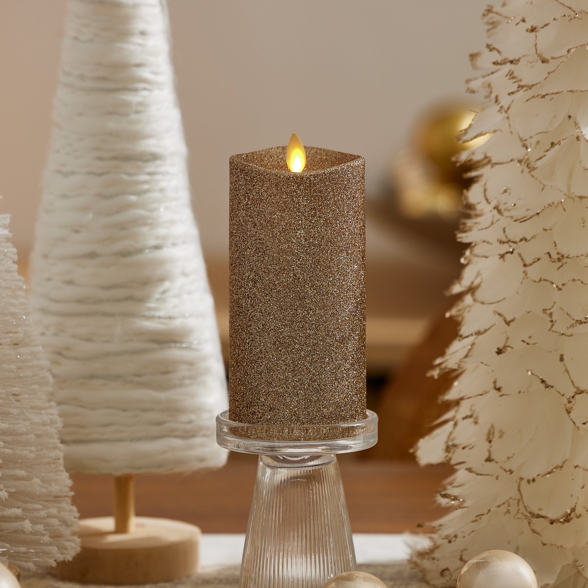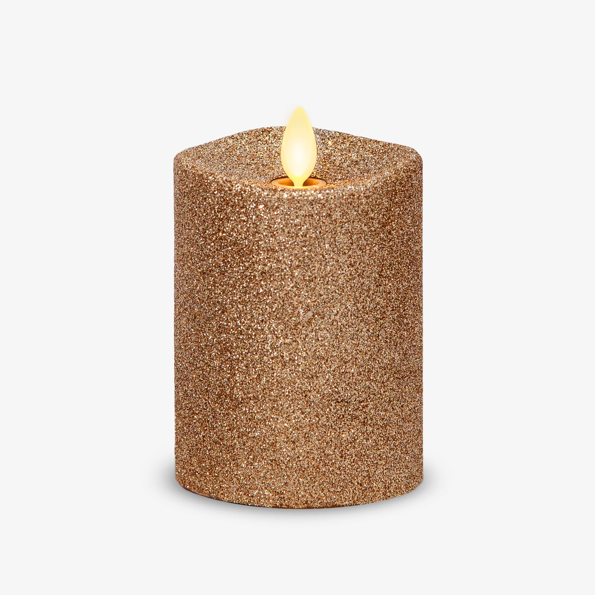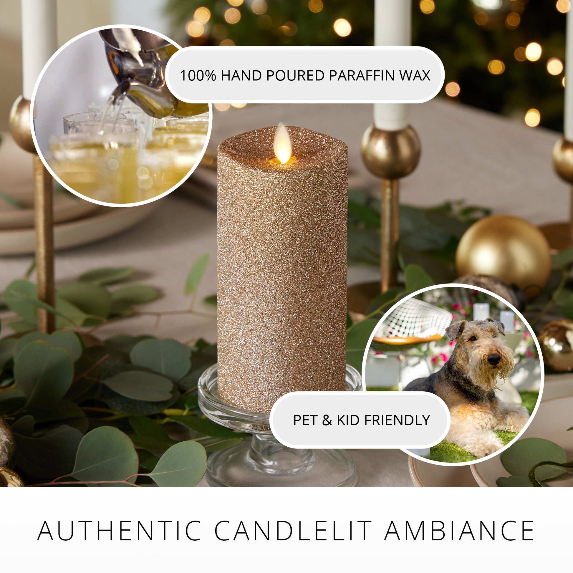 When you turn on your Flameless Gold Glitter Candle Pillar, the glitter shimmers in the light from patented moving flame technology. A "melted" edge accentuates the traditional look. Arrange this paraffin wax with bronze, brass and antique decor that reflects the flickering Flame-Effect, filling the room with comforting warmth.