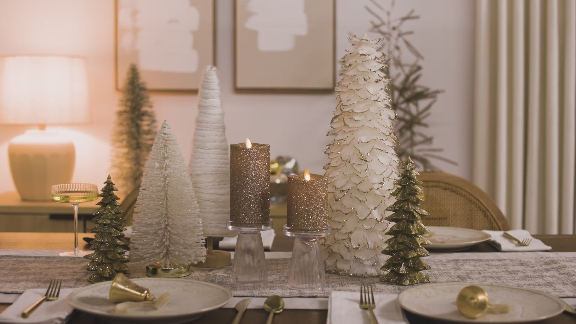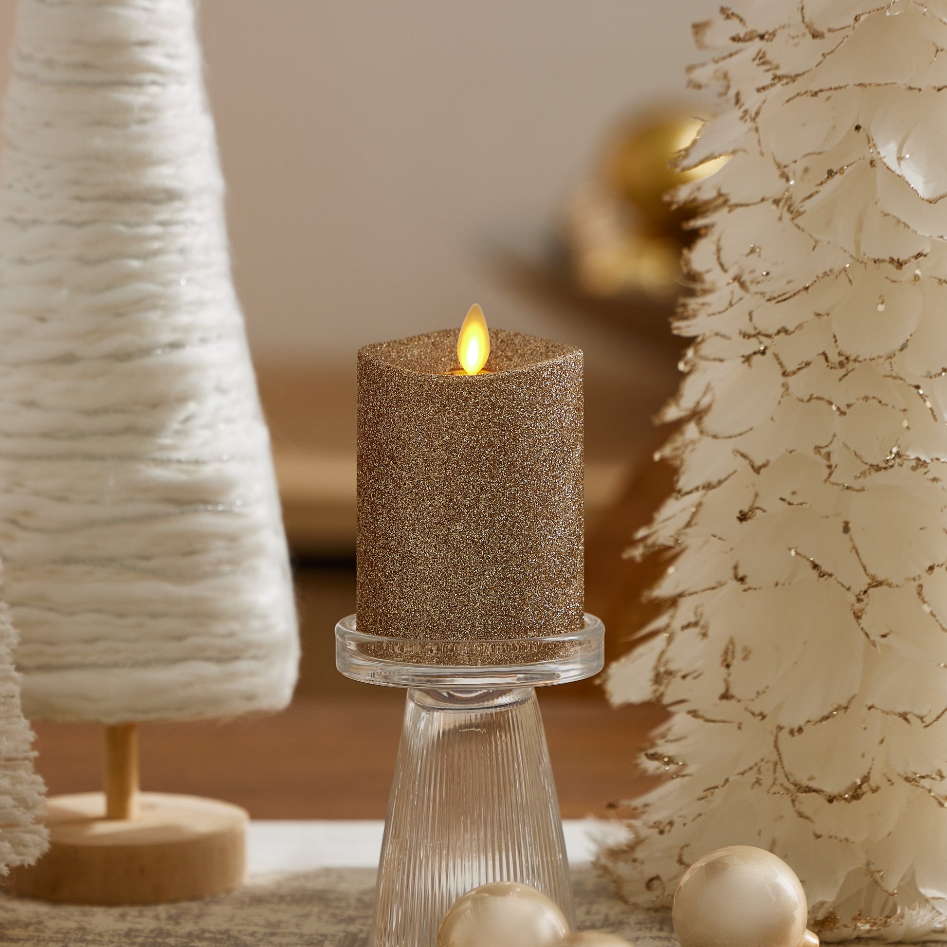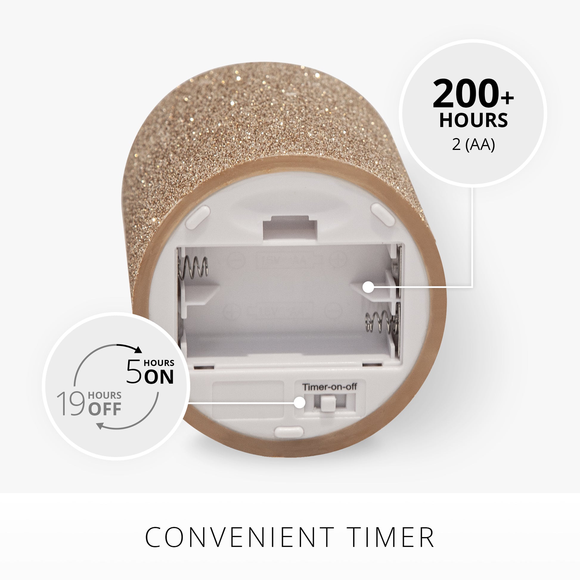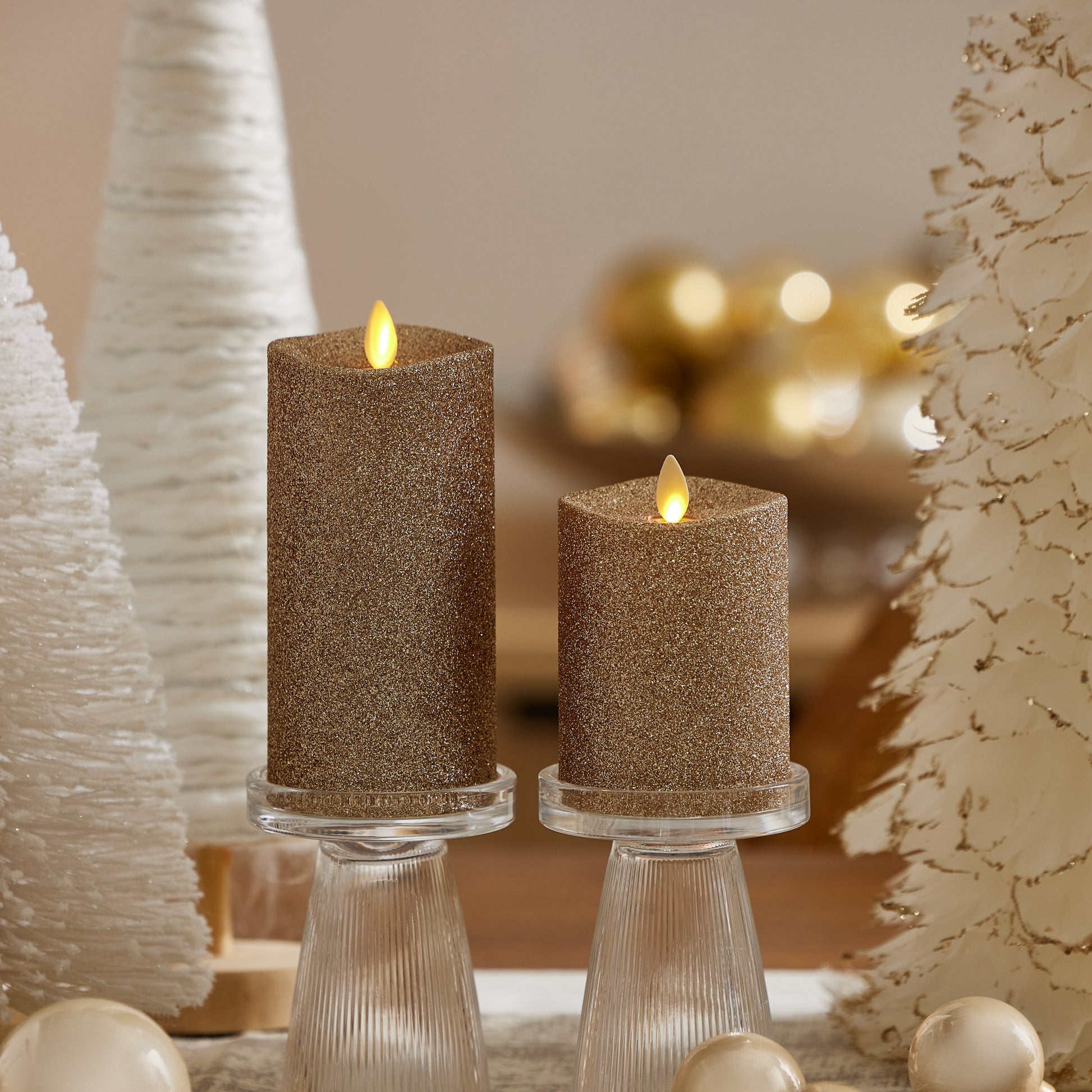 When you turn on your Flameless Gold Glitter Candle Pillar, the glitter shimmers in the light from patented moving flame technology. A "melted" edge accentuates the traditional look. Arrange this paraffin wax with bronze, brass and antique decor that reflects the flickering Flame-Effect, filling the room with comforting warmth.