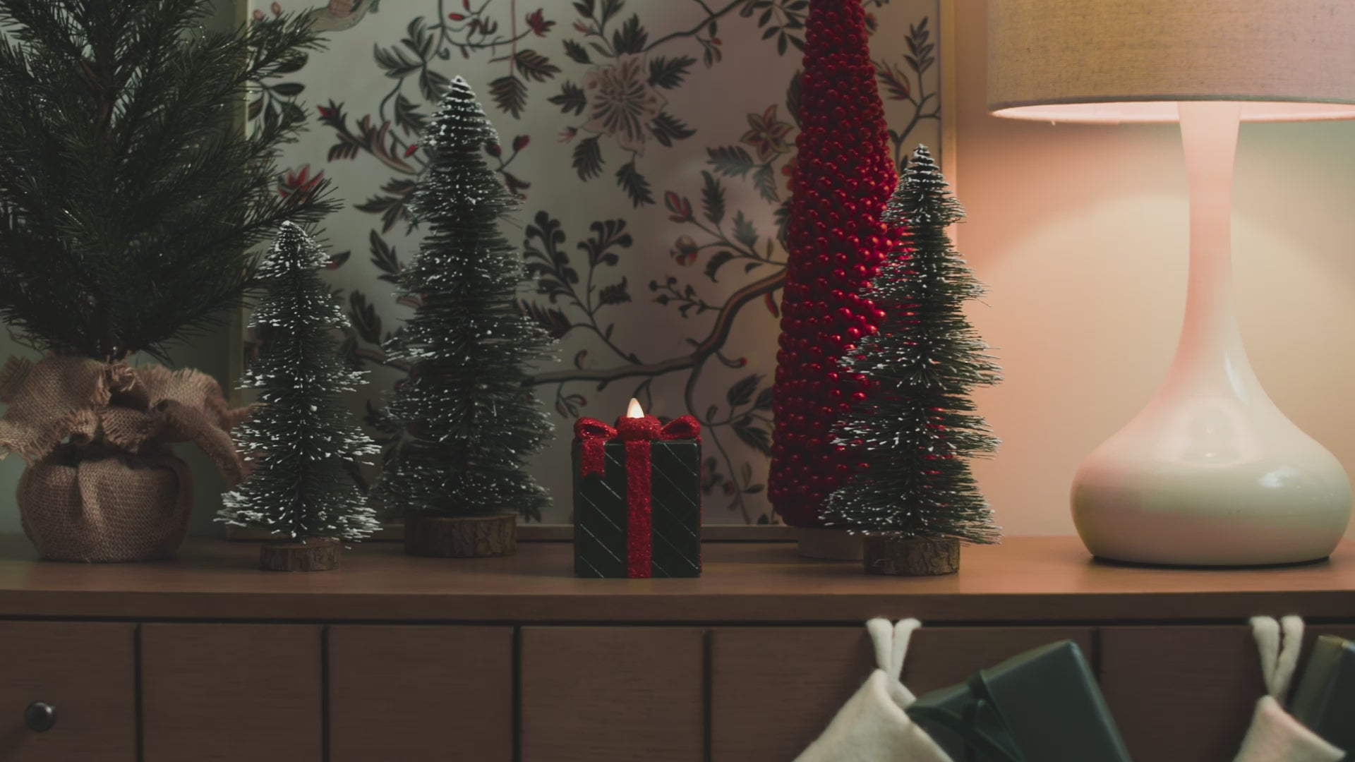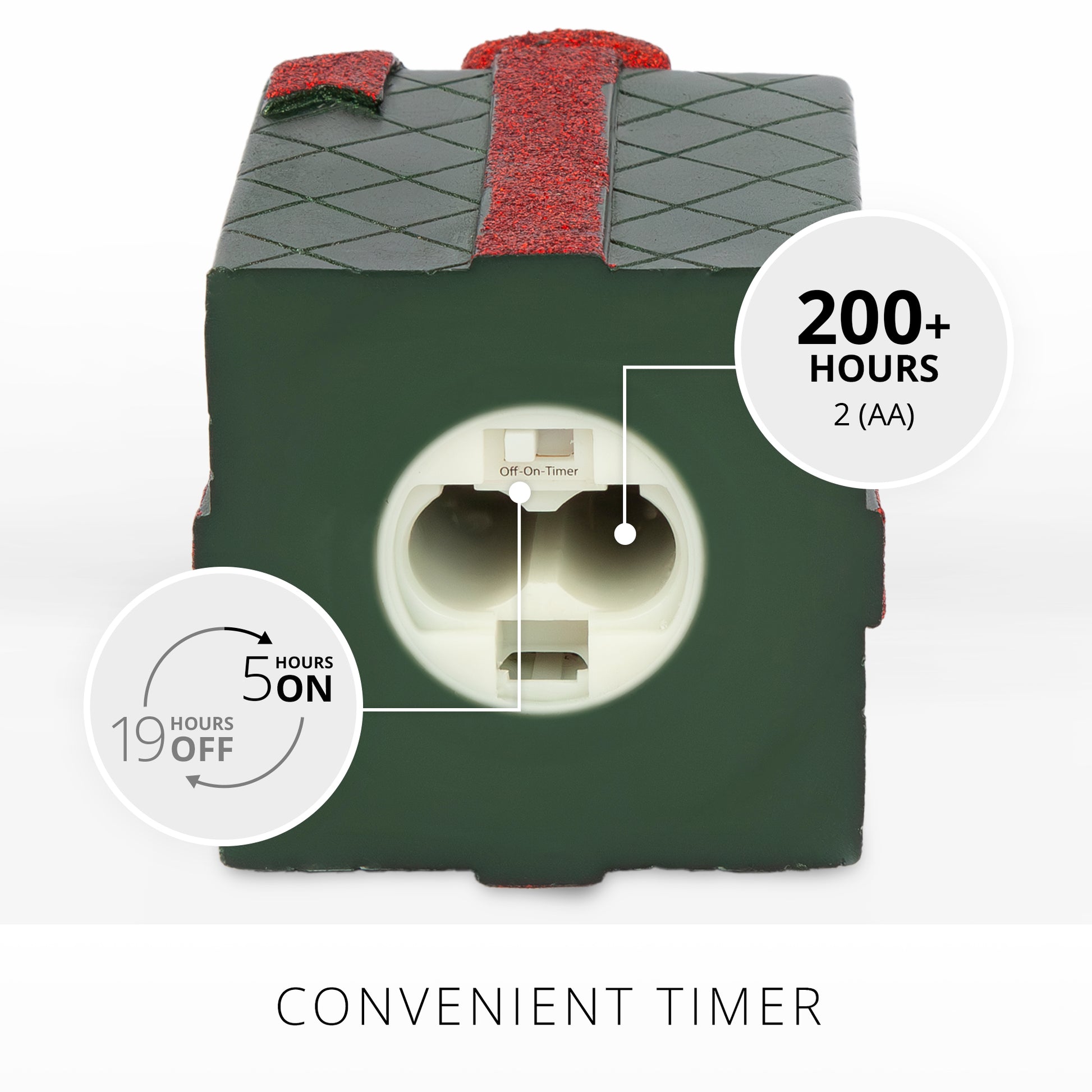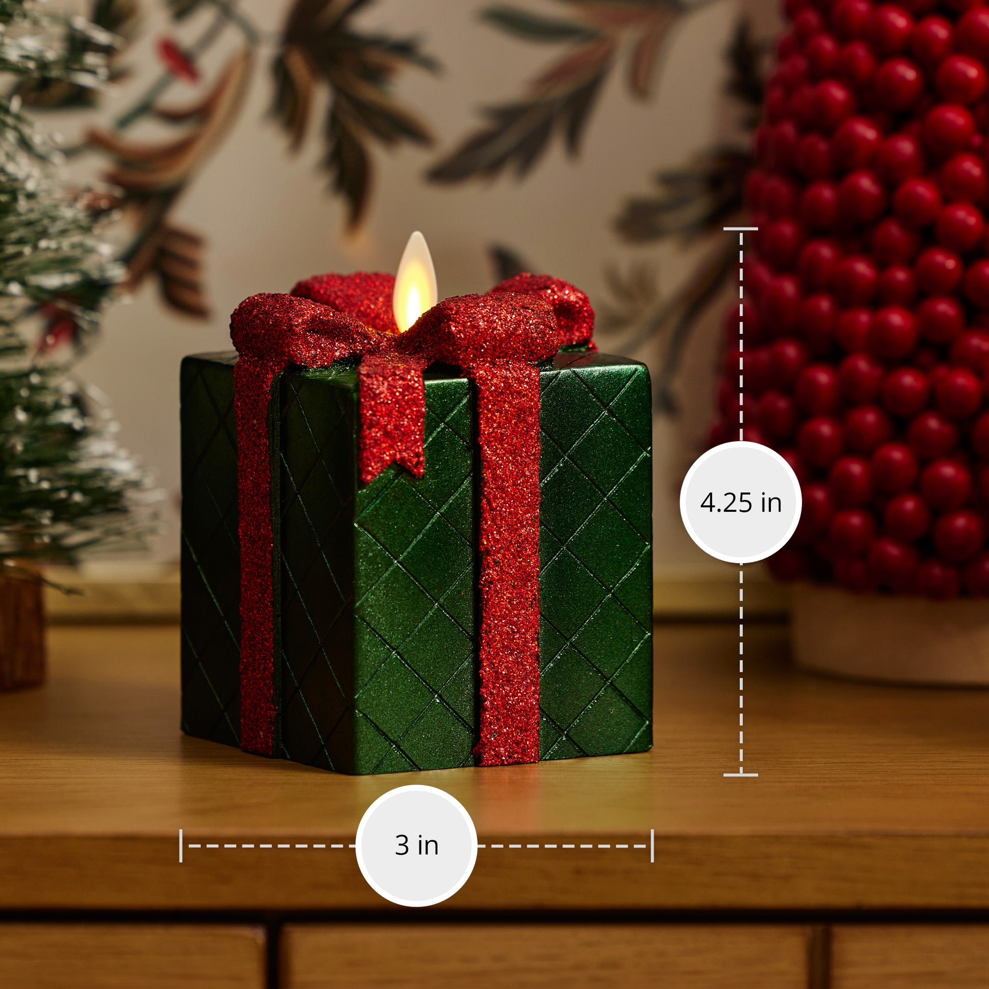Celebrate the joy of giving with the Holiday Green Gift Box with Glitter Ribbon. Equipped with Luminara moving-flame technology, the warm glow of the gift box radiates against the shimmering red glittered ribbon and textured evergreen wrapping paper. Safe and convenient, stage the flameless candle gift boxes under trees or on atop nightstands for a worry-free glow throughout the holiday season.Technical Specifications