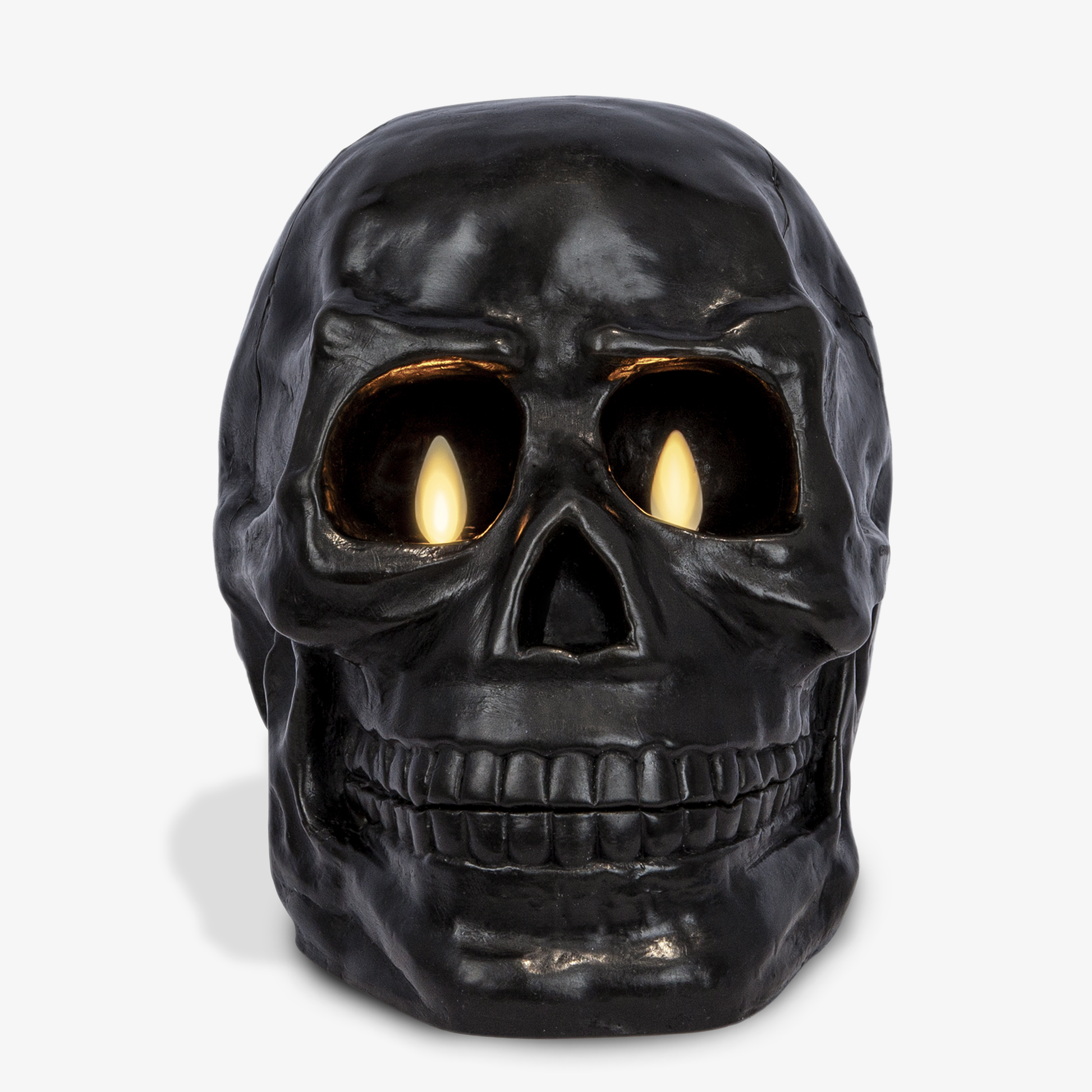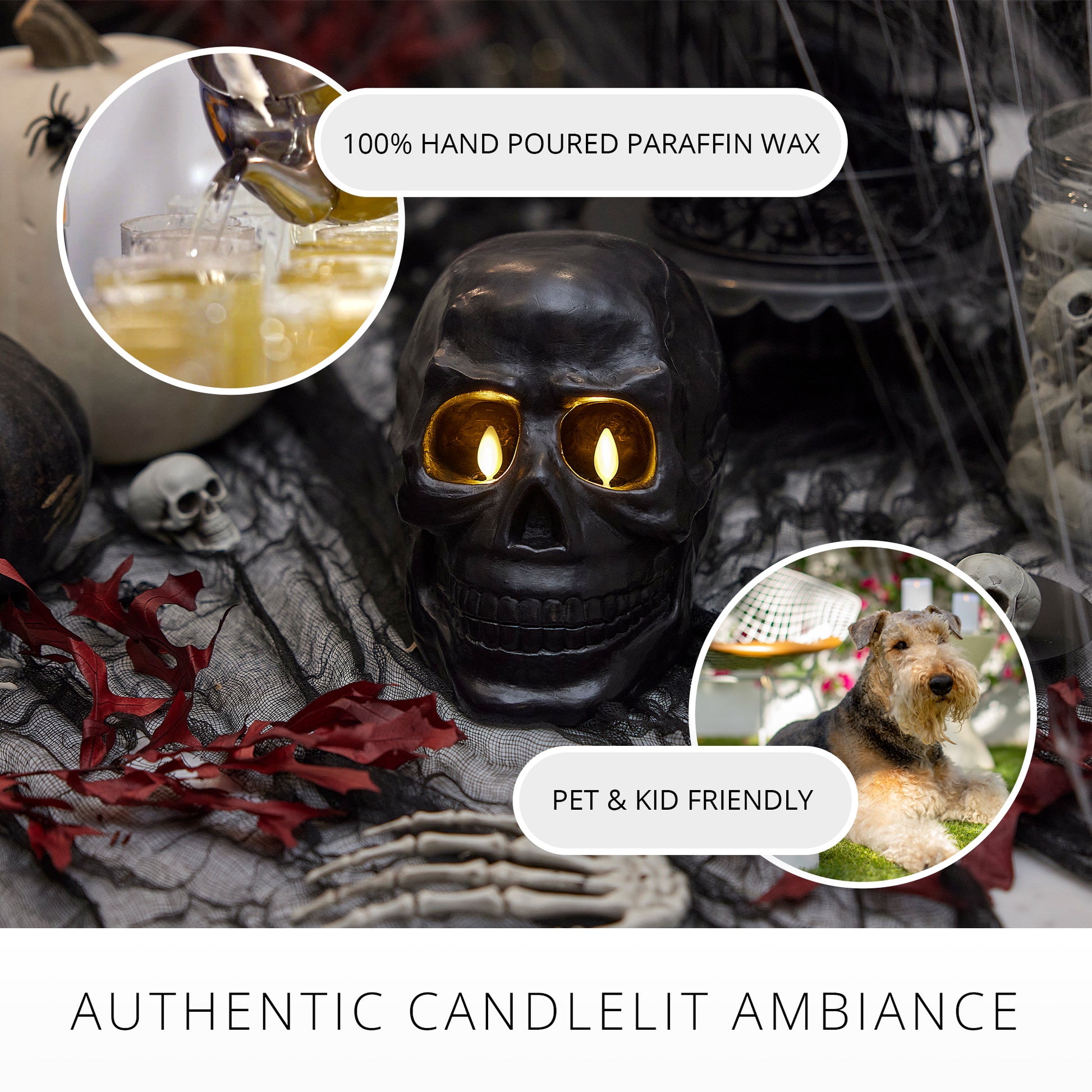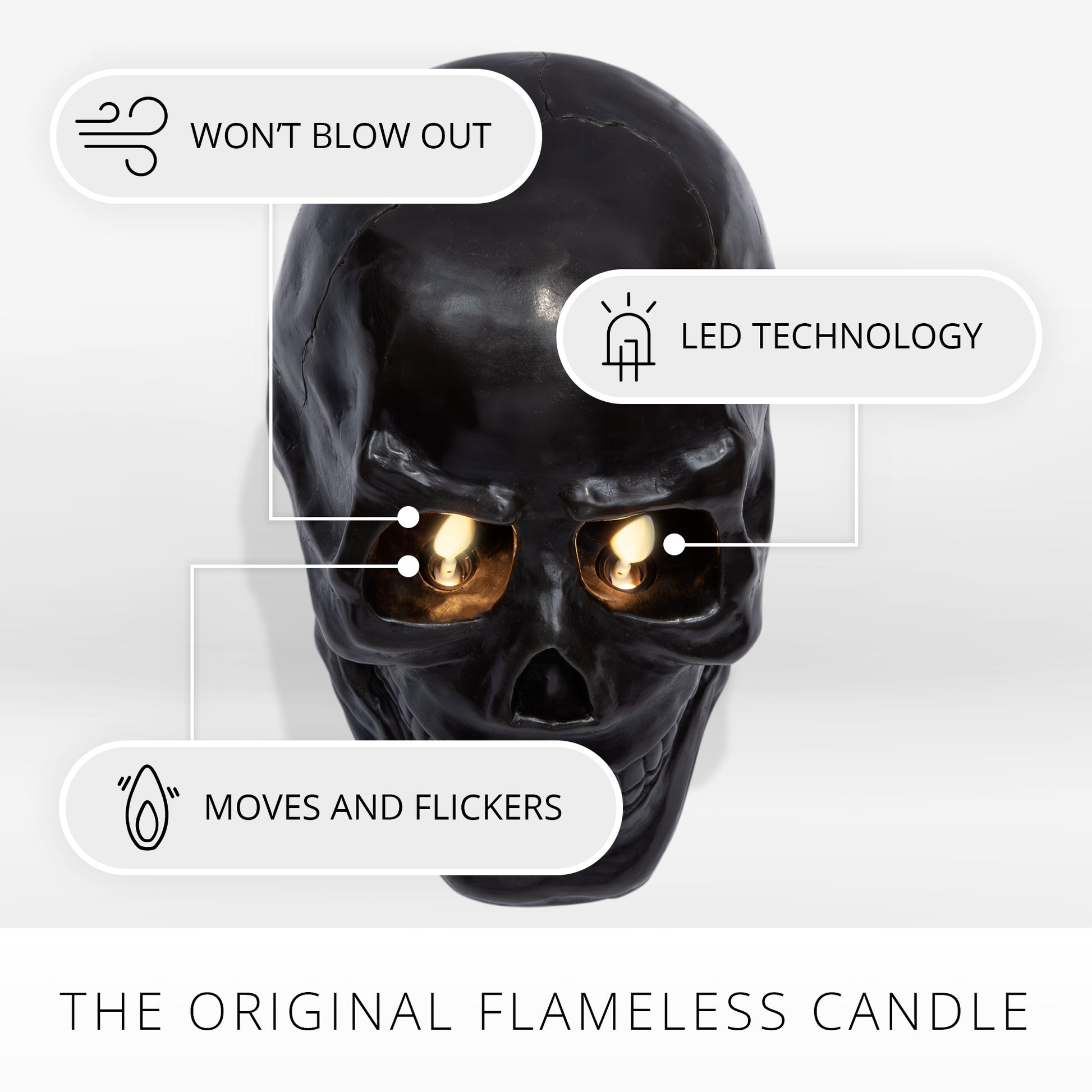 Give your guests a playful fright with the Large Black Flameless Candle Skull. Two flameless lights shine inside the eye sockets, casting an eerie glow across the room. With moving flame technology, this candle offers the traditional flicker without the smoke or melted wax.