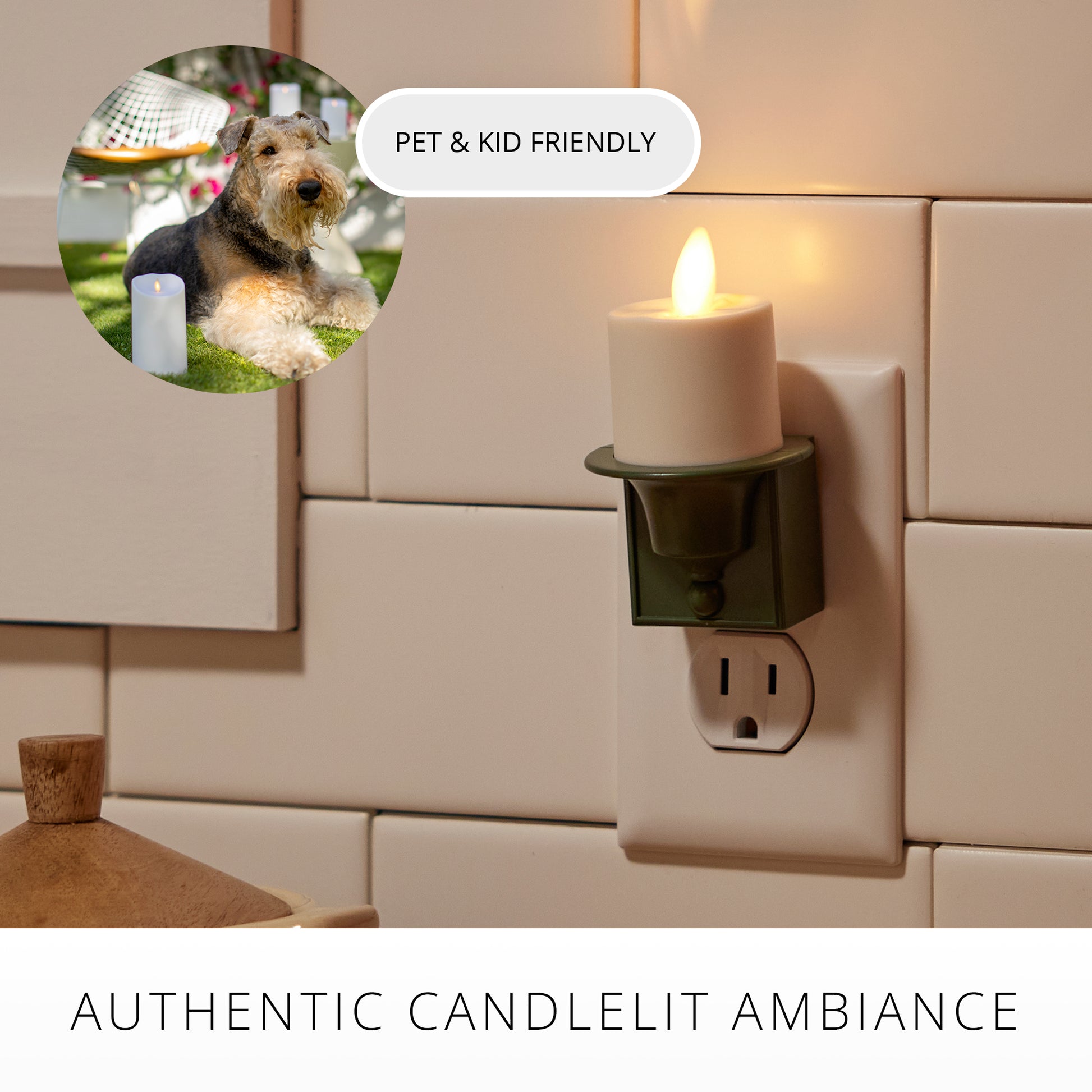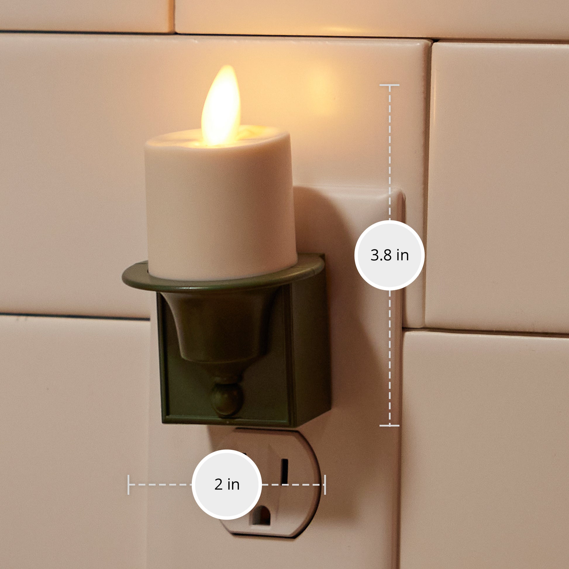 Discover the serene beauty of our Loden Green Nightlight. This nightlight, equipped with a realistic moving flame and dusk to dawn sensor, offers a perfect blend of functionality and style. Crafted from high-quality plastic, it plugs directly into your outlet, delivering a peaceful, candle-like glow in a soothing green shade that enhances any room's atmosphere.Technical Specifications