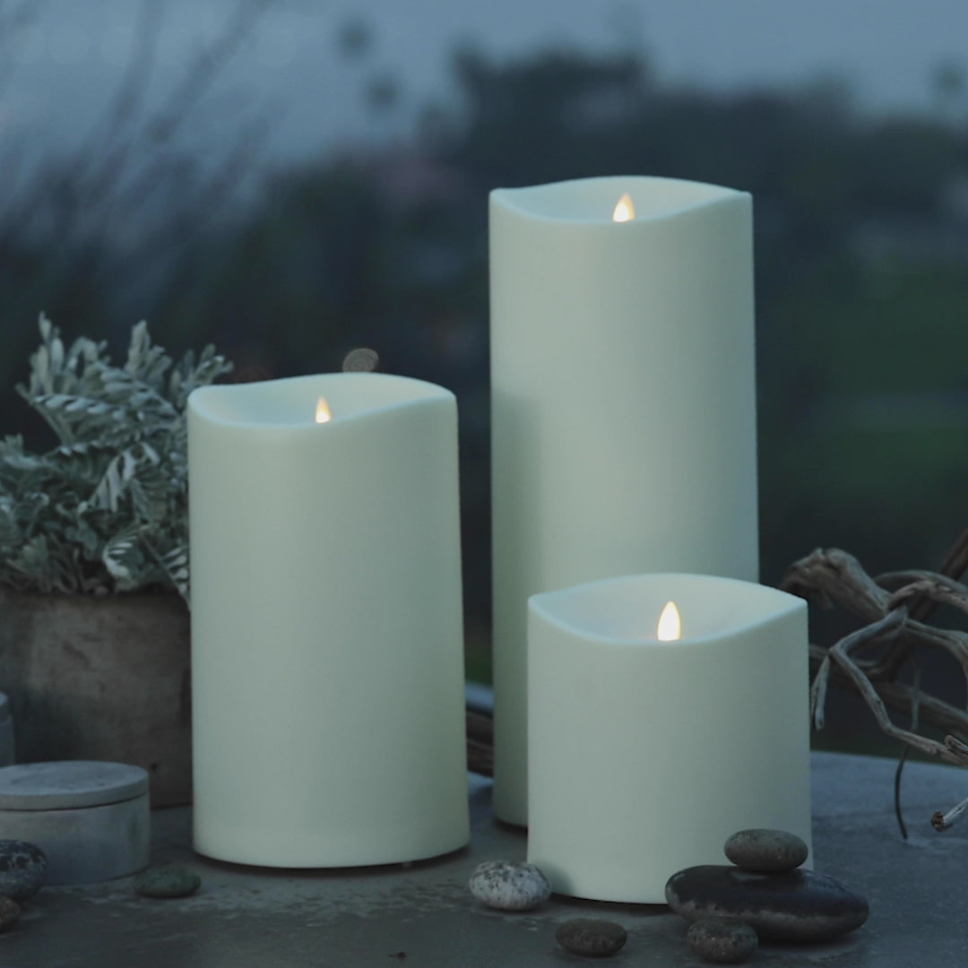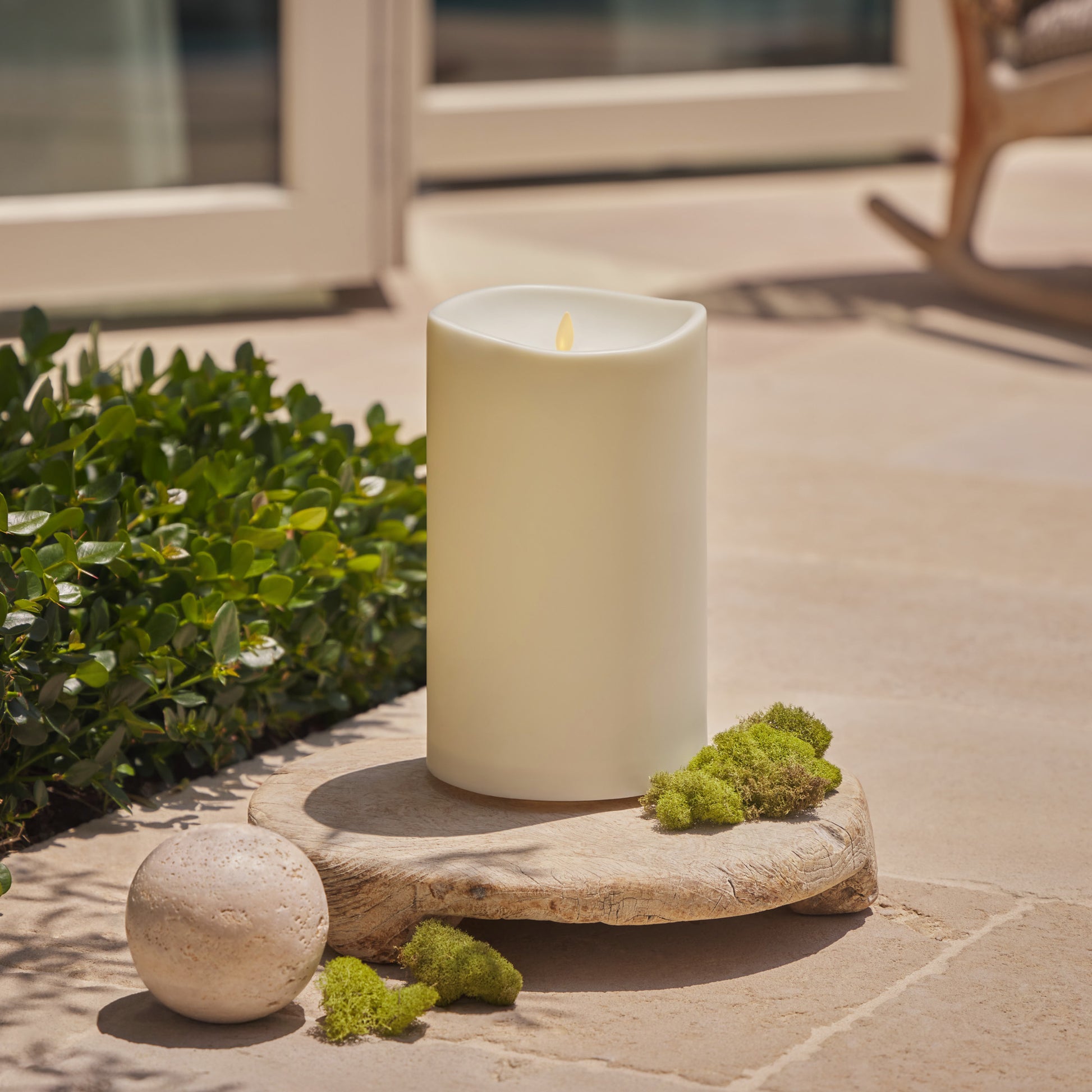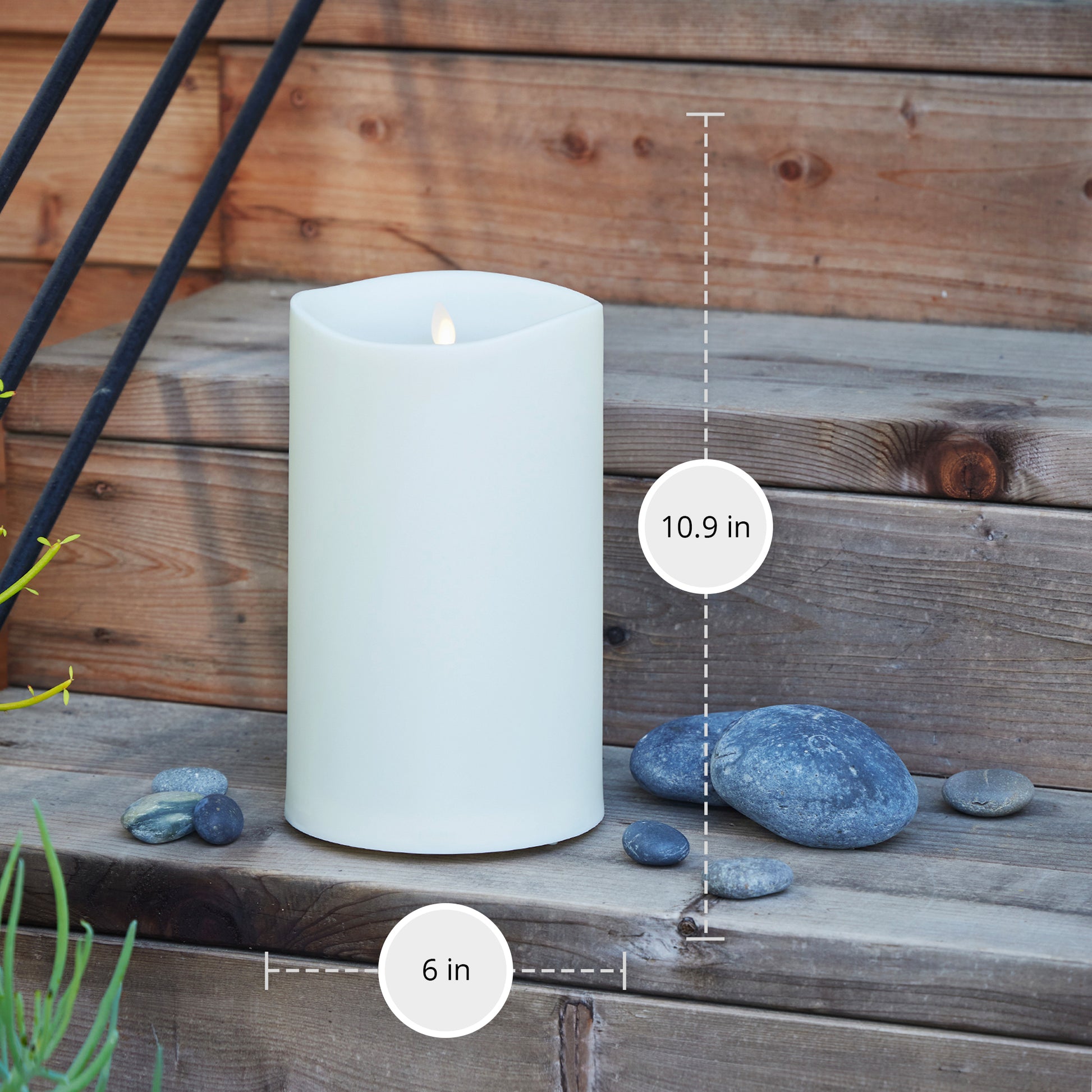 Great for your outdoor decor with a sturdier design but just as stylish as its radiant indoor counterparts. Pearl ivory high-quality plastic with a "melted" top adds a delicate touch to your patio, garden or back porch. Decorate an outdoor wedding, or reconnect with your friends while the realistic moving flame flickers in the darkness. This Outdoor Flameless Candle Pearl Ivory Grand Pillar offers real Flame-Effect technology that recreates the look of a burning candle.