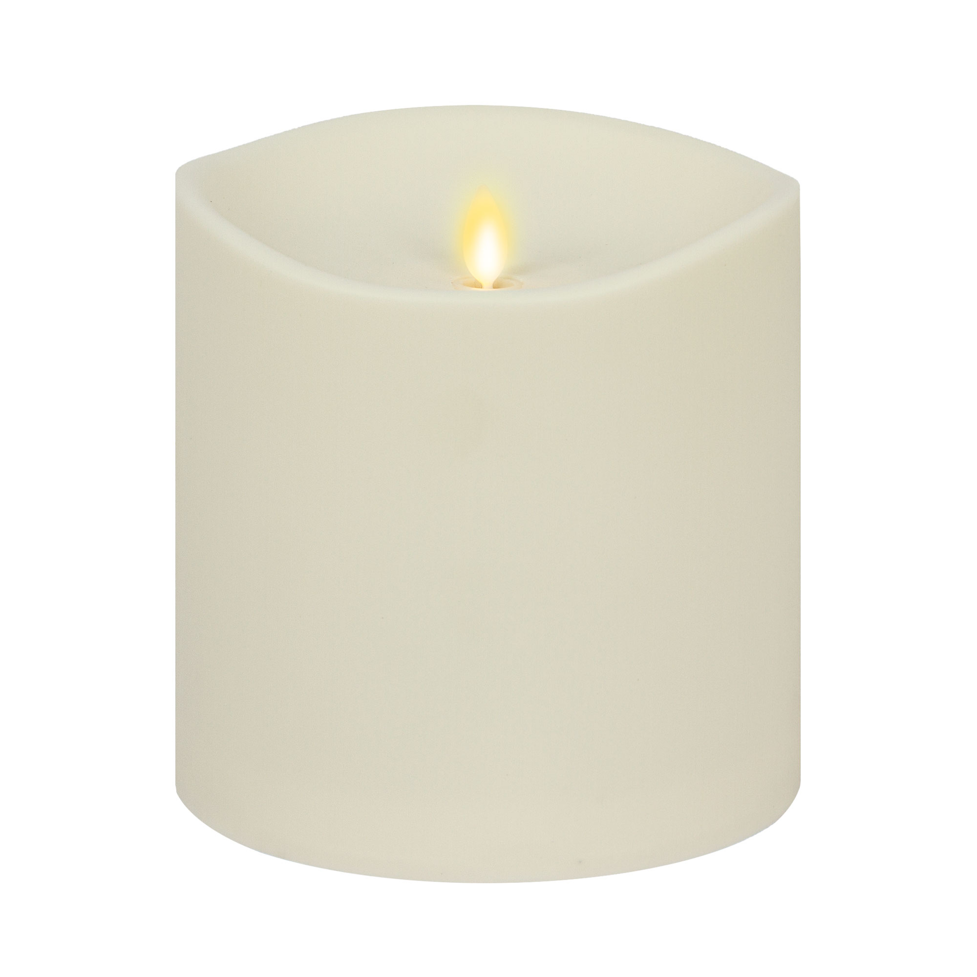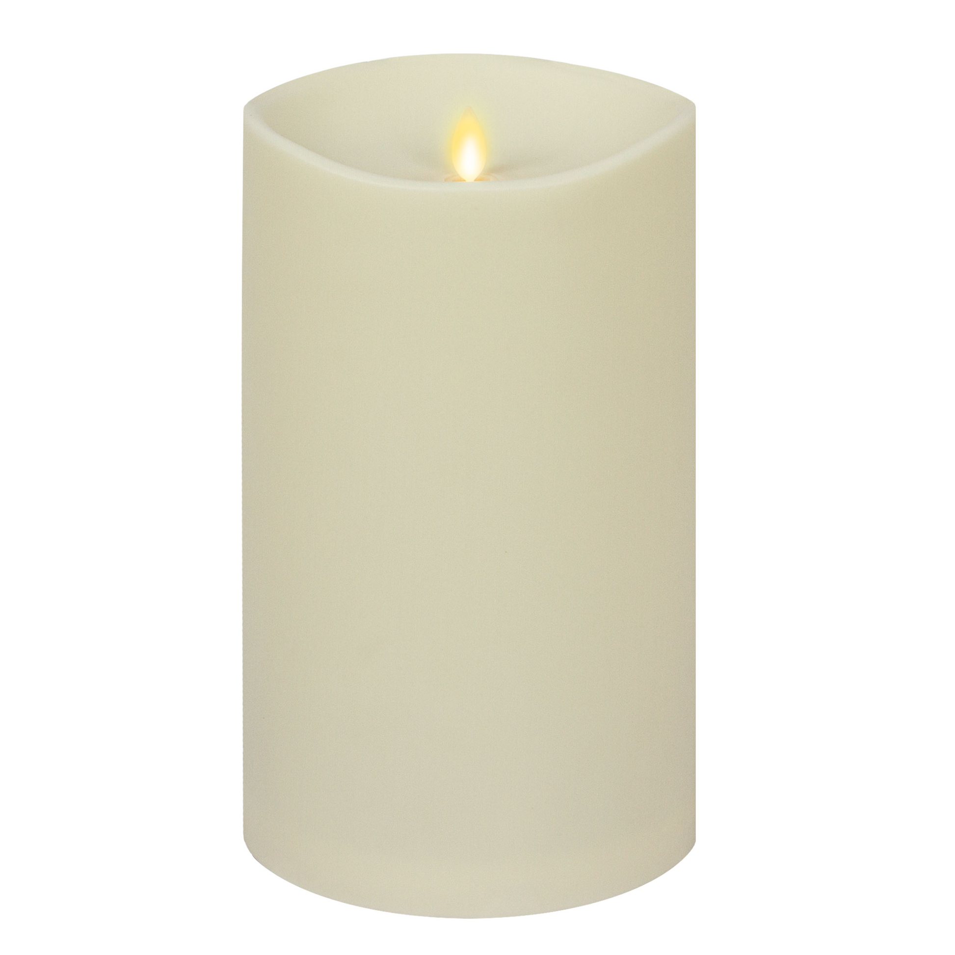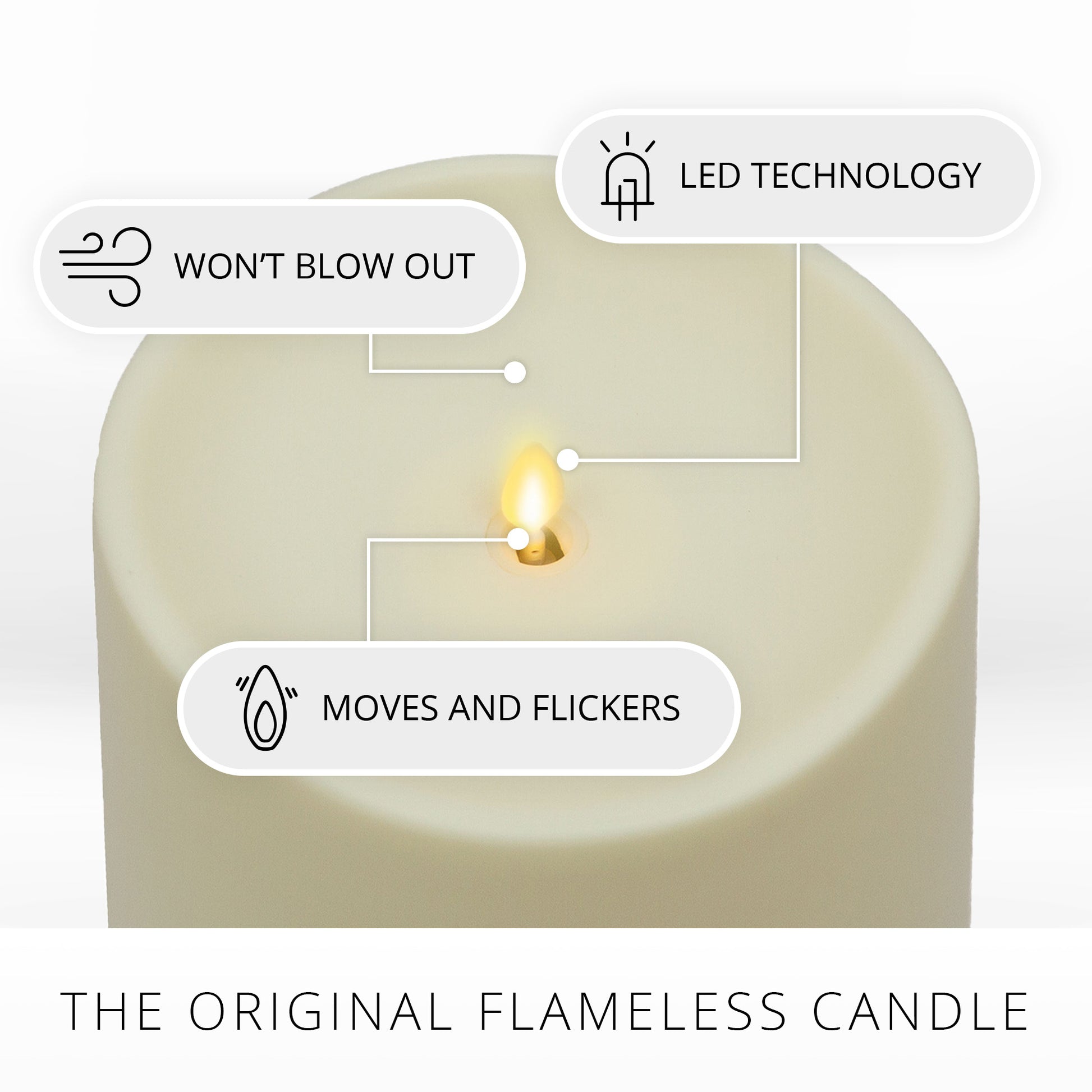 Great for your outdoor decor with a sturdier design but just as stylish as its radiant indoor counterparts. Pearl ivory high-quality plastic with a "melted" top adds a delicate touch to your patio, garden or back porch. Decorate an outdoor wedding, or reconnect with your friends while the realistic moving flame flickers in the darkness. This Outdoor Flameless Candle Pearl Ivory Grand Pillar offers real Flame-Effect technology that recreates the look of a burning candle.