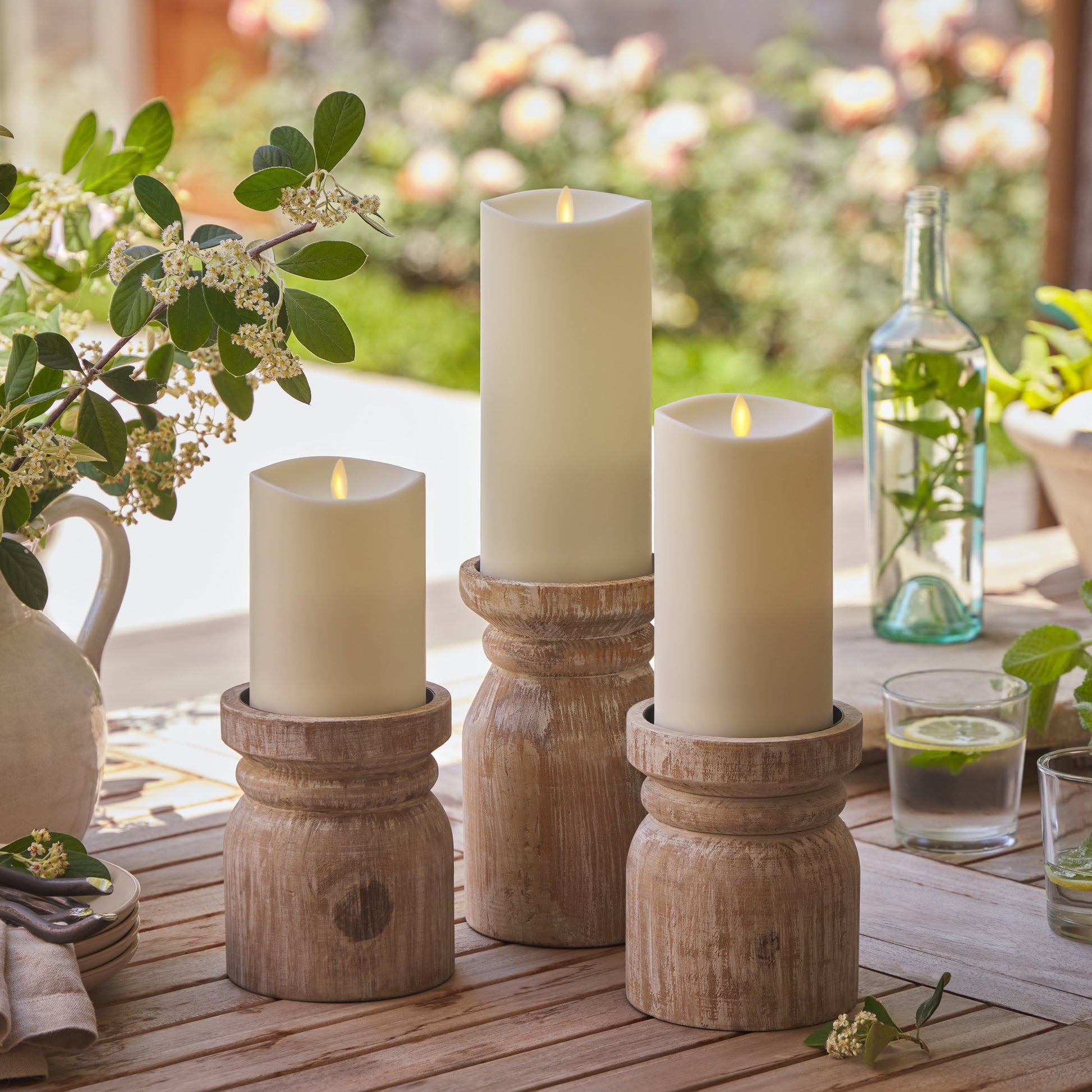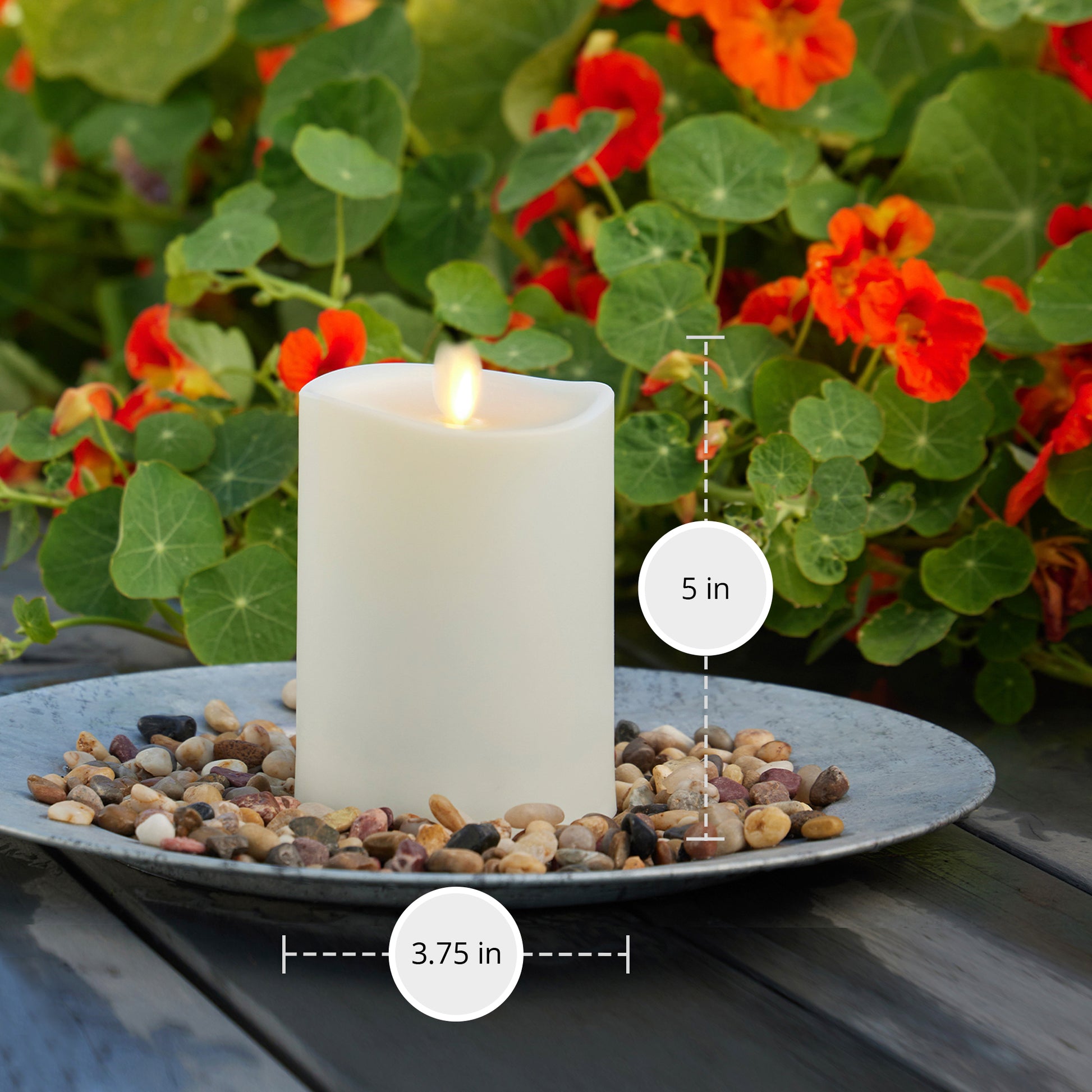 Pair the Outdoor Flameless Ivory Pearl Candle Pillar with a taller candle or potted plant to create an outdoor scene. The authentic moving Flame-Effect keeps your candle glowing through the evening without blowing out in the wind. With a "melted" top, this pearl candle looks gently used--but it never melts down to the base.