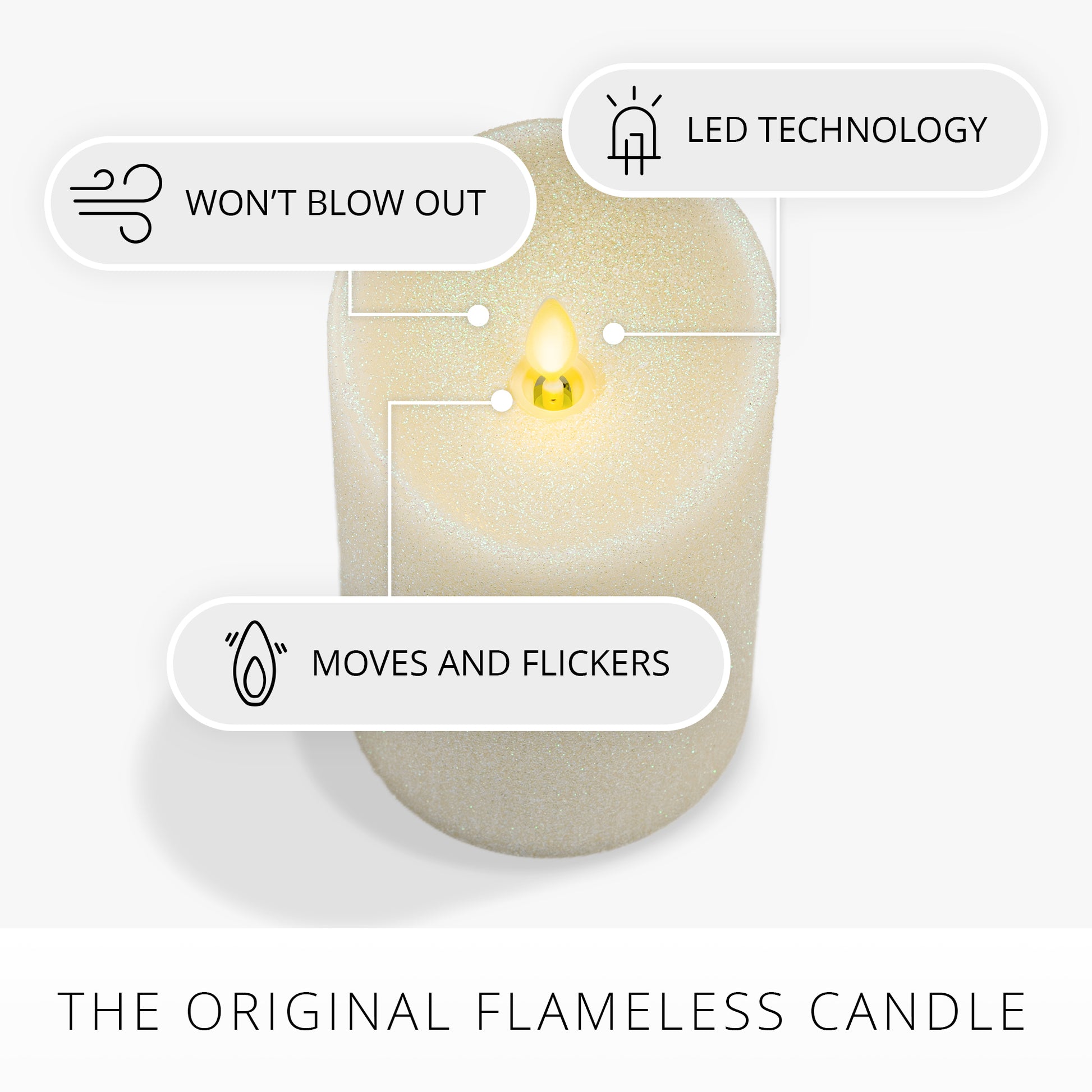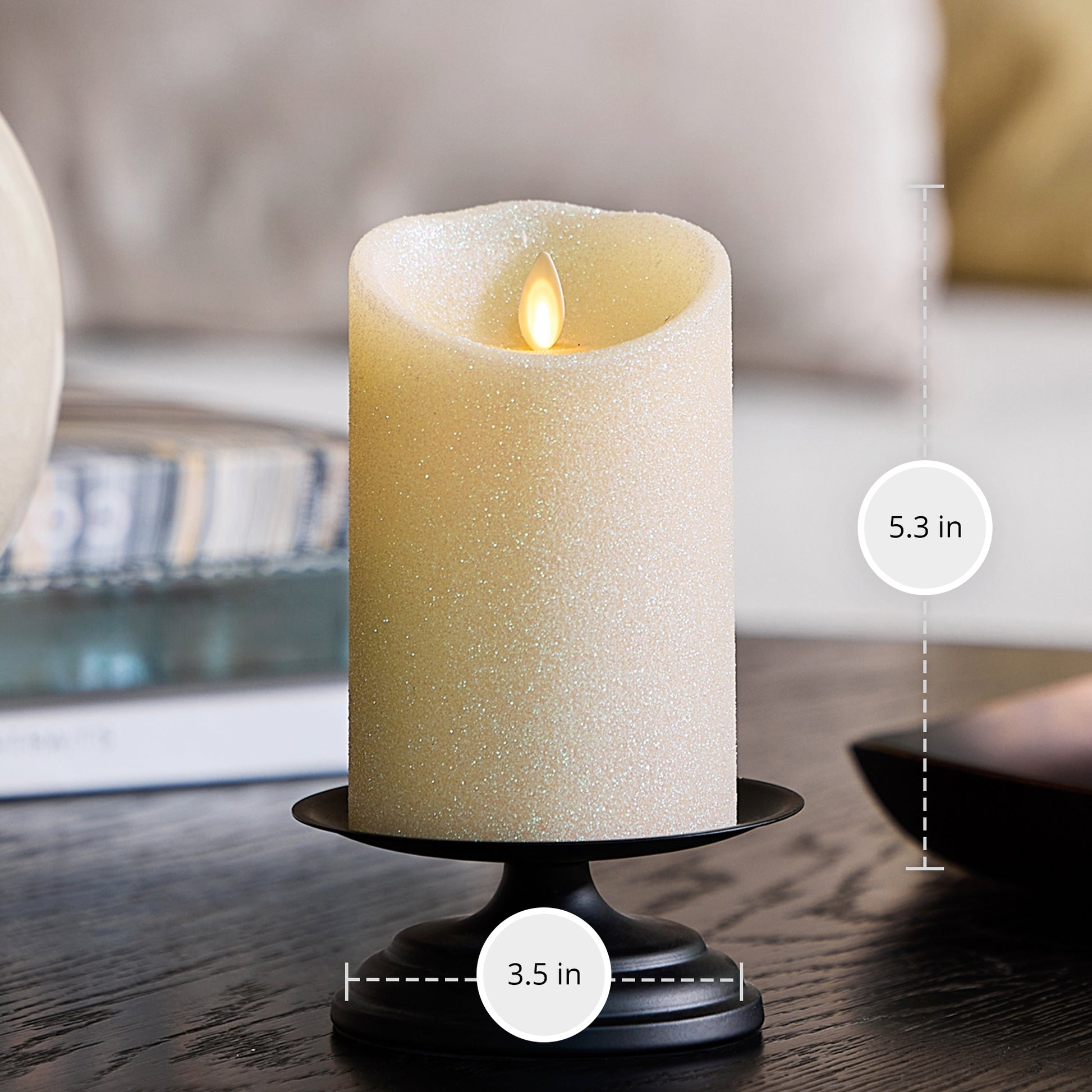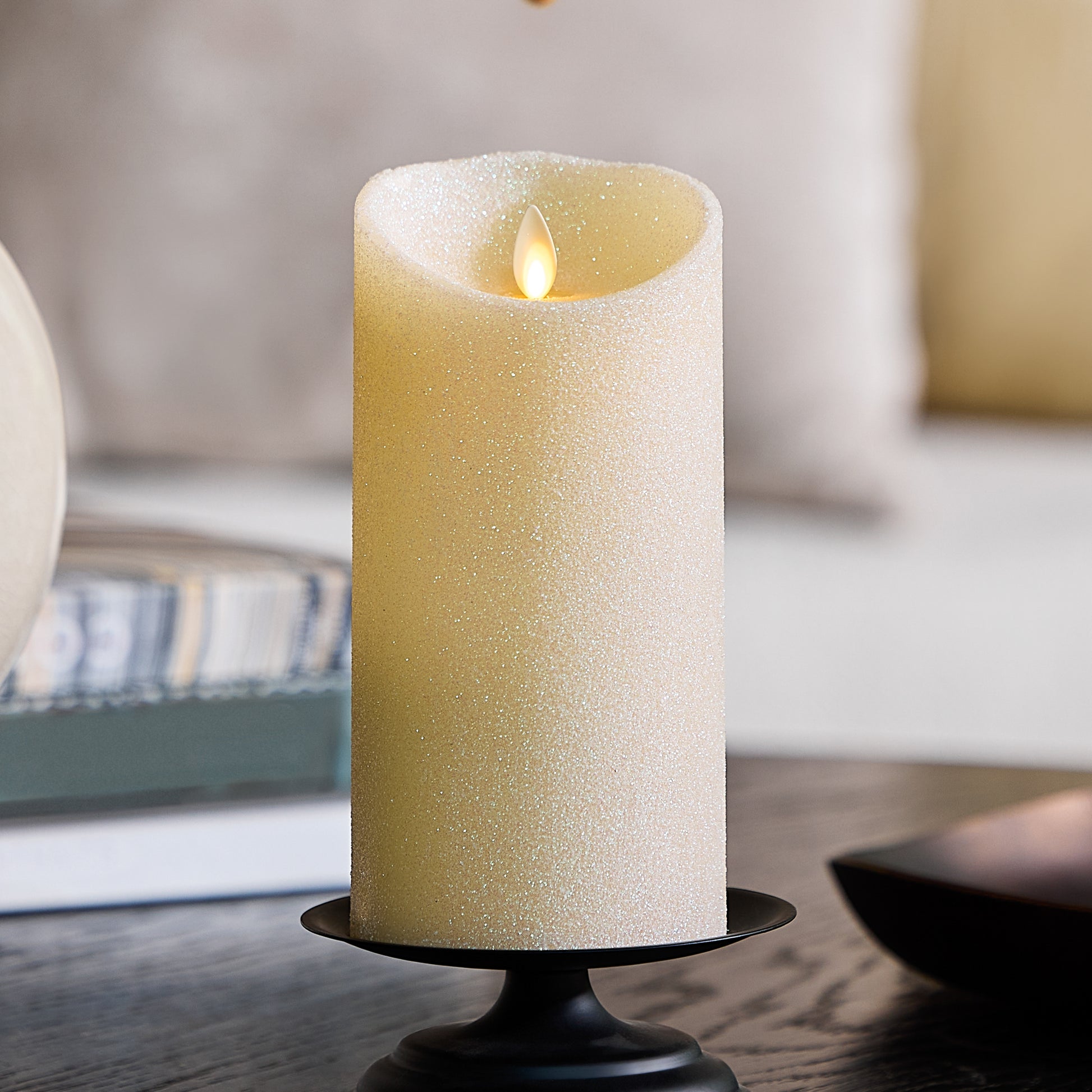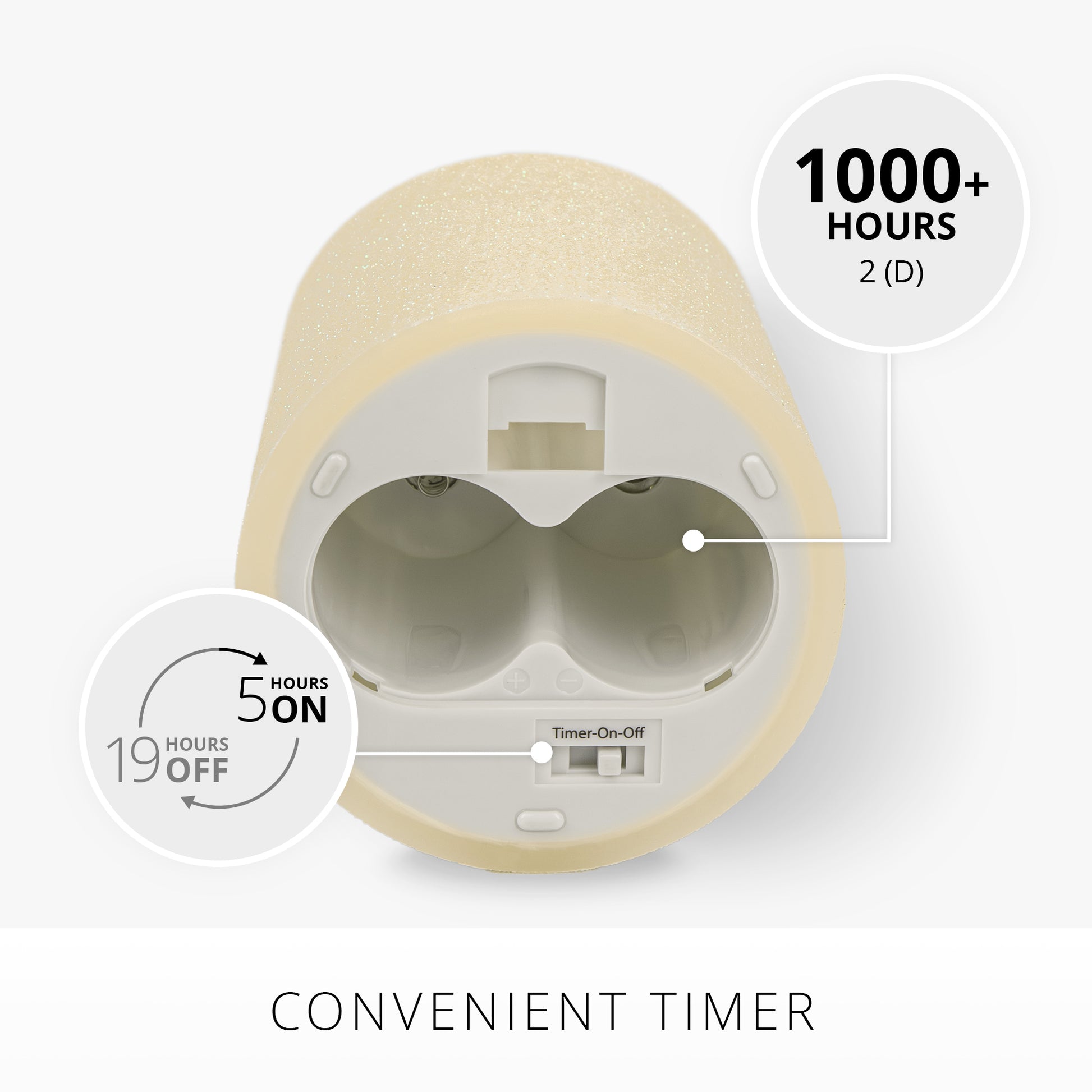 Shining with authentic moving-flame technology, the Radiant Ivory Glitter Scallop Pillar is a festive update on traditional ivory pillars. Available in two distinct heights, the neutral ivory tone is enhanced with a double-glitter finish that will not flake while flawlessly enhancing a room’s aura to feel more inviting and welcoming. These pillars can be styled individually or together on top of candle holders or across tablescapes to add a subtle touch of sparkle to any space.Technical Specifications