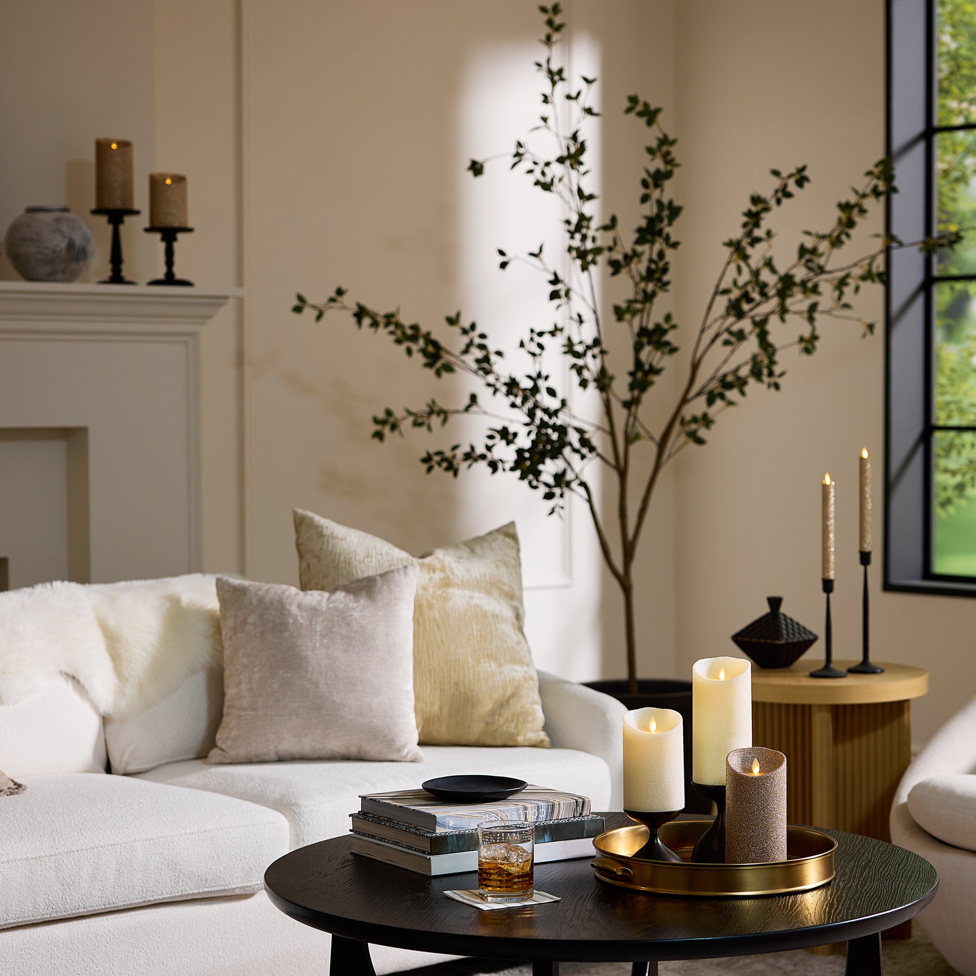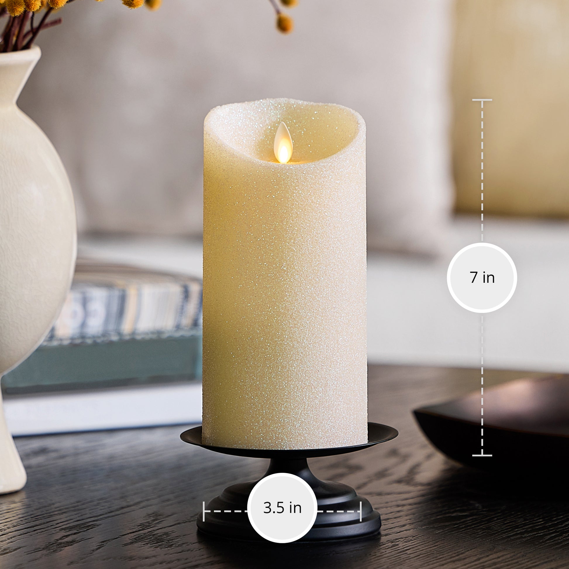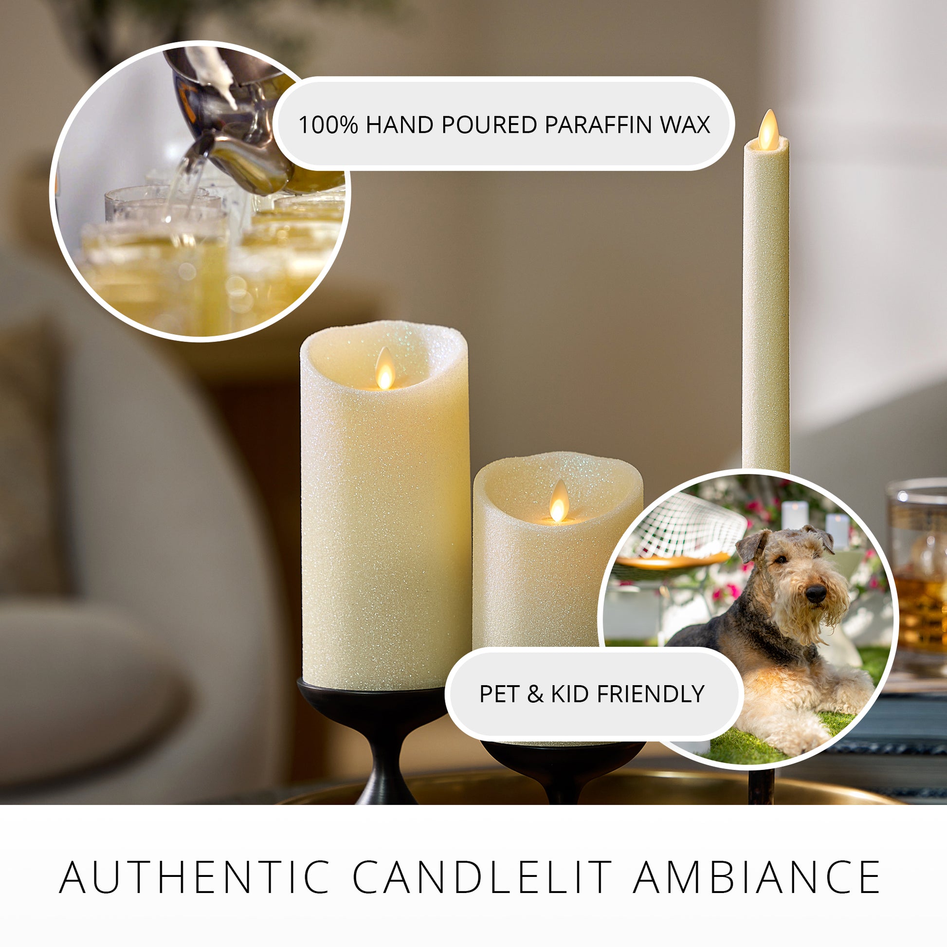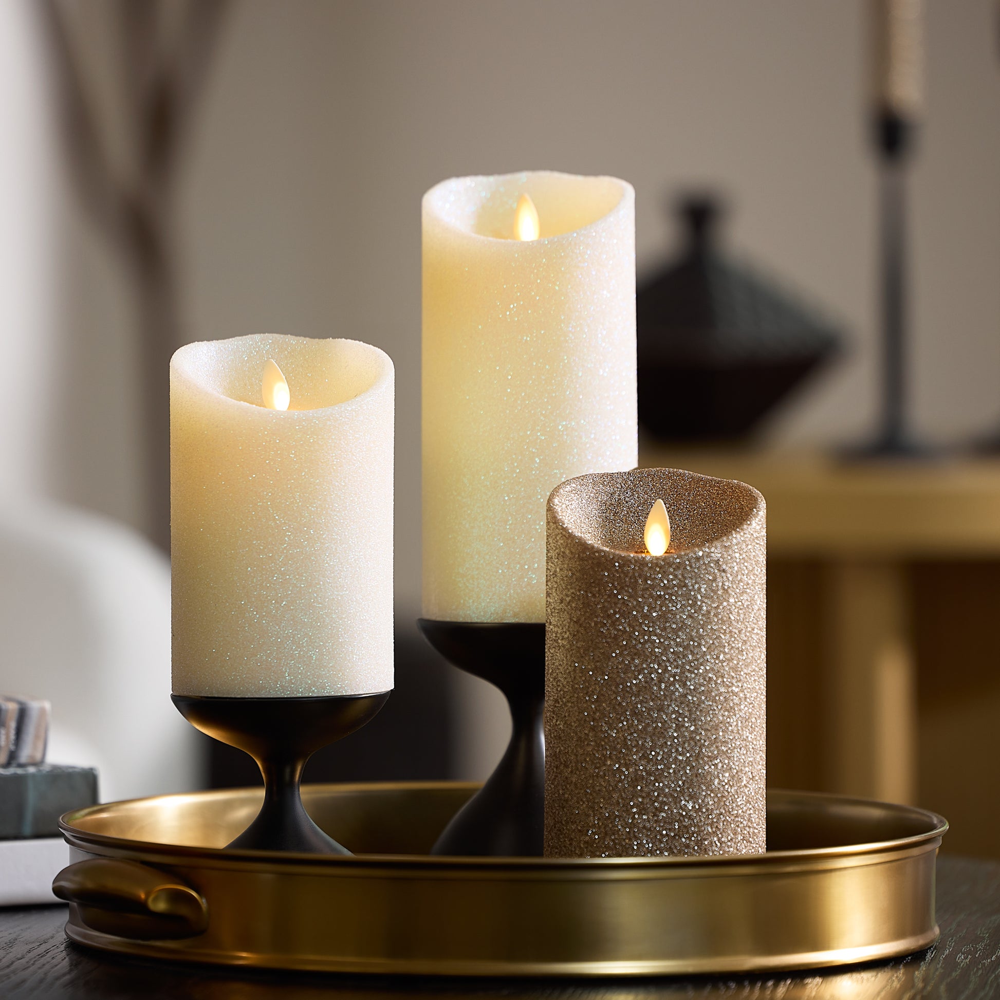 Shining with authentic moving-flame technology, the Radiant Ivory Glitter Scallop Pillar is a festive update on traditional ivory pillars. Available in two distinct heights, the neutral ivory tone is enhanced with a double-glitter finish that will not flake while flawlessly enhancing a room’s aura to feel more inviting and welcoming. These pillars can be styled individually or together on top of candle holders or across tablescapes to add a subtle touch of sparkle to any space.Technical Specifications
