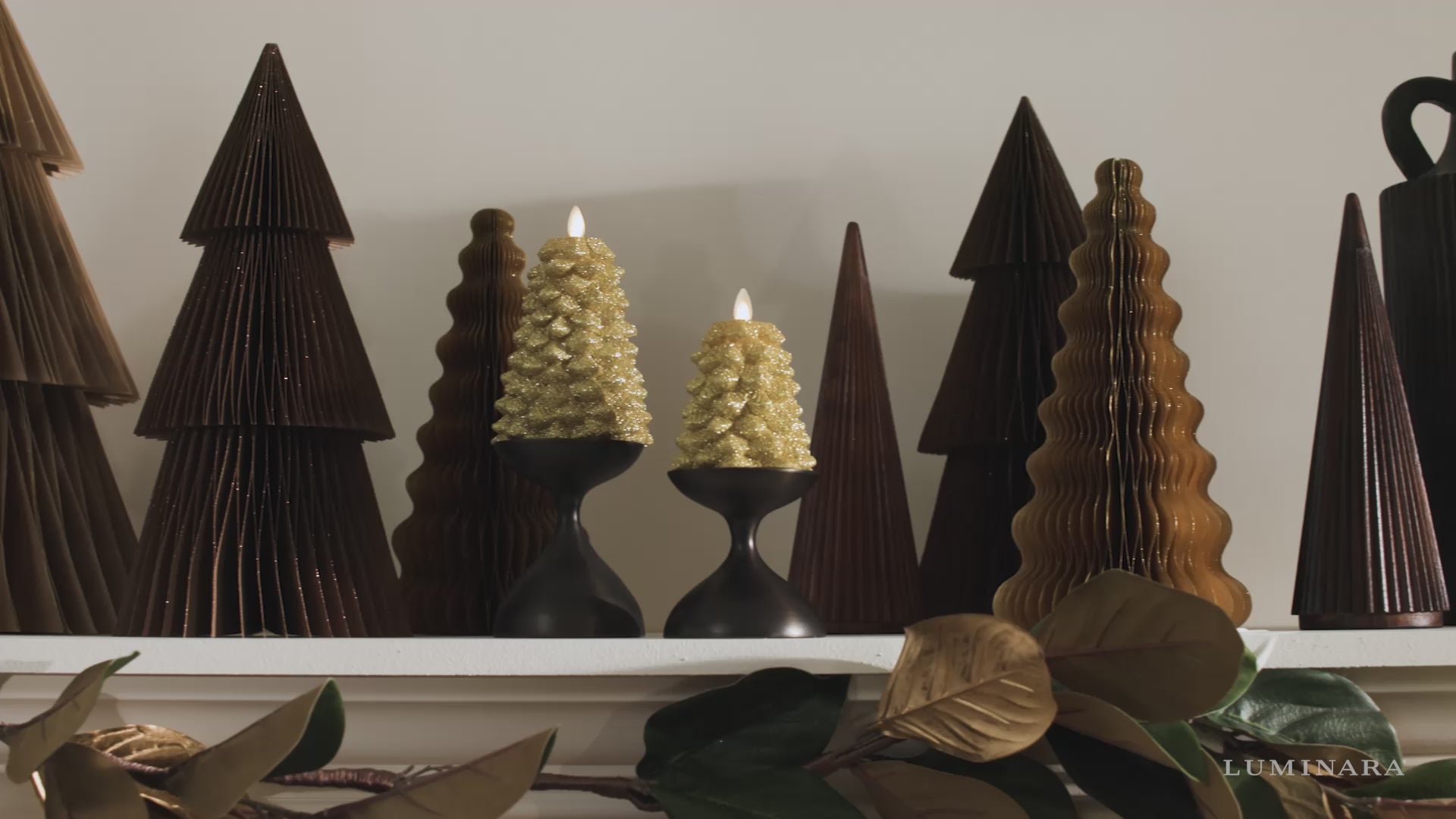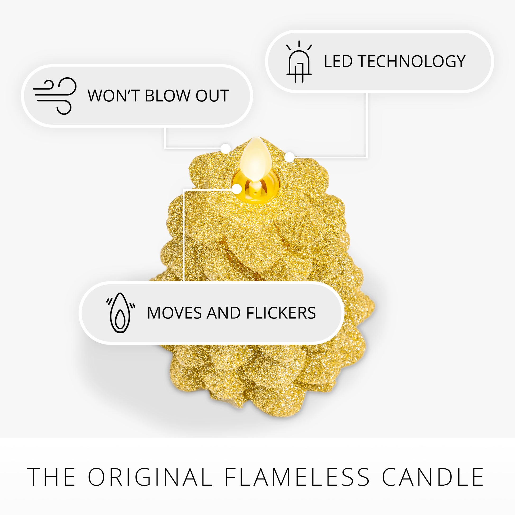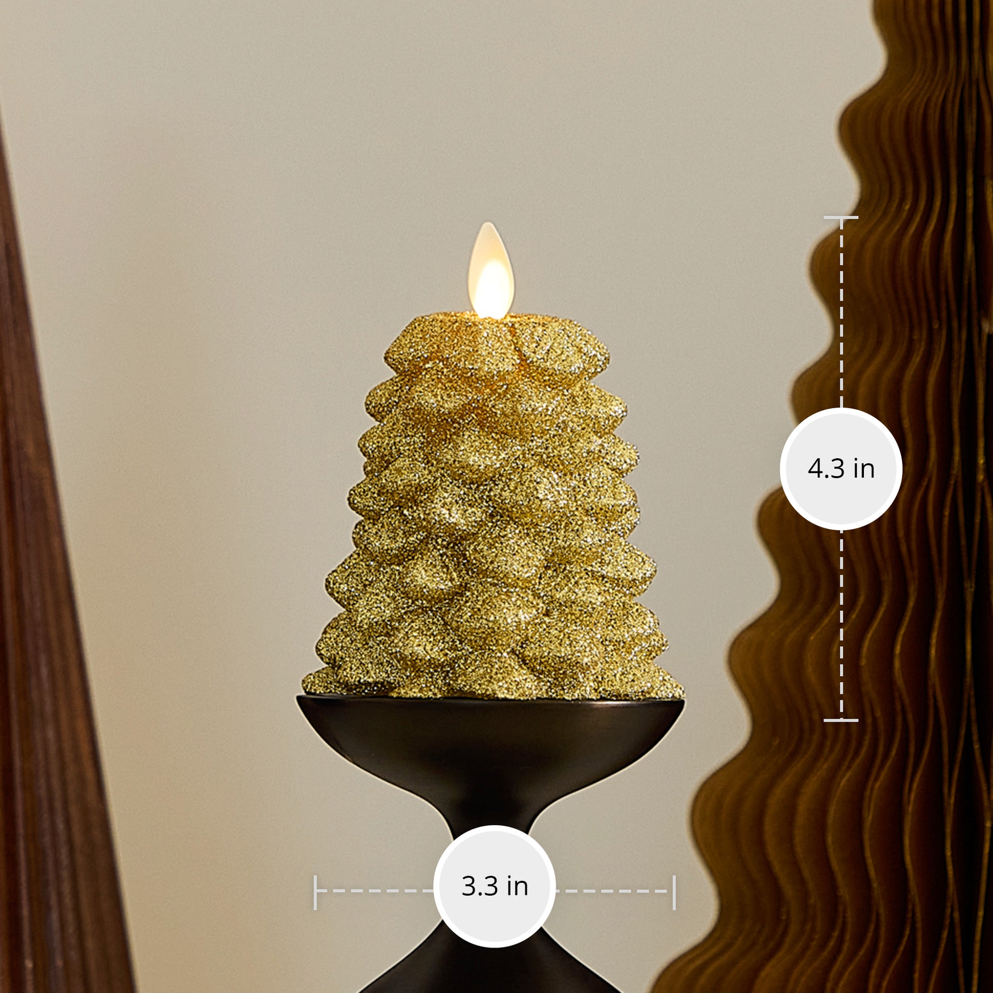 Make your holidays sparkle with the glow of the Luminara Rich Gold Glitter North Tree. Illuminating with patented Real-Flame technology, these gorgeously shaped holiday trees are available in two different sizes and have a chic golden glitter finish that does not flake or rub off. The North Tree flameless candle creates an inviting and cozy atmosphere, while adding a whimsical touch of sparkle and charm to your holiday décor.Technical Specifications