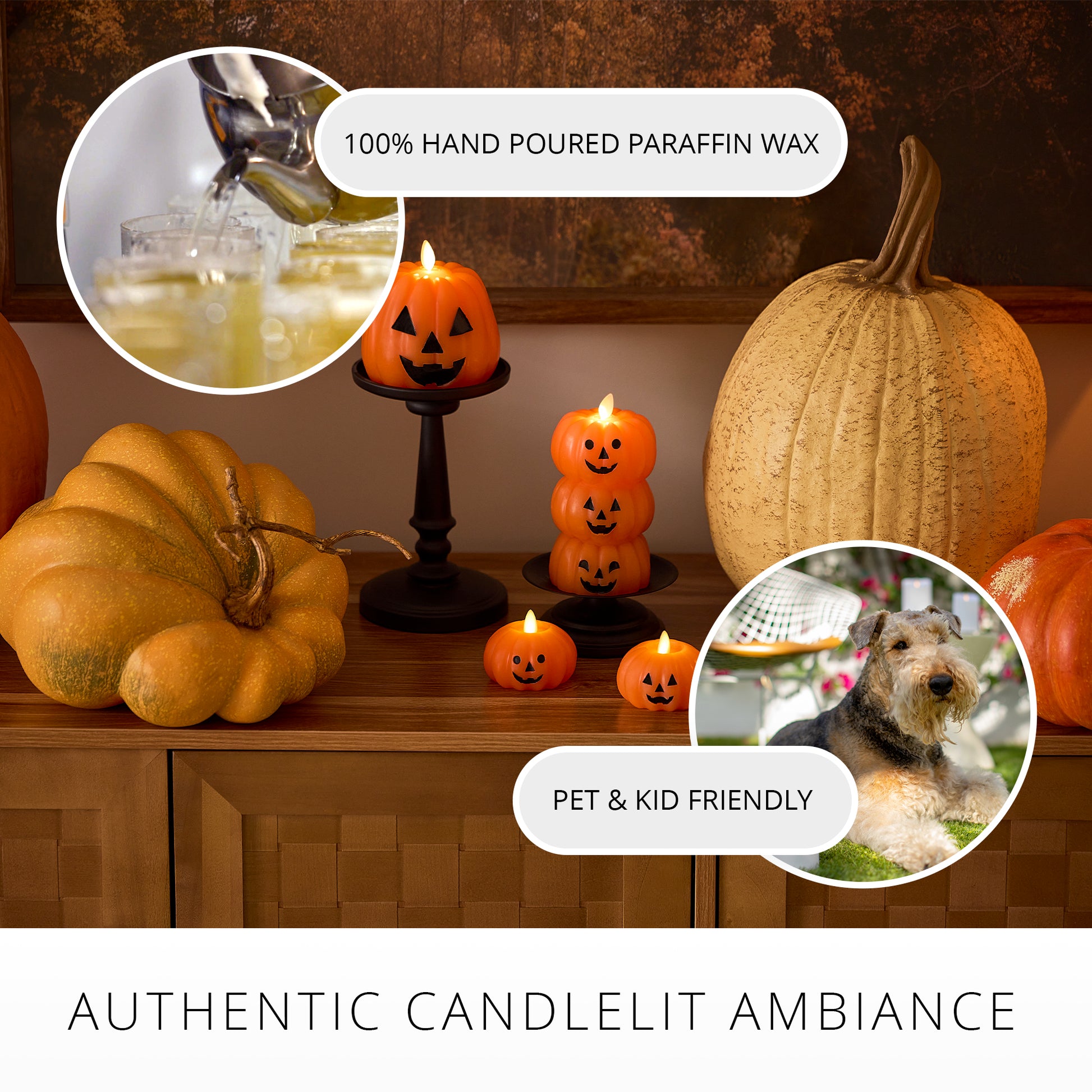 Lighthearted and full of charm, our Stacked Jack-o-Lantern Flameless Candle brings a playful glow to your Halloween decor. Hand-poured in a vibrant russet orange and stacked three pumpkins high, this whimsical piece features Luminara’s patented moving flame technology for a safe and festive flicker—perfect for porches, shelves, or trick-or-treat table displays.Technical Specifications