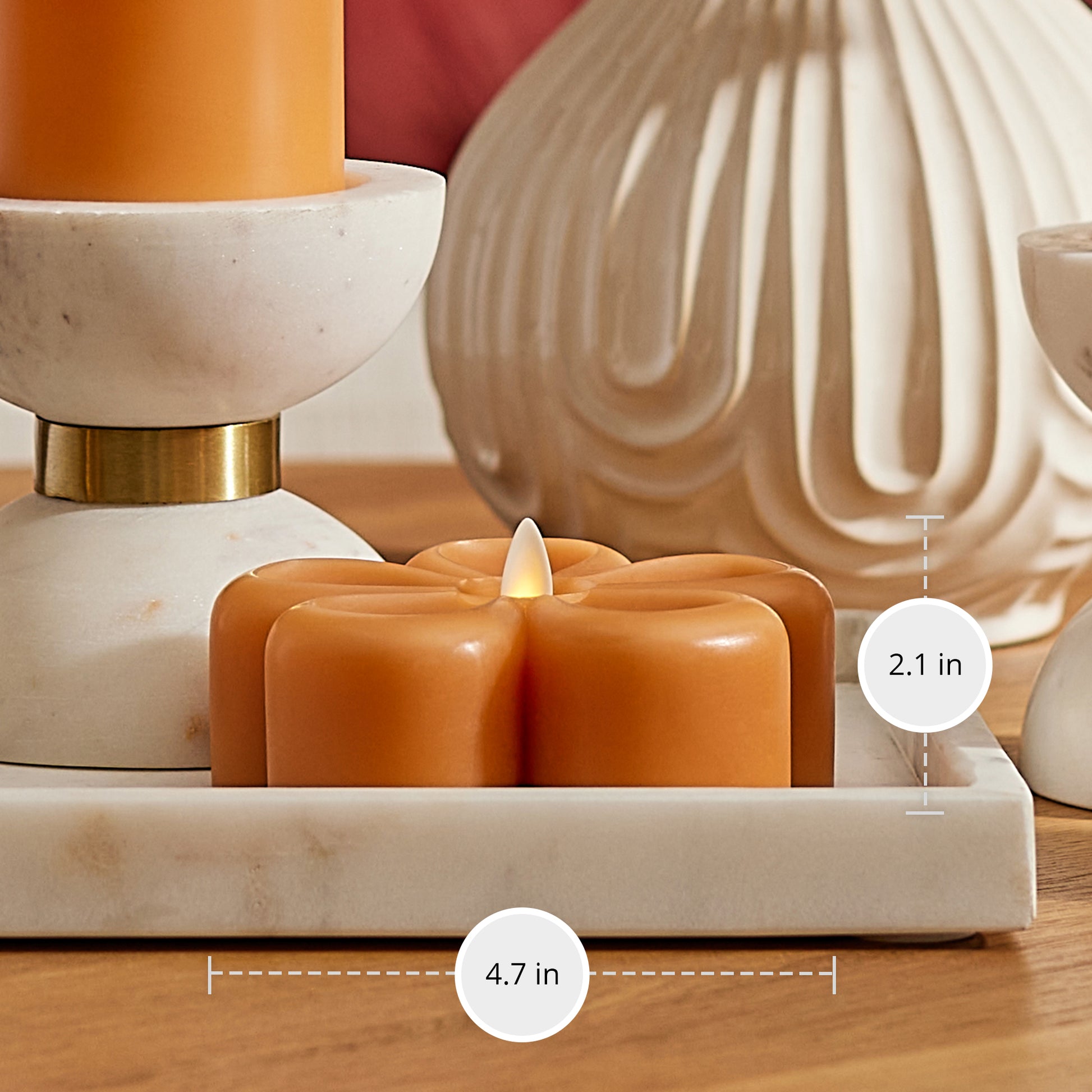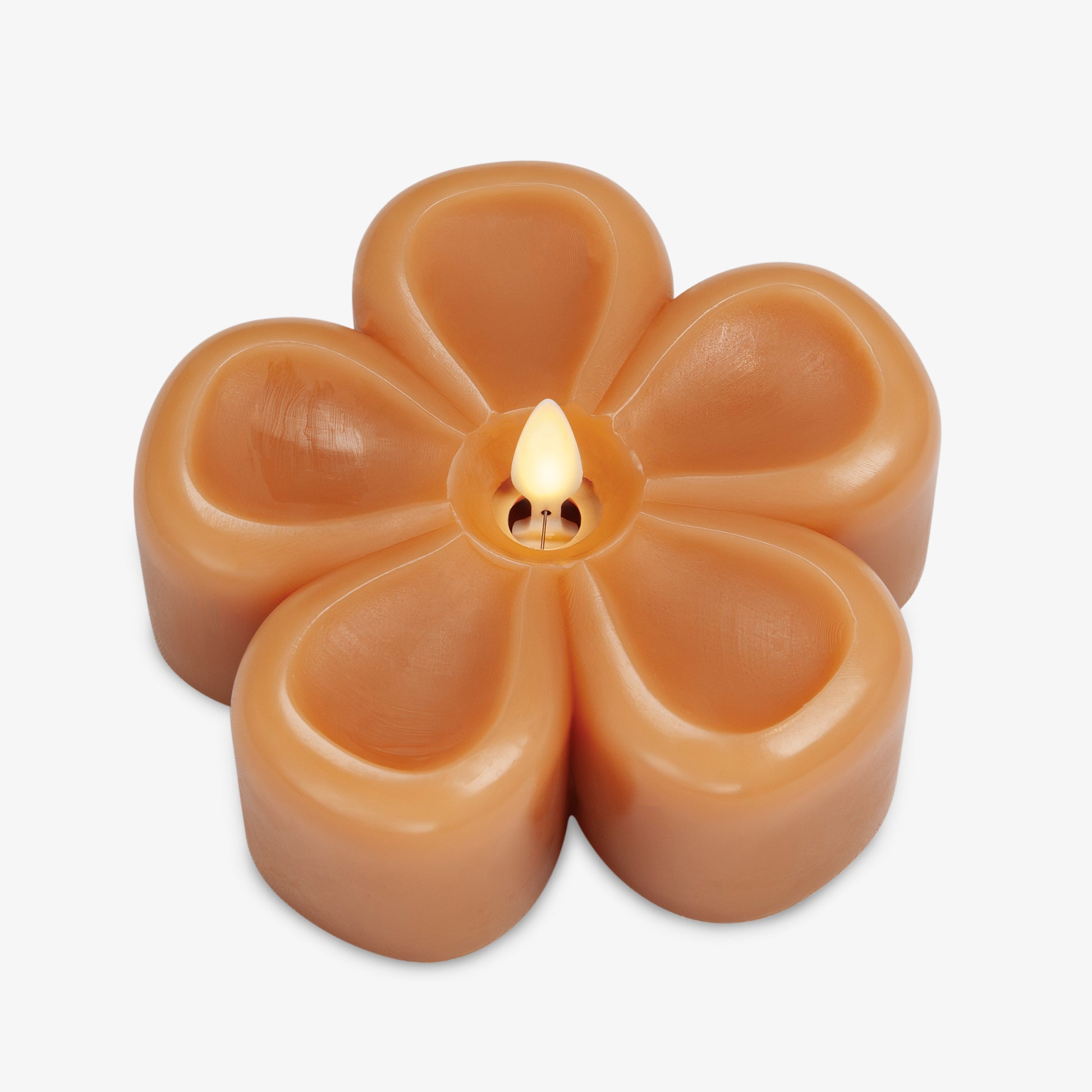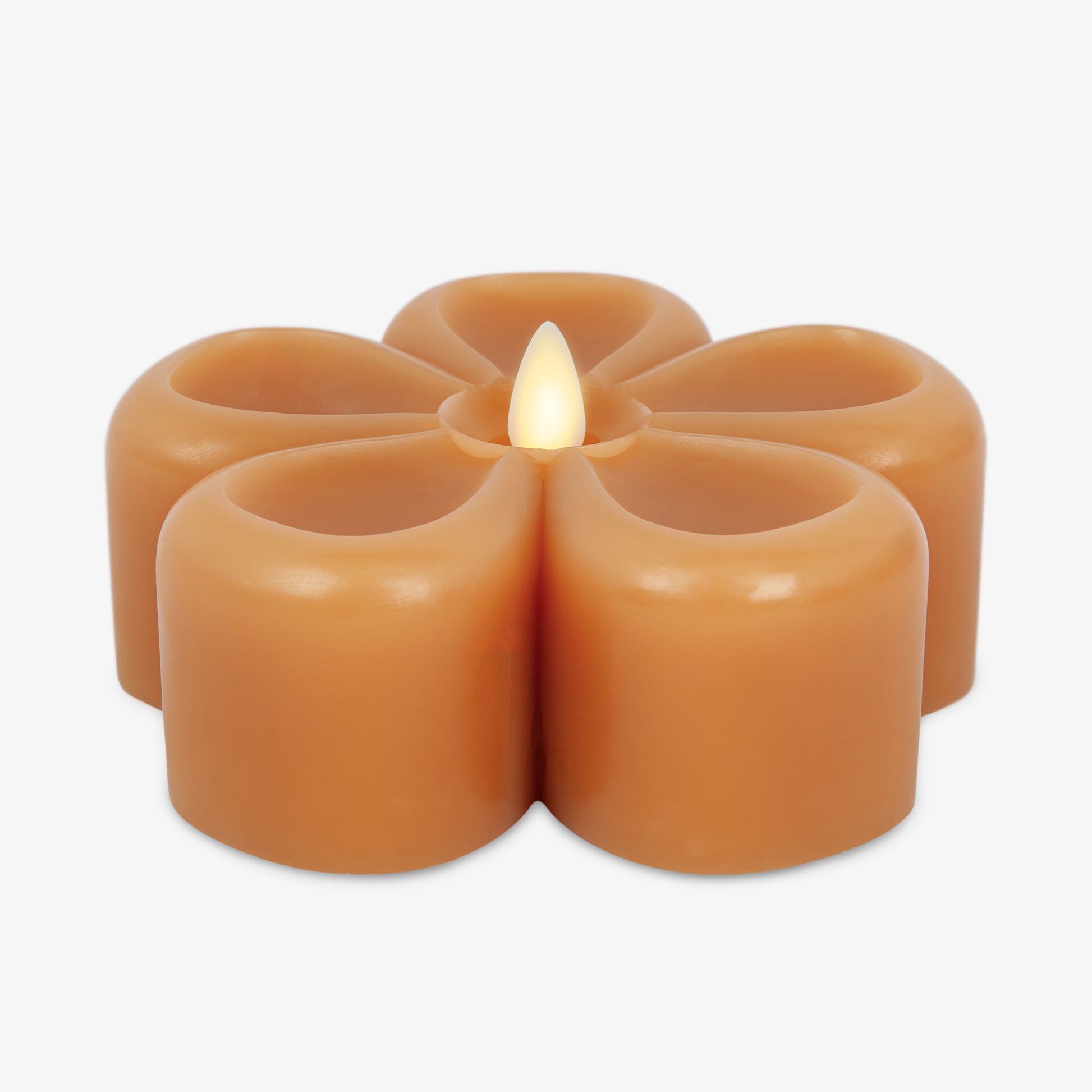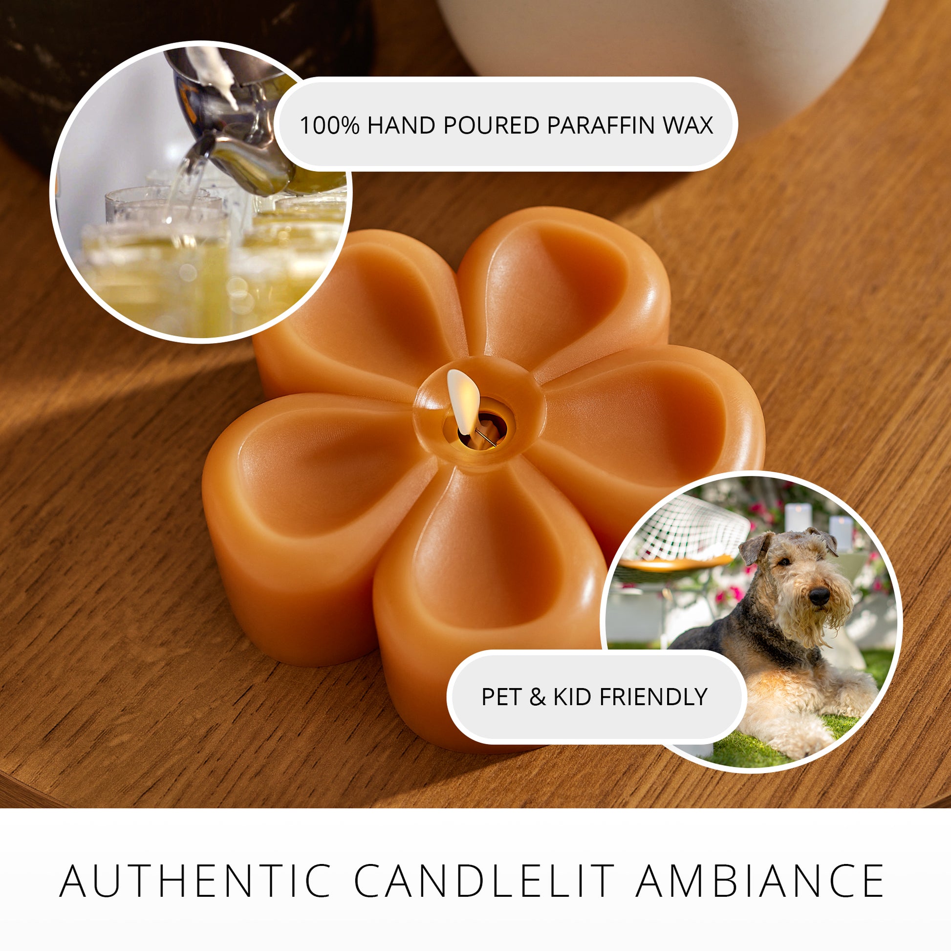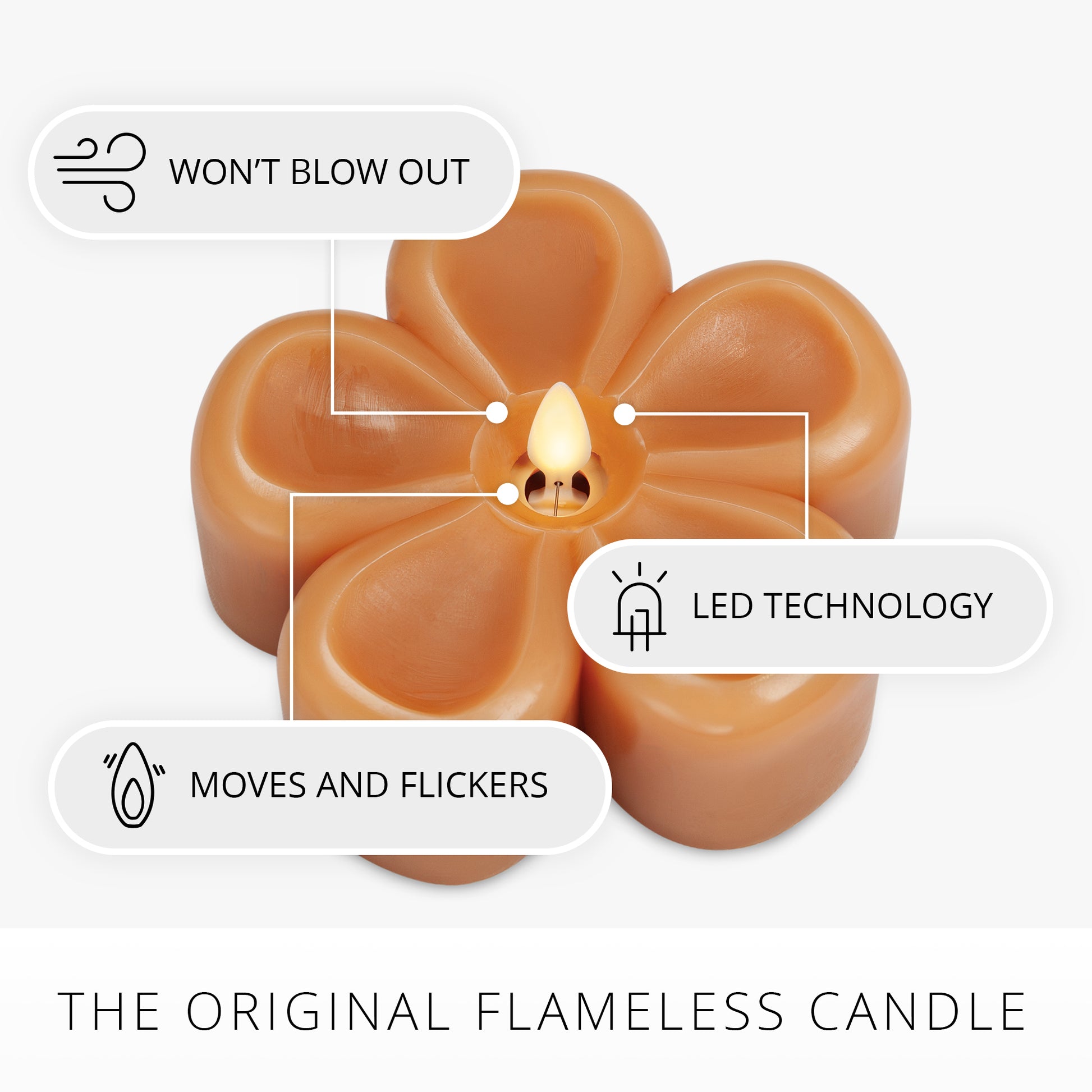 Hand-poured with genuine wax in a warm golden honey color, the Sunlit Honey Tealight Flower is a bright and cheerful springtime lighting accessory. With a smooth wax finish, this flameless candle tealight is shaped like a five-petal flower to honor the blooming florals of springtime. Equipped with patented moving-flame technology that provides ambient lighting while eliminating any fire hazard concerns, this flameless candle subtly compliments other seasonal spring décor and looks exceptionally festive when placed across table trays in a living room or on top of a bedroom vanity.Technical Specifications