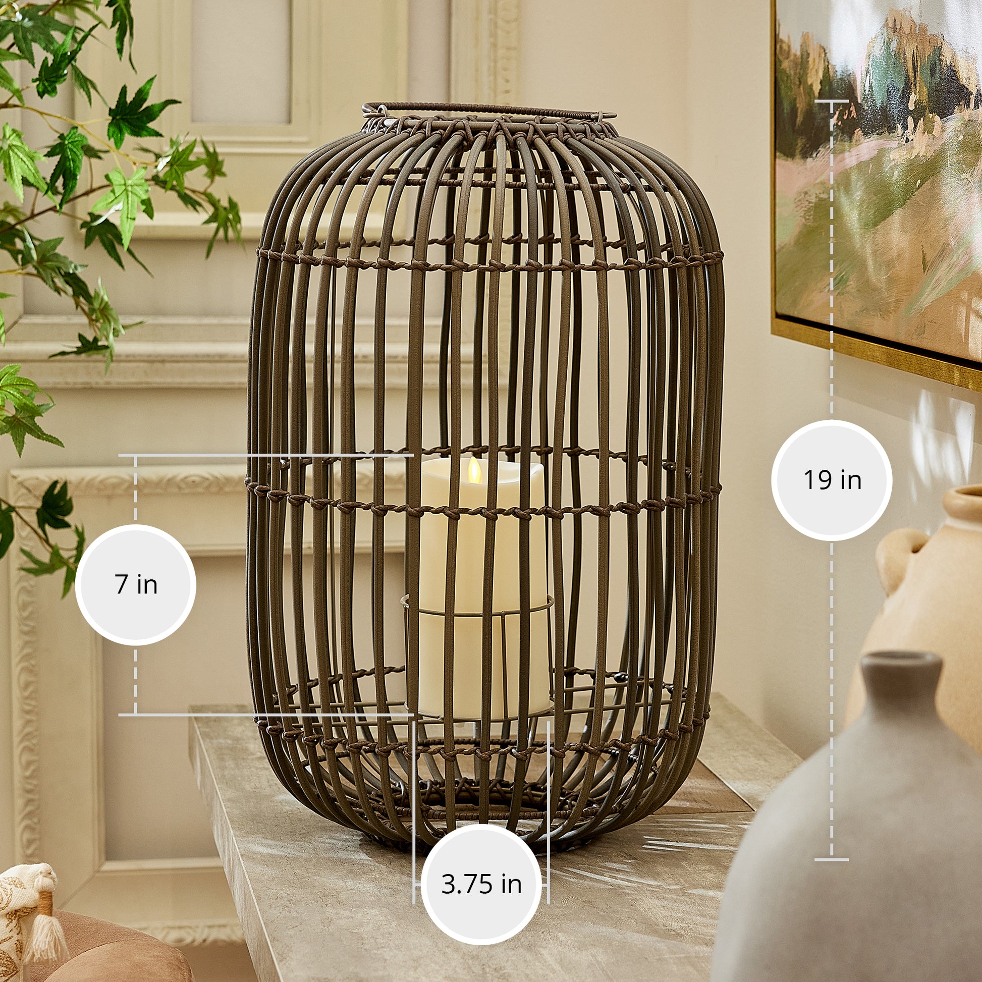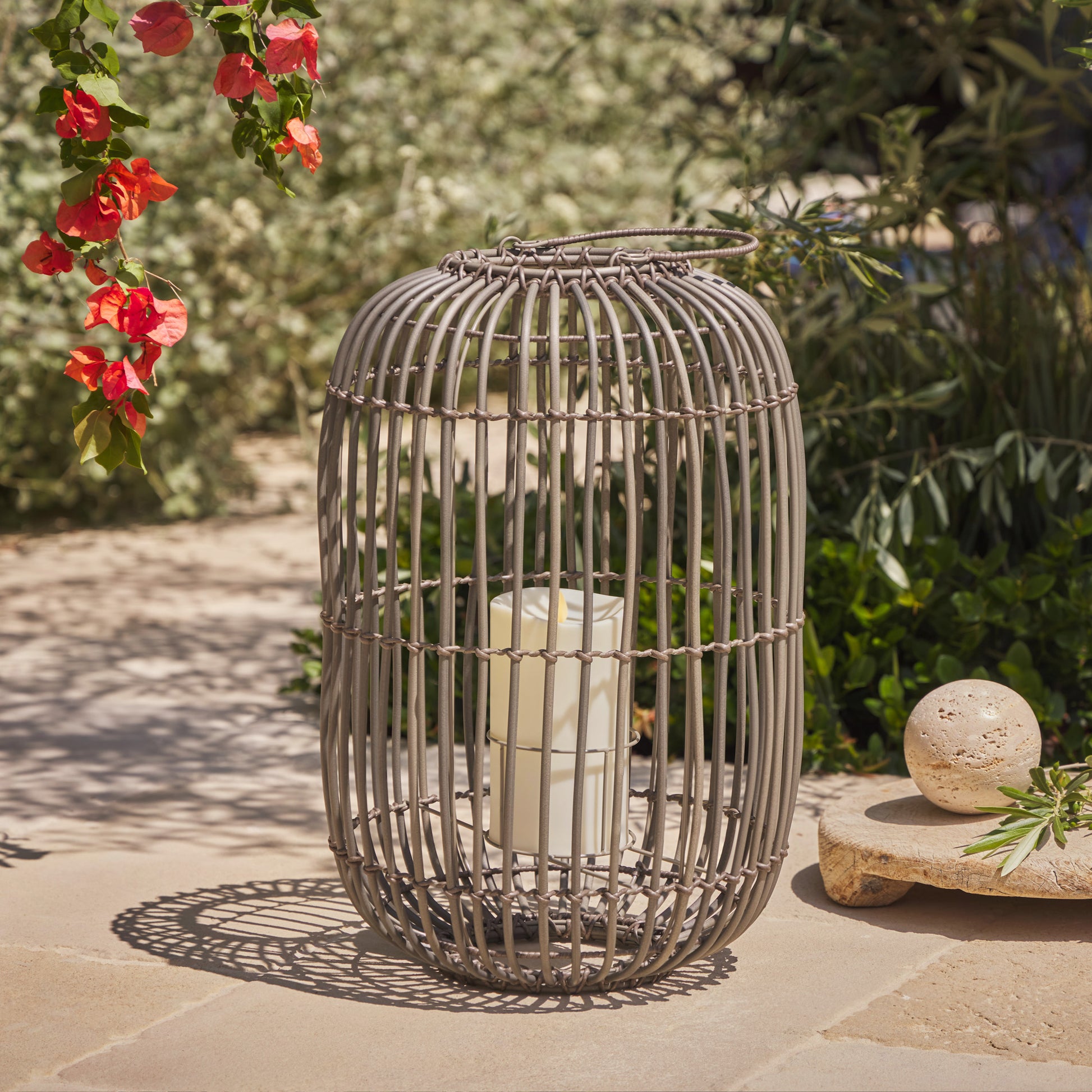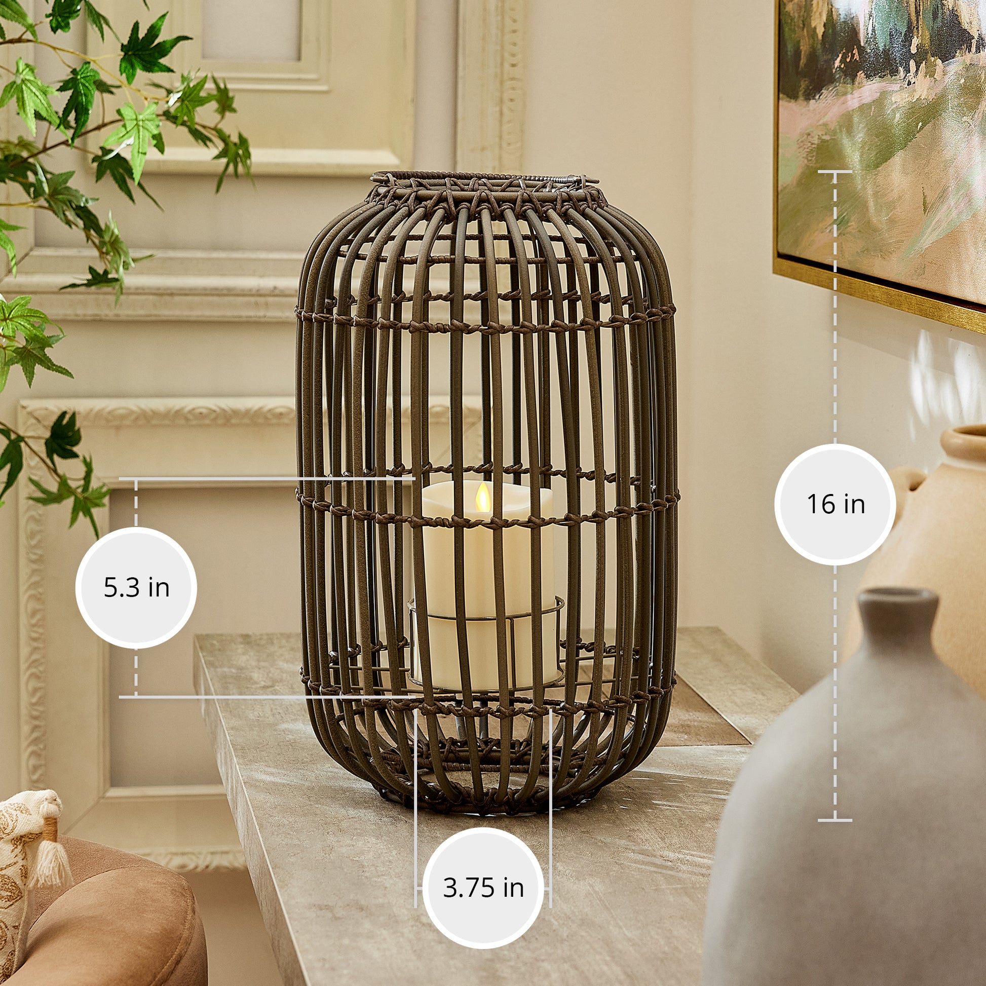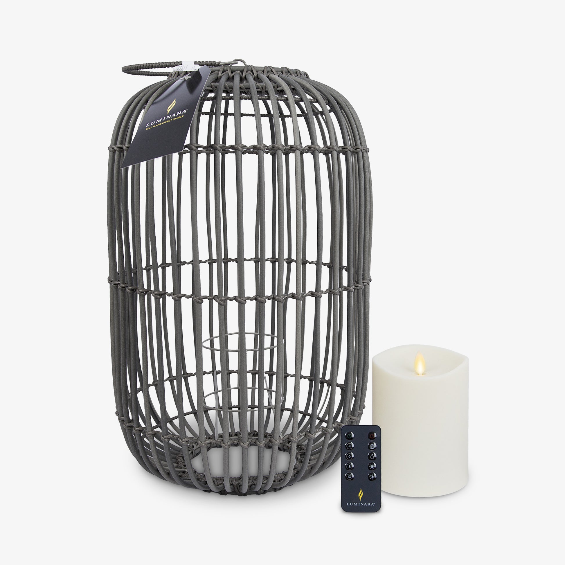 This rattan lantern includes a remote control and an outdoor flameless candle measuring 3.75" in diameter, powered by 2 D batteries for over 1,000 hours of illumination.