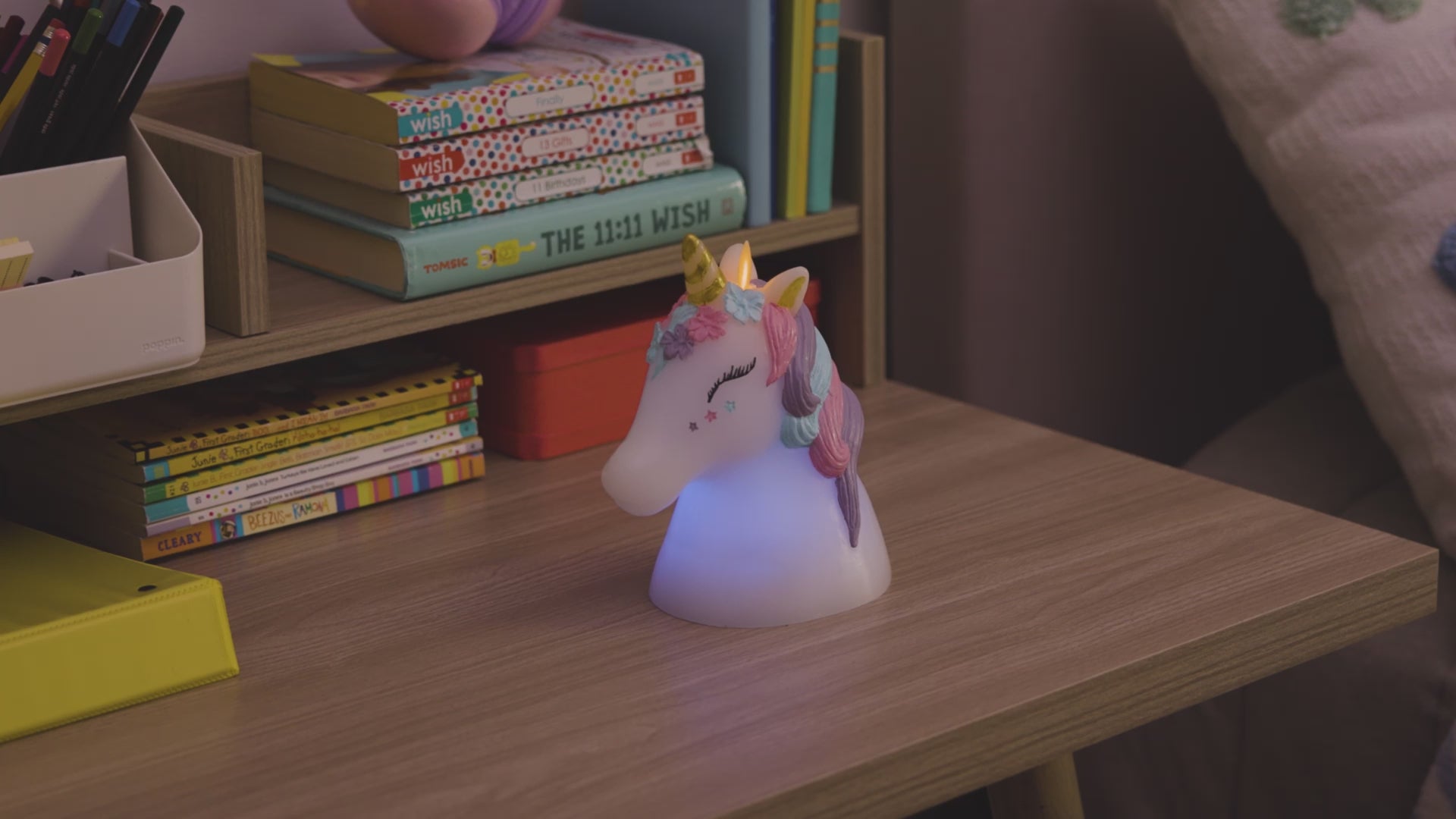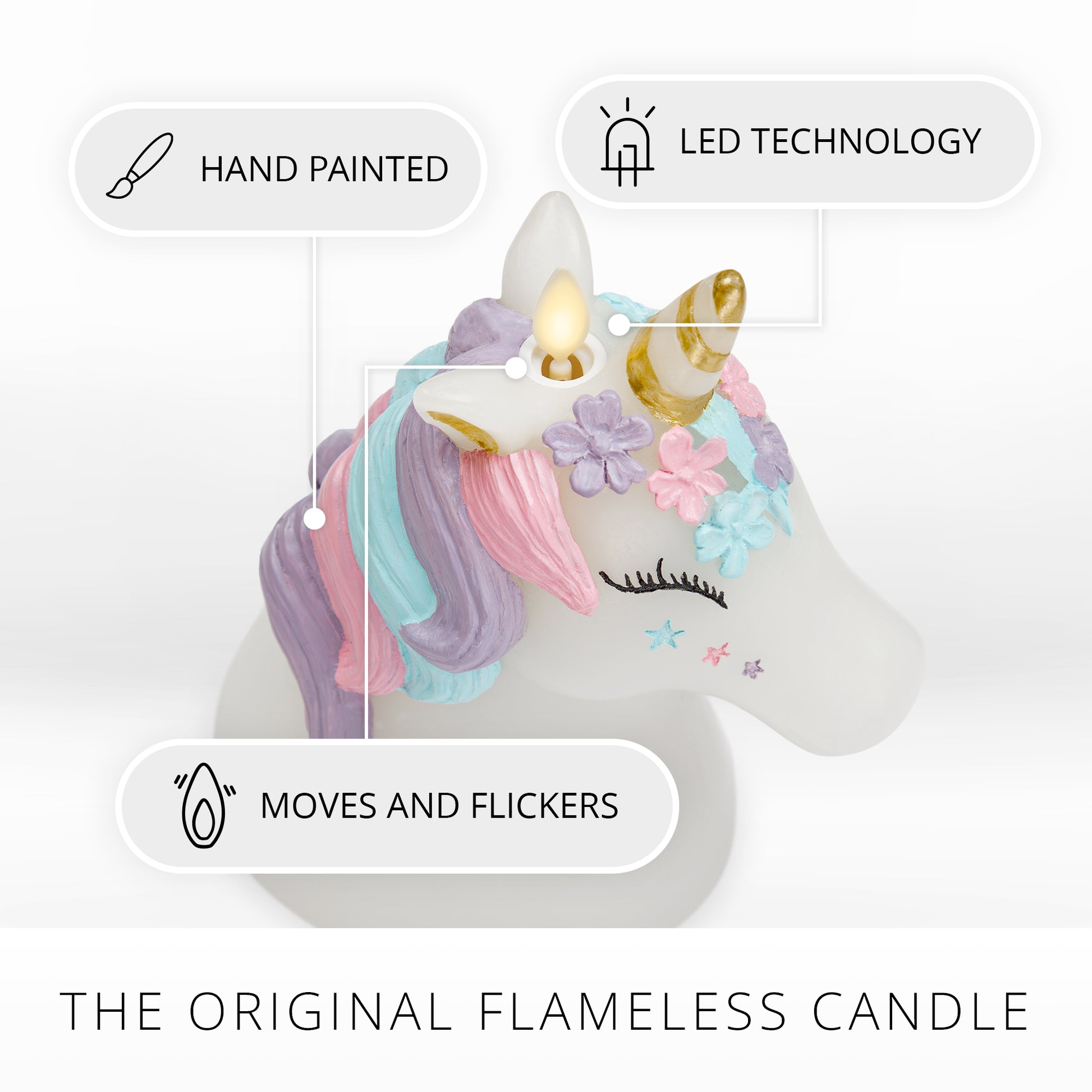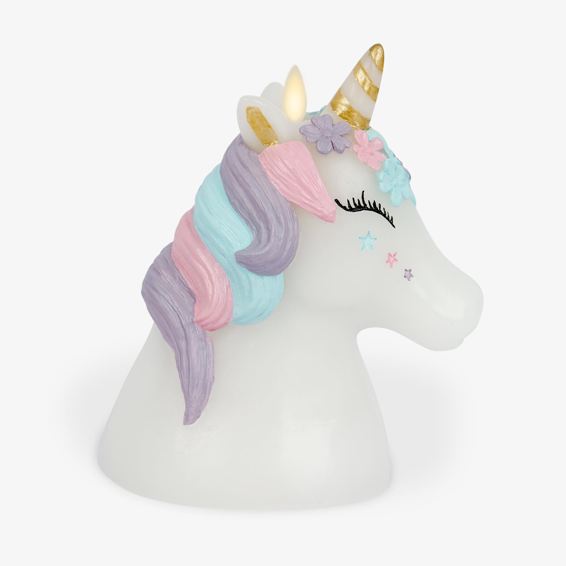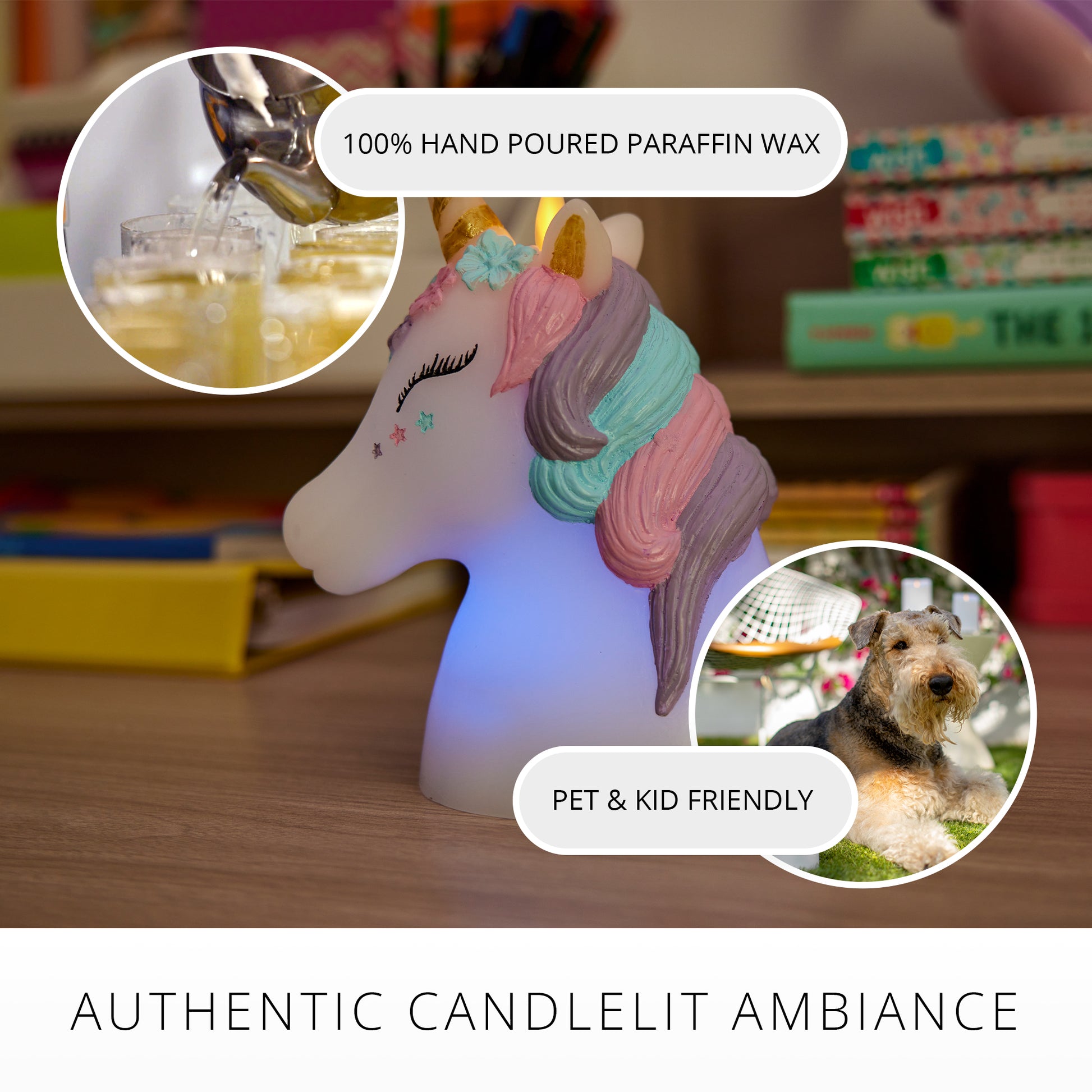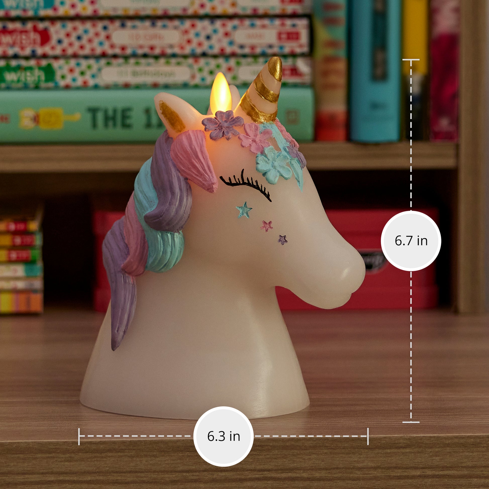 Cast a magical glow throughout the night with the Color Changing Unicorn flameless candle. Made of premium-quality wax and hand painted, the unicorn features soft pastel hair in pink, purple, and blue shades, and a golden horn with playful eyes. The white wax looks almost translucent when glowing with the color changing feature, allowing the various shades to shine through as they playfully rotate throughout the night.Technical Specifications