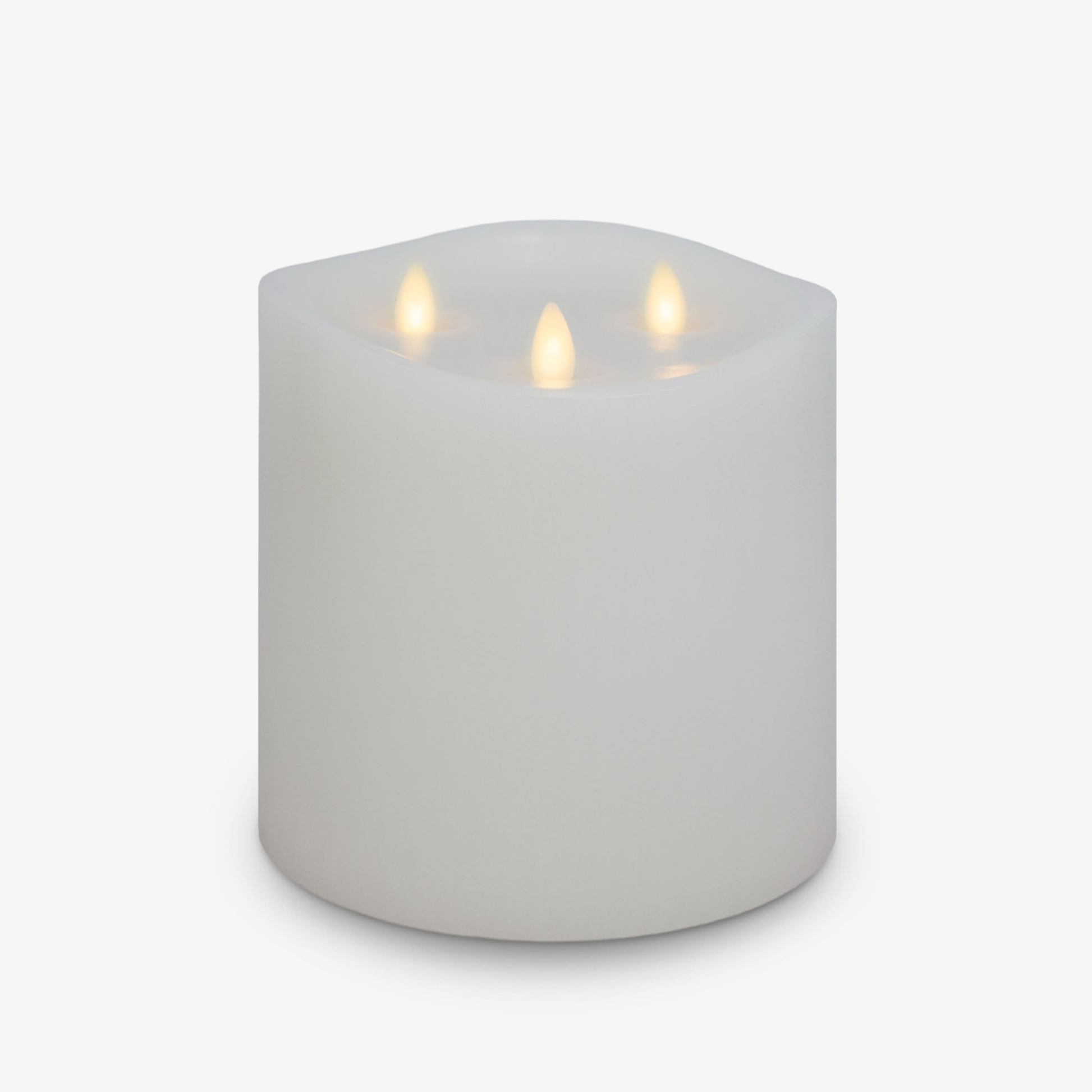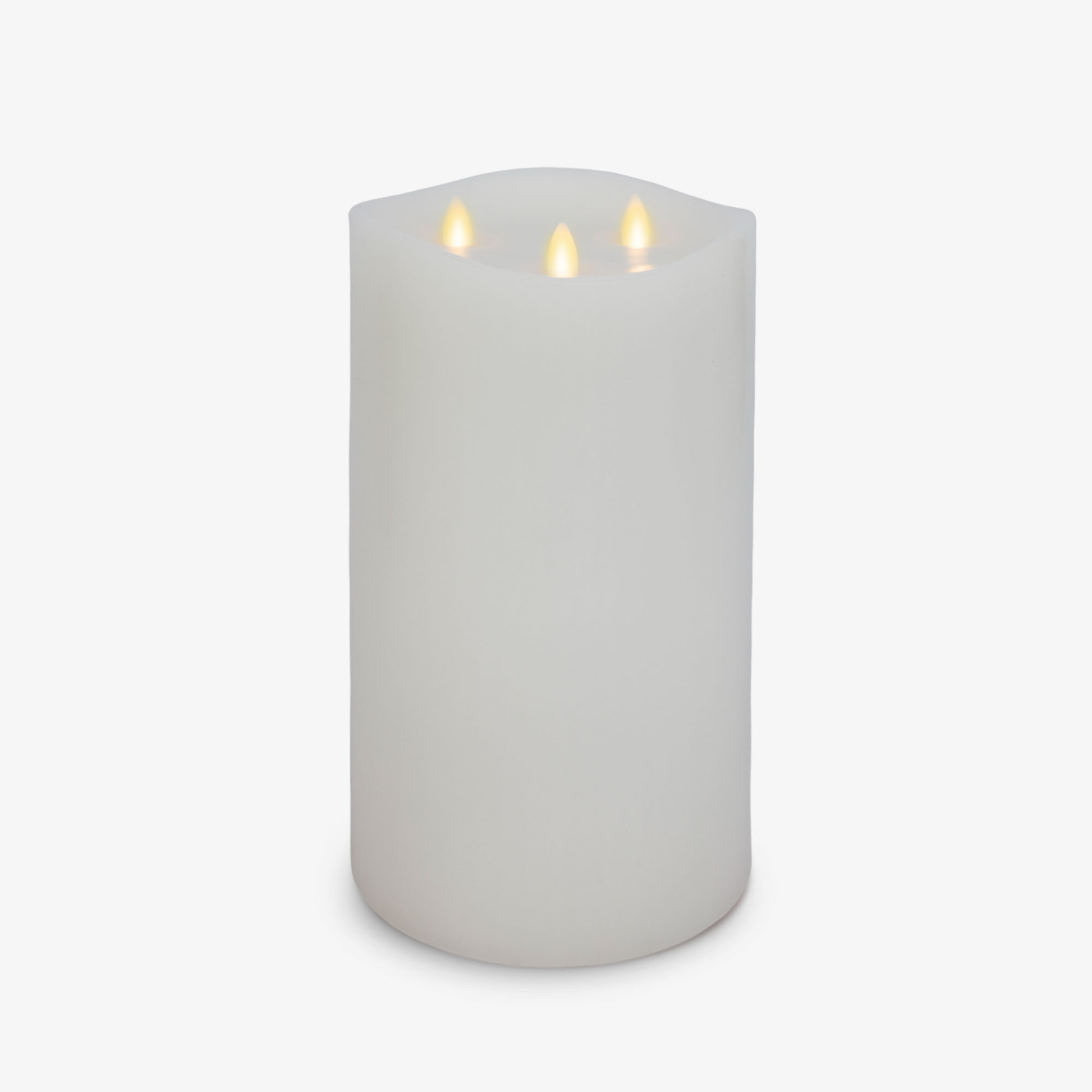 With three moving-flame wicks, the white tri-flame pillar is a contemporary upgrade to traditional pillars. The realistic flame-effect technology looks stunning across the melted edge top and its smooth wax finish provides an elegant touch, whether on its own or when arranged together in both of the available size options.