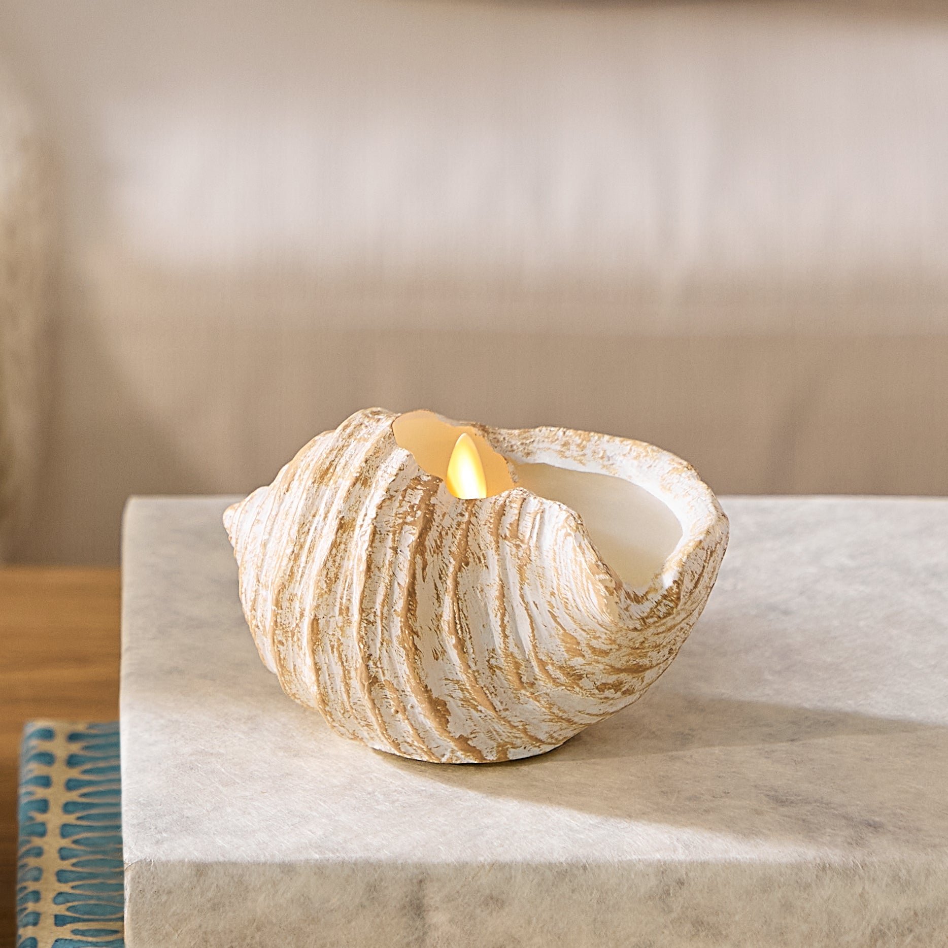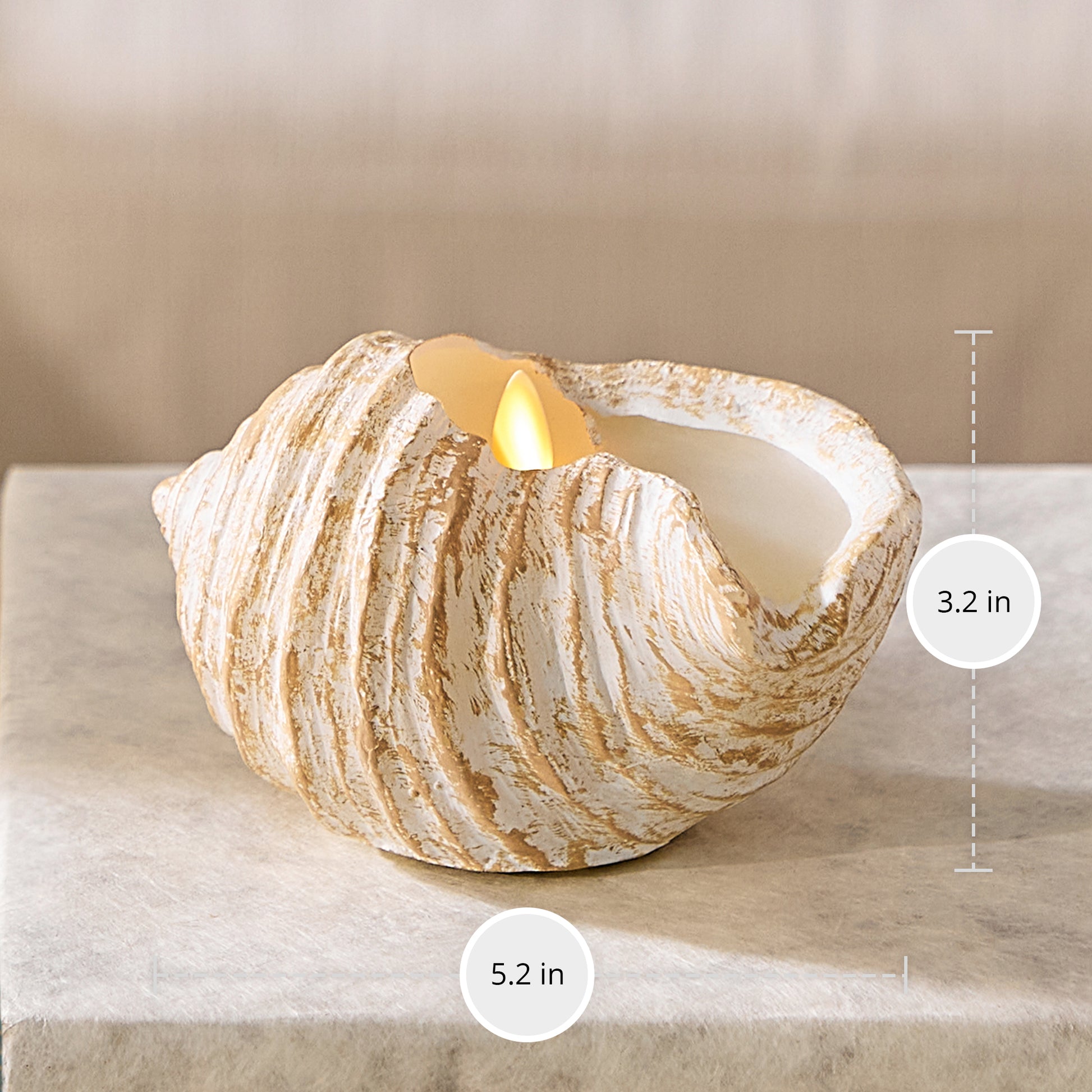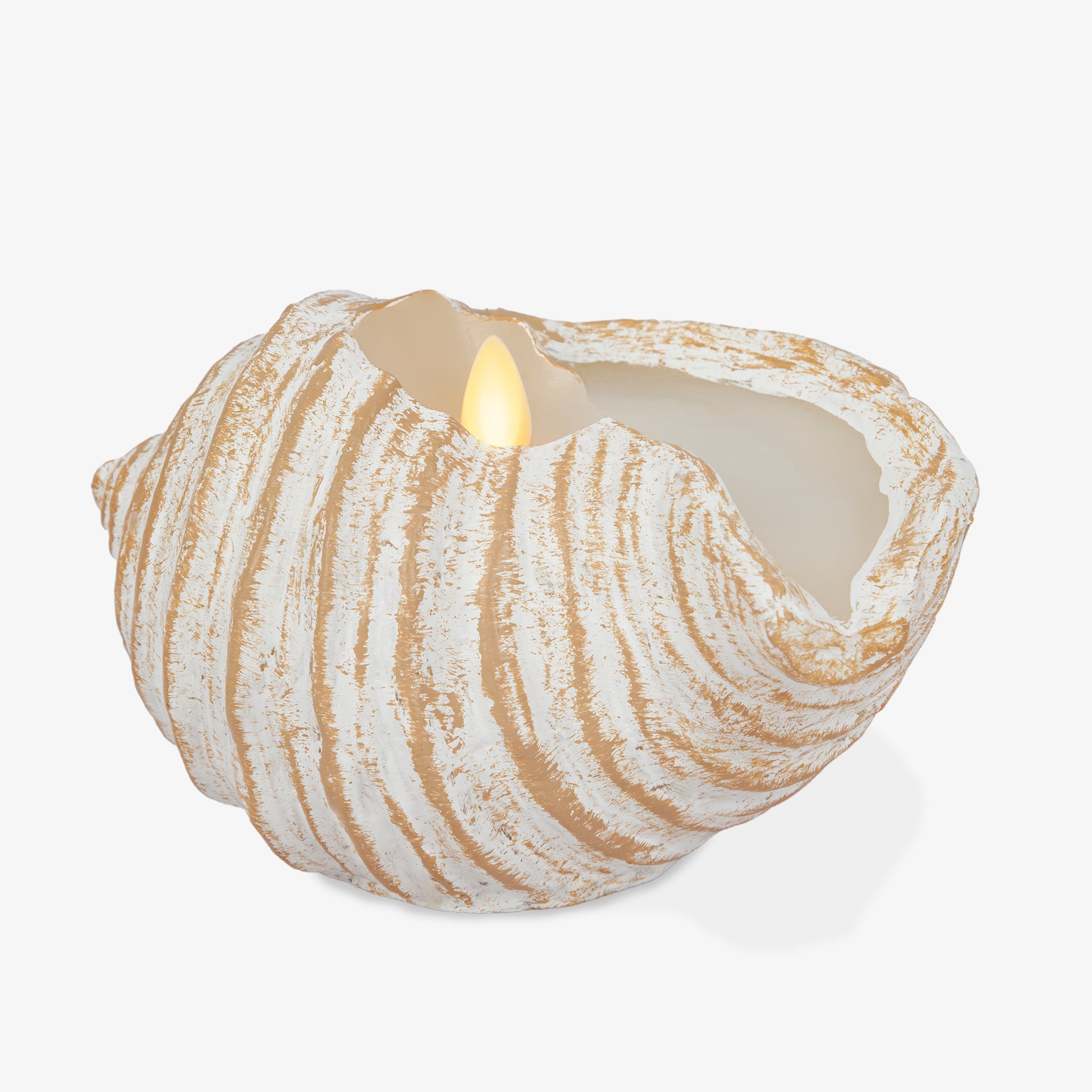 Our White Flameless Candle Tun Shell is designed to radiate with luxe seaside ambiance. Each candle is made with hand-poured premium wax and is uniquely painted to look exceptionally real as it glows with authentic moving-flame technology. The neutral tone of the Flameless Candle Tun Shell makes it a soothing lighting accent that brings the ocean indoors. Use the Tun Shell to elevate a coffee table with a coastal twist or pair it with the Luminara Clamshell for the ultimate beachside candlelight aesthetic.Technical Specifications