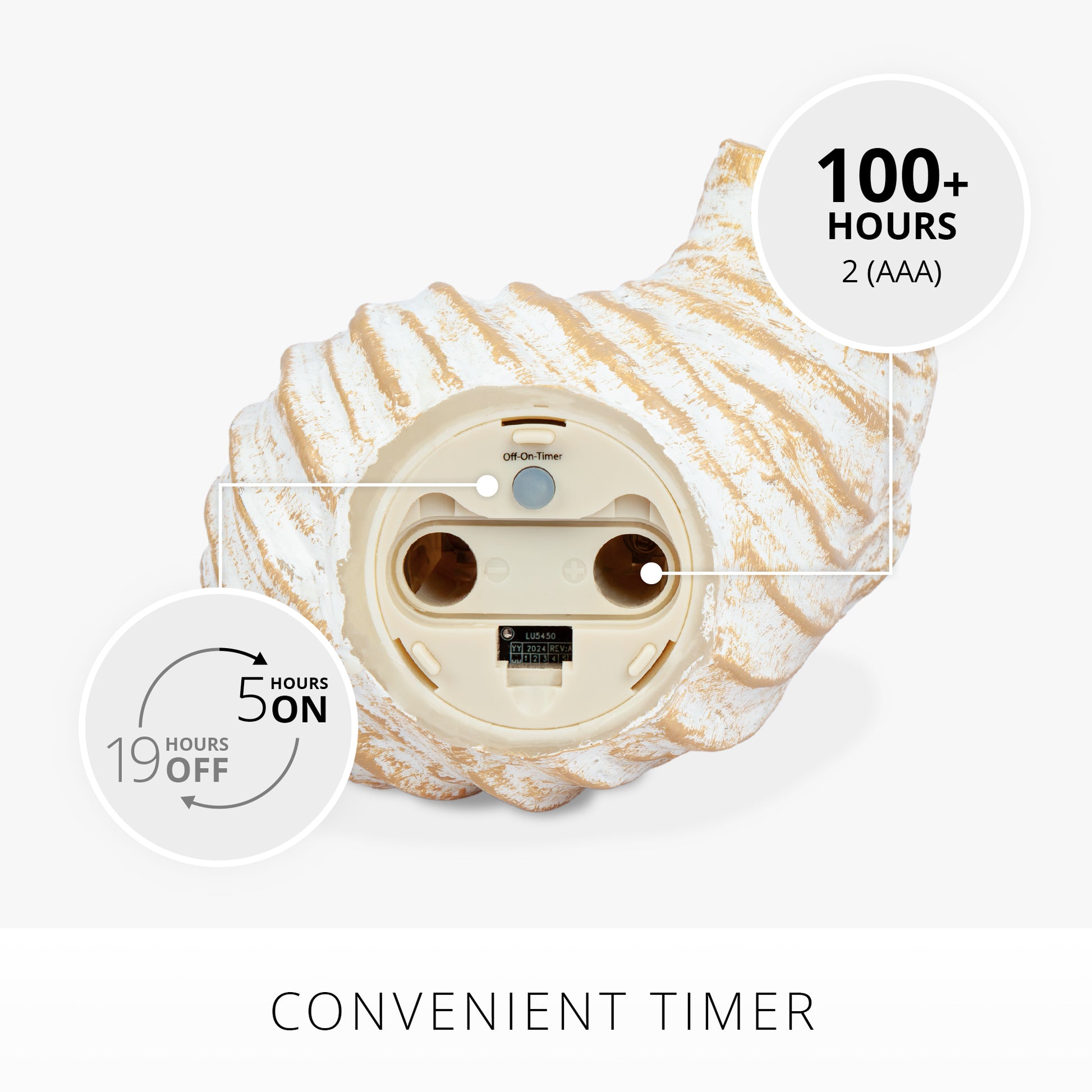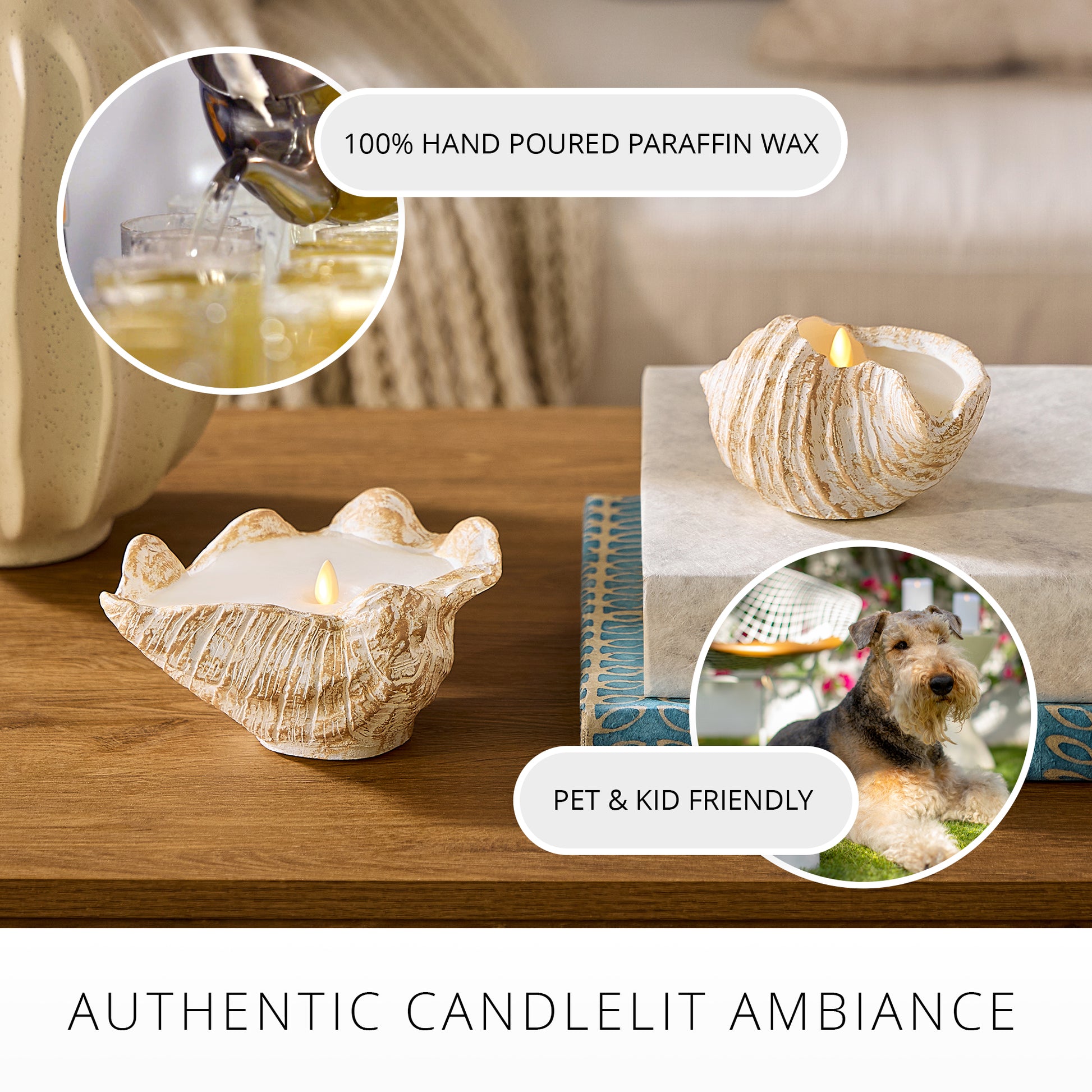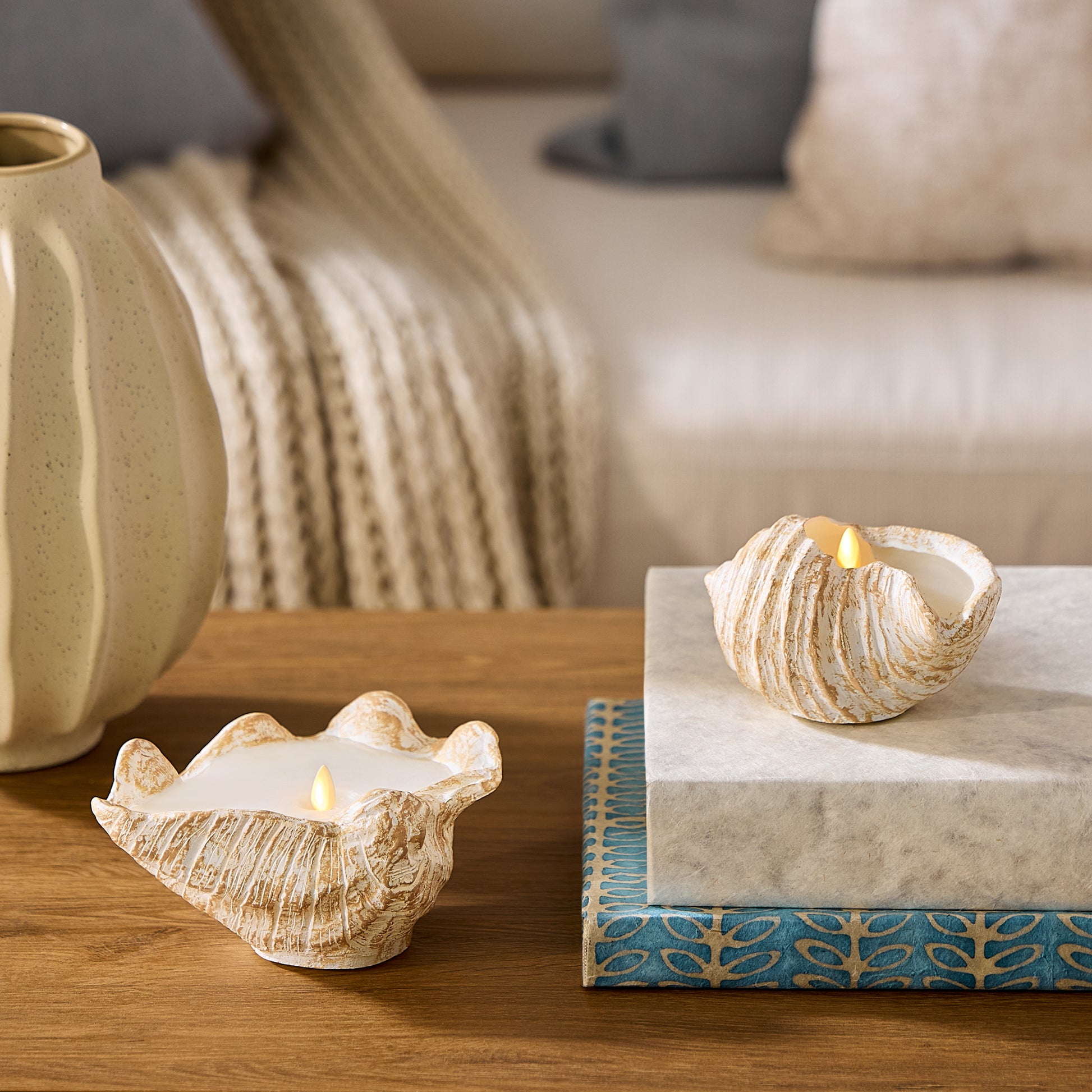 Our White Flameless Candle Tun Shell is designed to radiate with luxe seaside ambiance. Each candle is made with hand-poured premium wax and is uniquely painted to look exceptionally real as it glows with authentic moving-flame technology. The neutral tone of the Flameless Candle Tun Shell makes it a soothing lighting accent that brings the ocean indoors. Use the Tun Shell to elevate a coffee table with a coastal twist or pair it with the Luminara Clamshell for the ultimate beachside candlelight aesthetic.Technical Specifications