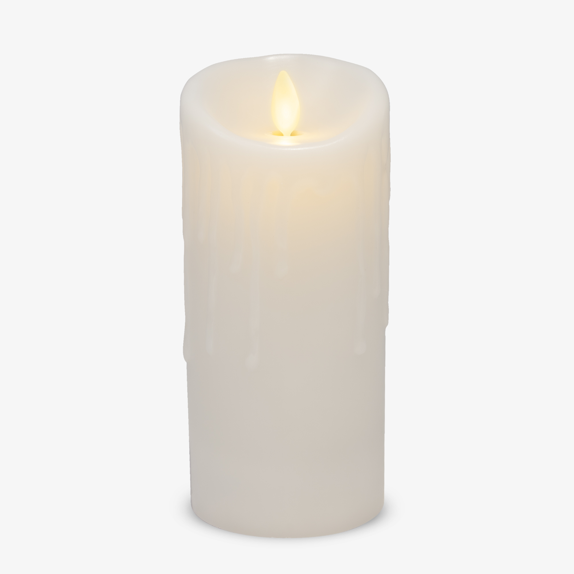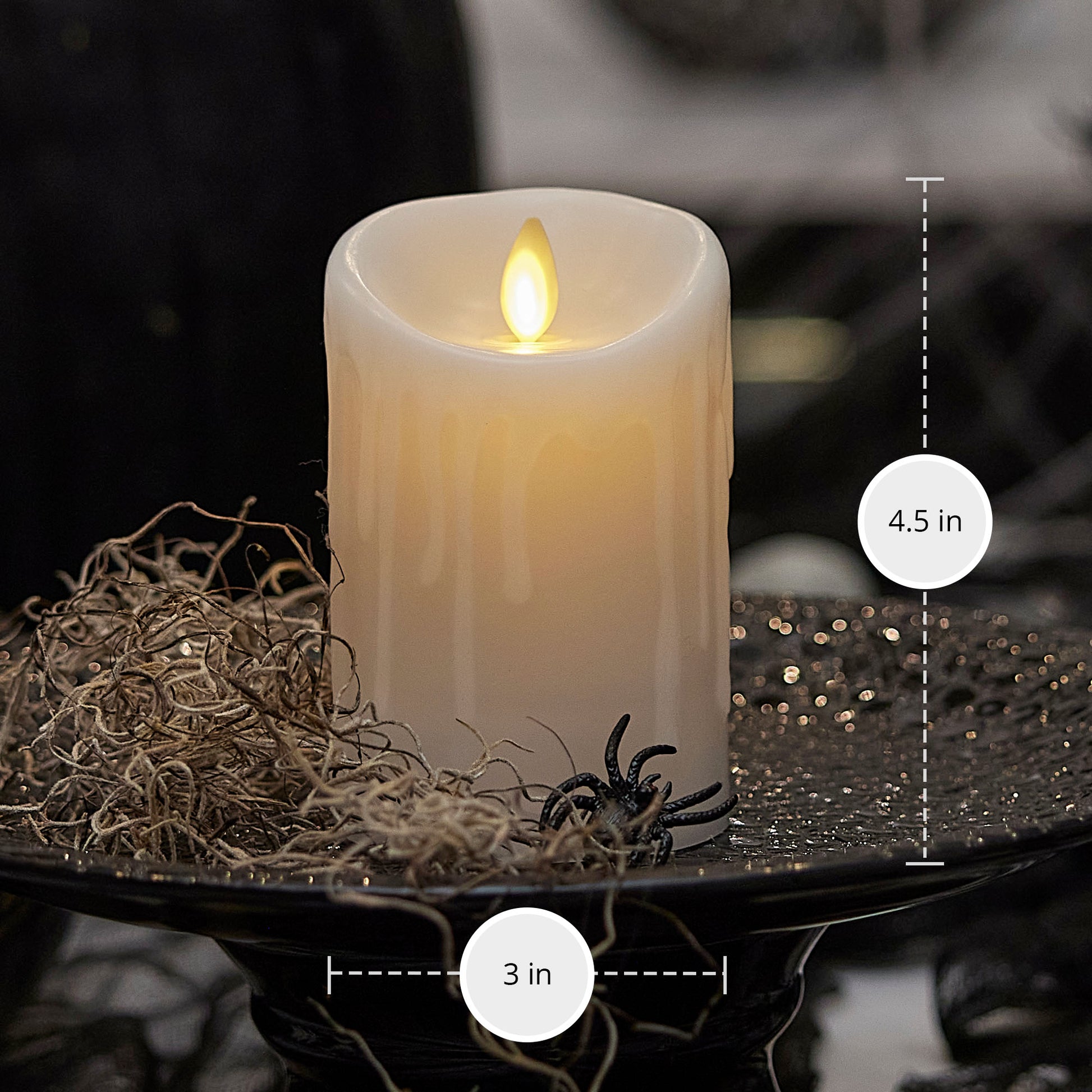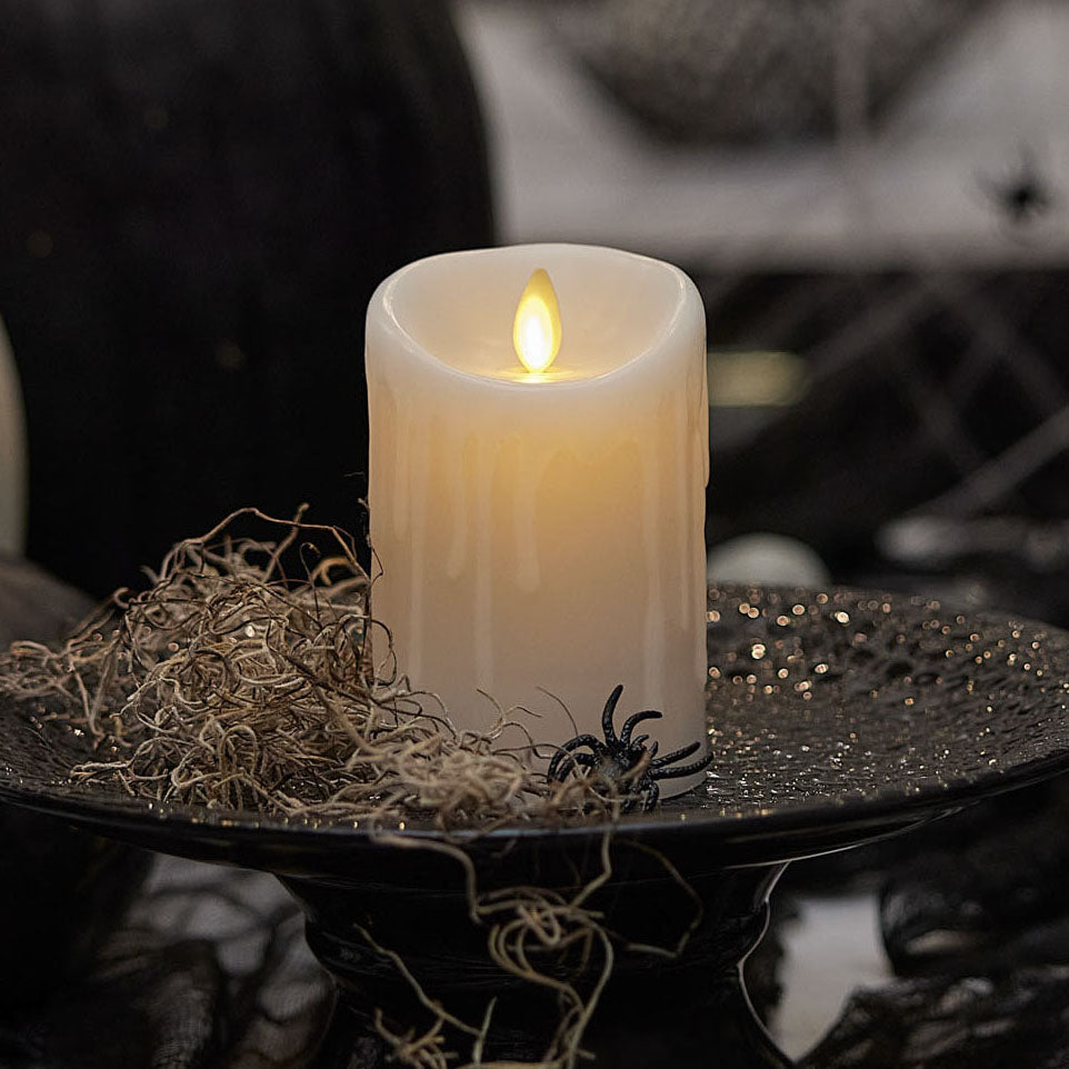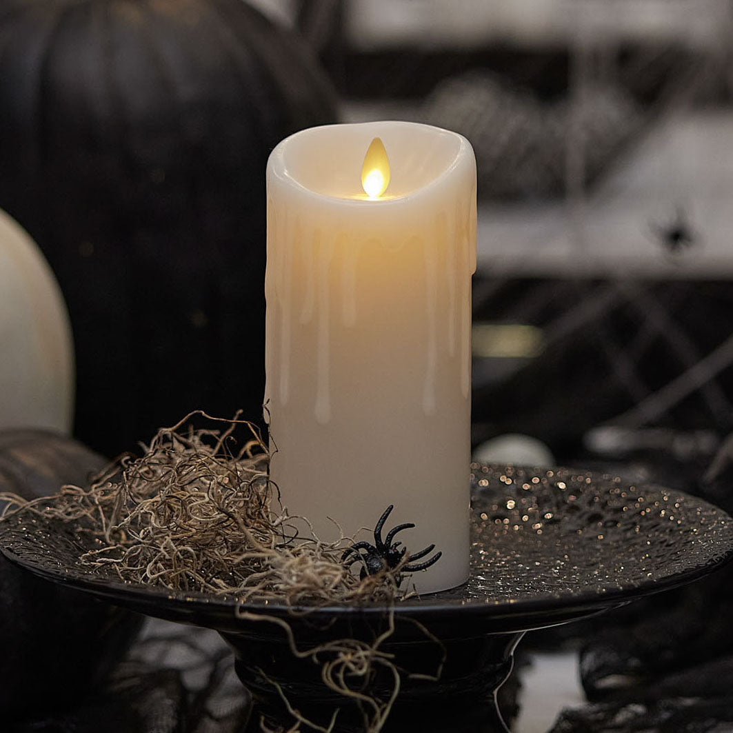 Create a haunted candlelight aesthetic this Halloween with our White Wax Drip Flameless Candle Pillar. Featuring a scalloped top for added realism, this pillar was designed with thin drips of melted wax flowing down its sides for a real burning wax effect without the worry of harmful flames.